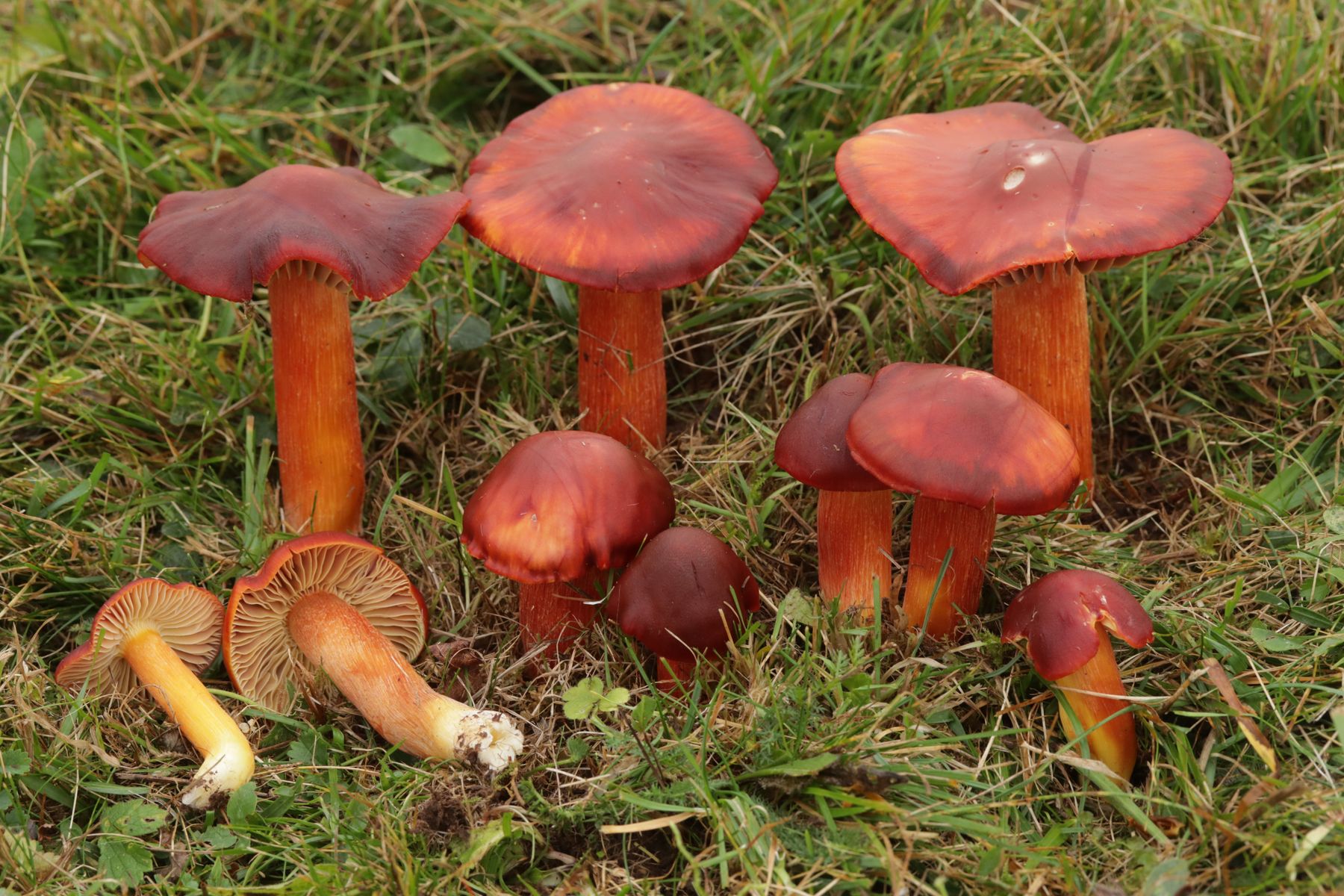 2. Hier denkt man von Ferne erstmal: Wer hat denn da Äpfel auf die Saftlingswiese gekippt? Bei näherer Betrachtung stellt man dann aber fest, daß man in der Punicea-Oase gelandet ist! Hygrocybe punicea als Traumkollektion.