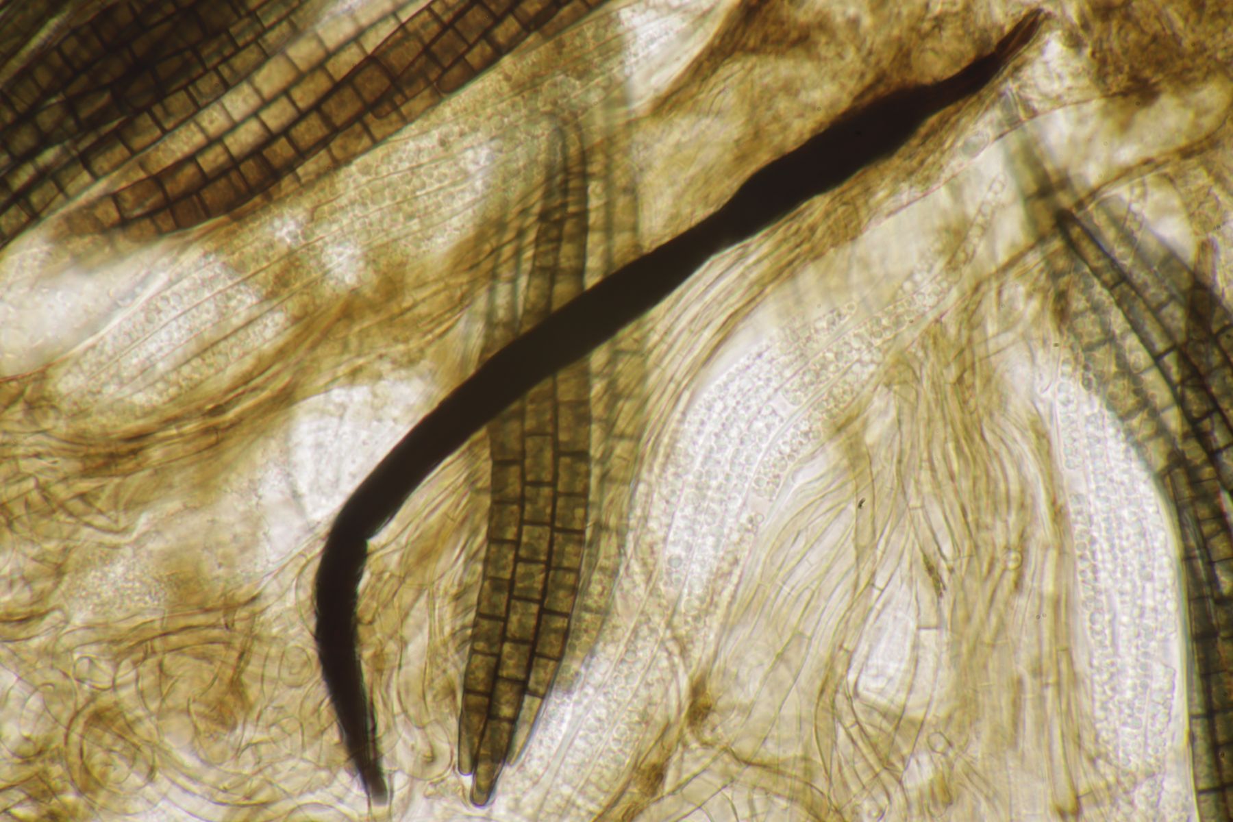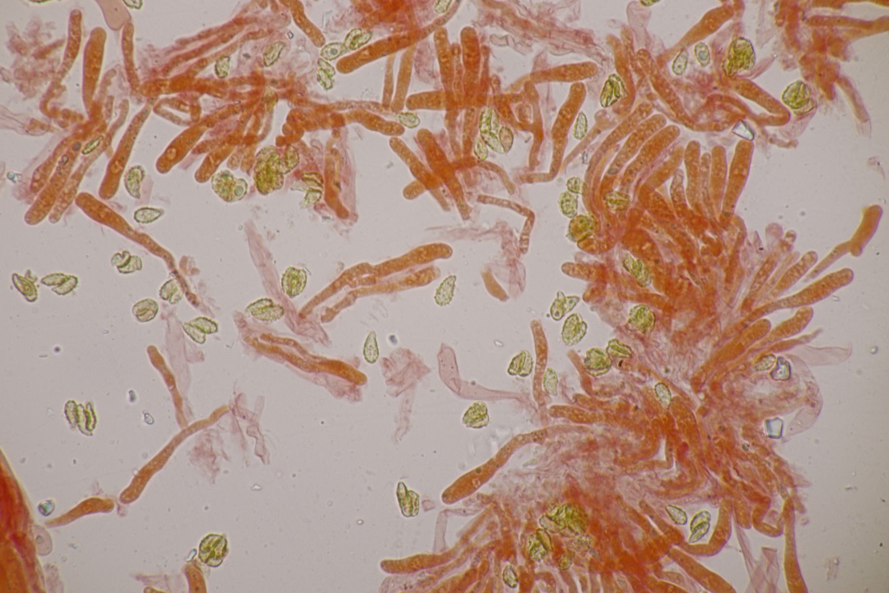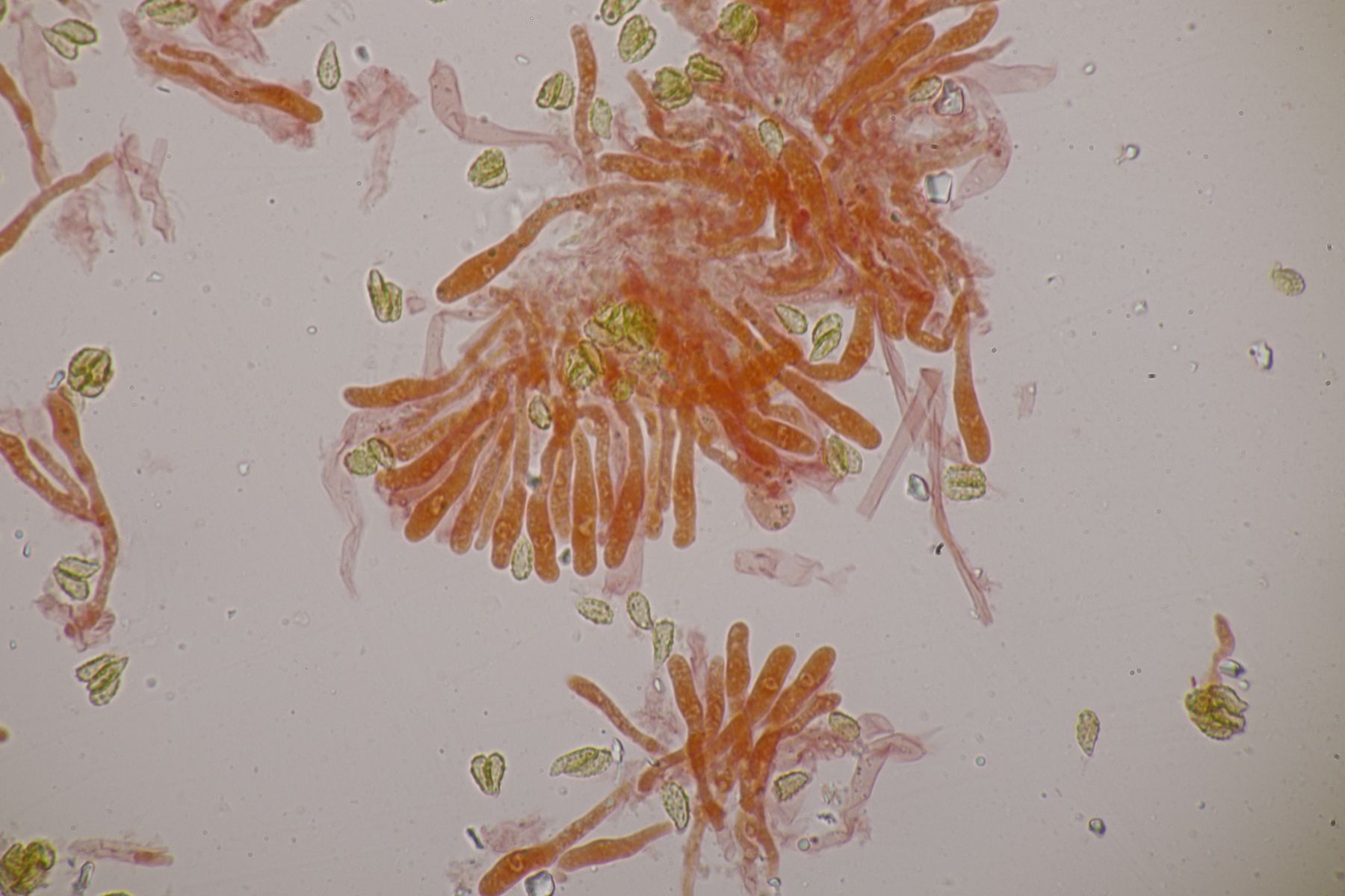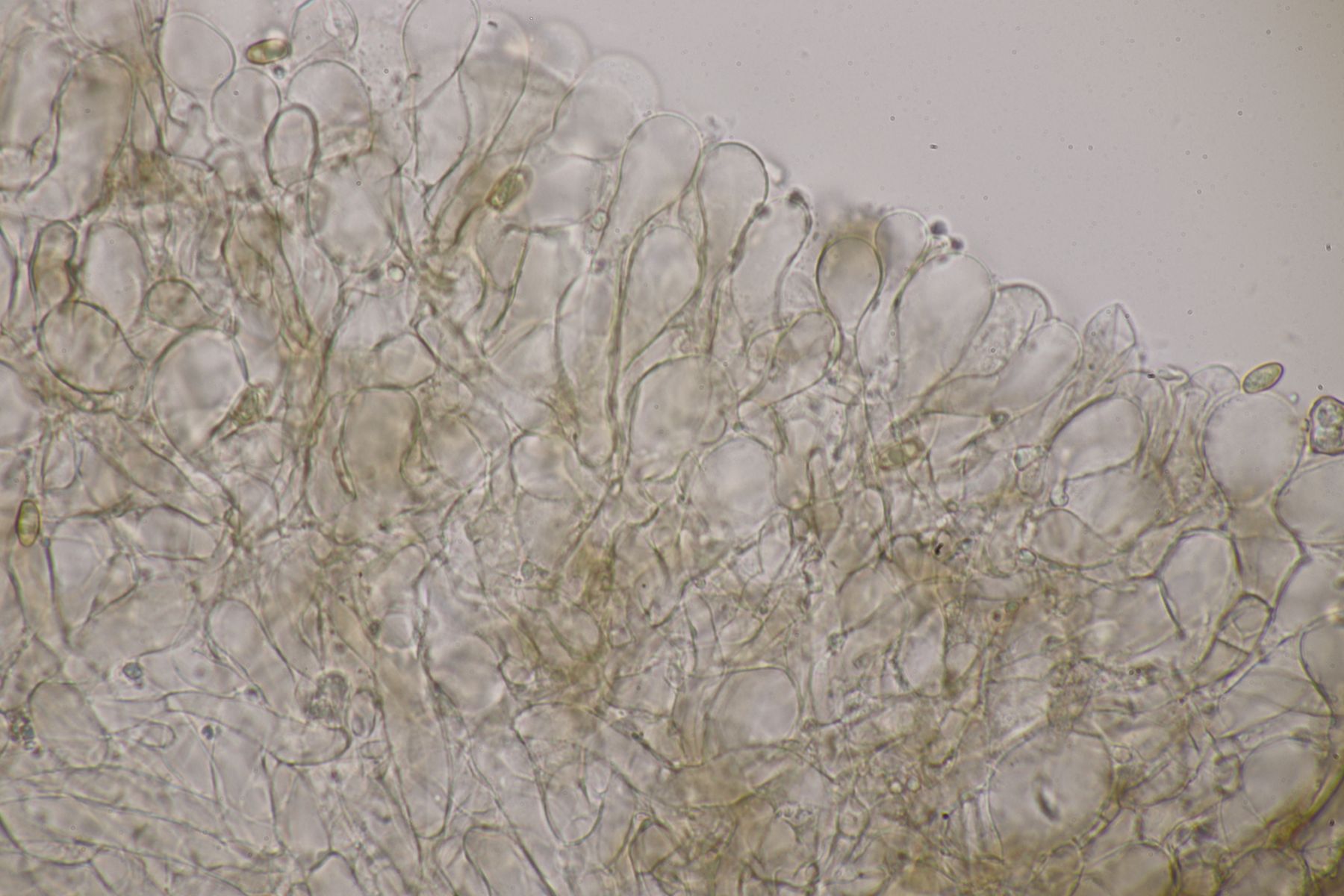 Was die Form der Huthautzellen in der Hutmitte angeht, sind meiner Meinung nach H. tenuicystidiatus und H. pallidus im Rennen (H. foetens paßt ja schon rein makroskopisch von der Farbe her nicht). Ich werde da morgen Abend noch mal genauer reinmikroskopieren, aber die wenigen Huthautzellen, die ich auf meinen Bildern gut vermessen konnte, liegen bei 42.9 x 15.8 µm, 43.6 x 15.5 µm, 41.5 x 13.0 µm, 42.8 µm x 17.2 µm, 36.6 x 10.2 µm. Hier würde ich eine leichte Tendenz zu H. tenuicystidatus erkennen wollen, insbesondere auch was die Form angeht. In den Zeichnungen sieht man bei dieser Art einige Zellen, die taillenartig eingeschnürt sind und so etwas gibt es bei meinem Fund auch.