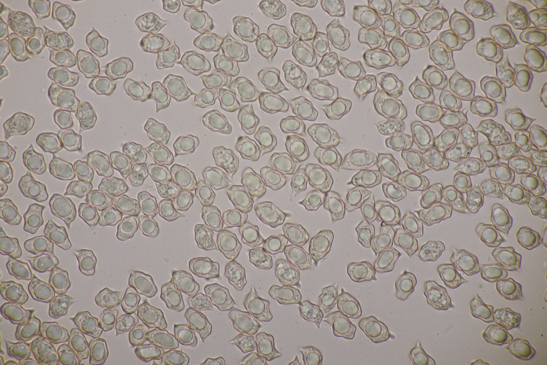 14. Hier hatten wir im Feld erst an eine Lepista gedacht. Dann fiel uns aber auf, daß alle Fruchtkörper einen auffälligen Buckel hatten. Ein schneller Blick durchs Mikroskop zeigte dann klar: Infundibulicybe geotropa