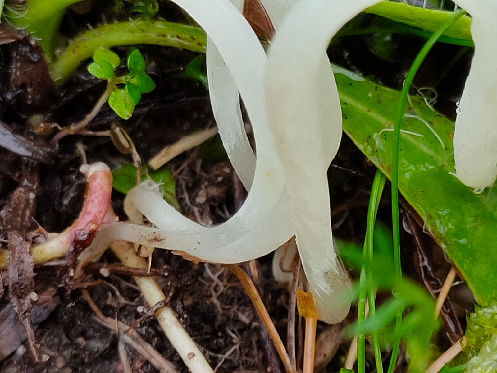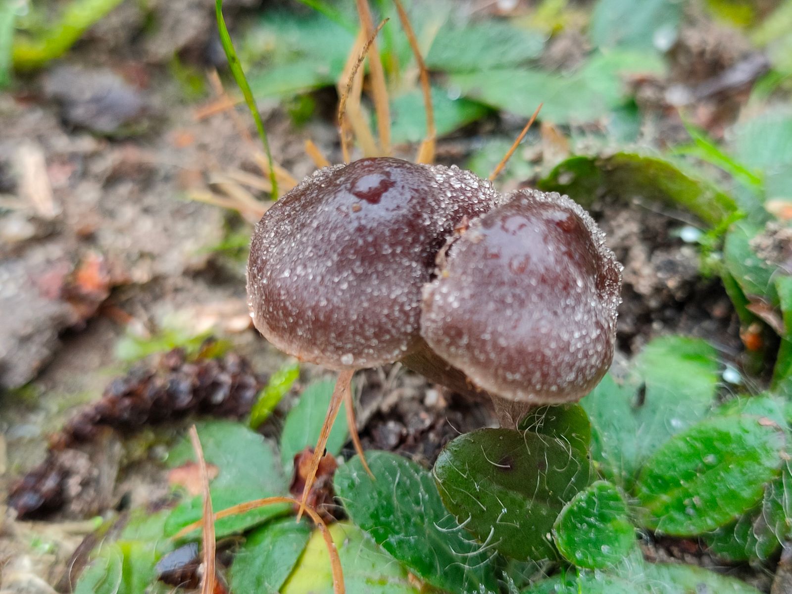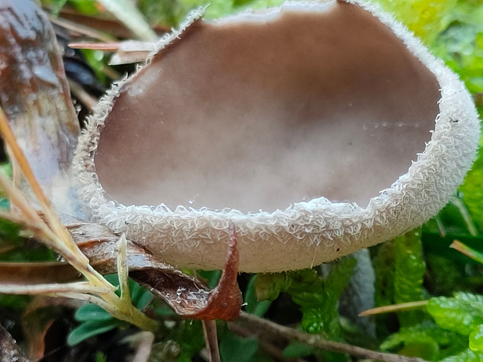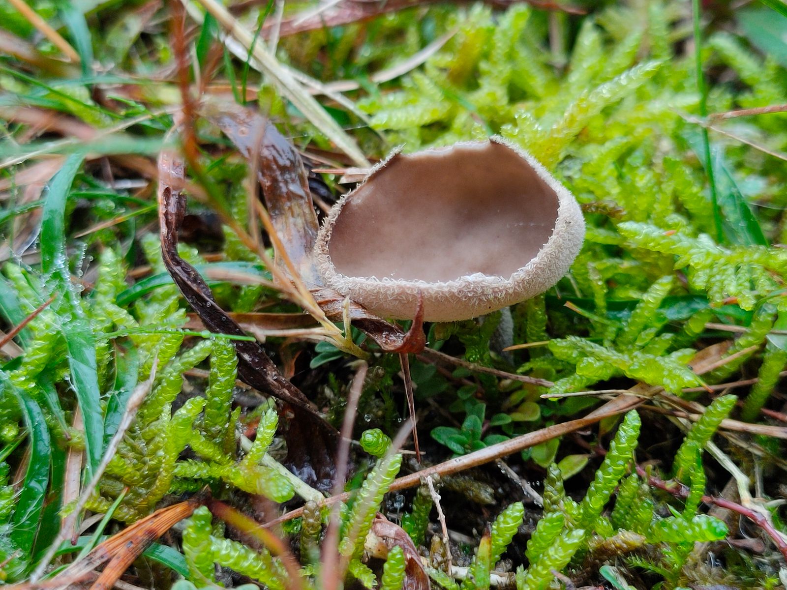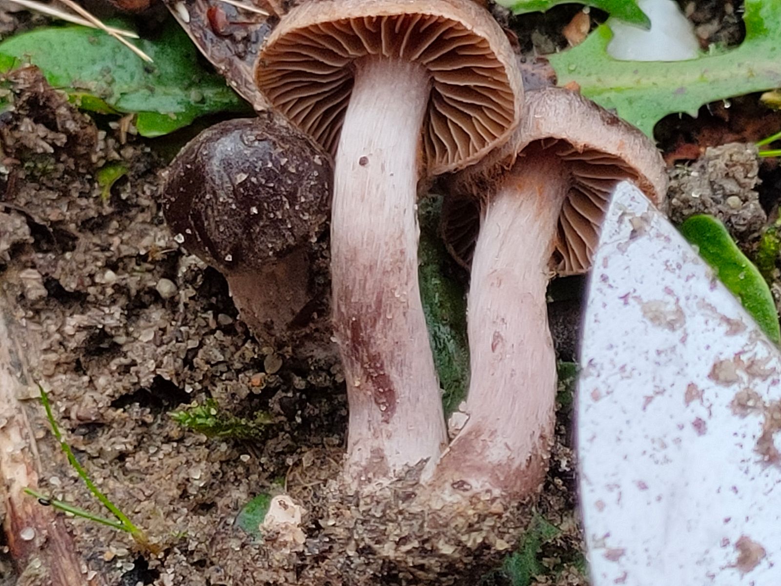 5. Cortinarius: Ein sehr kleiner junger Cortinarius mit schwarzem Hut (ca 1 cm) direkt in der Nachbarschaft der Helvella.