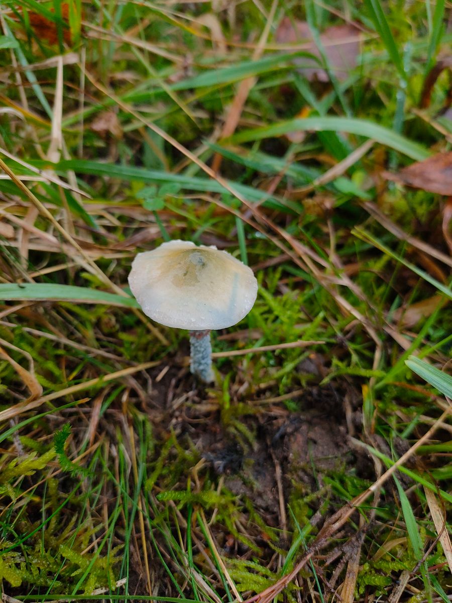 8. Stropharia: Der Fund des Tages, ein wünderschöner FK mit weißem Hut der feucht glitschig ist und zum blauen neigt. Ich schaue vorsichtig