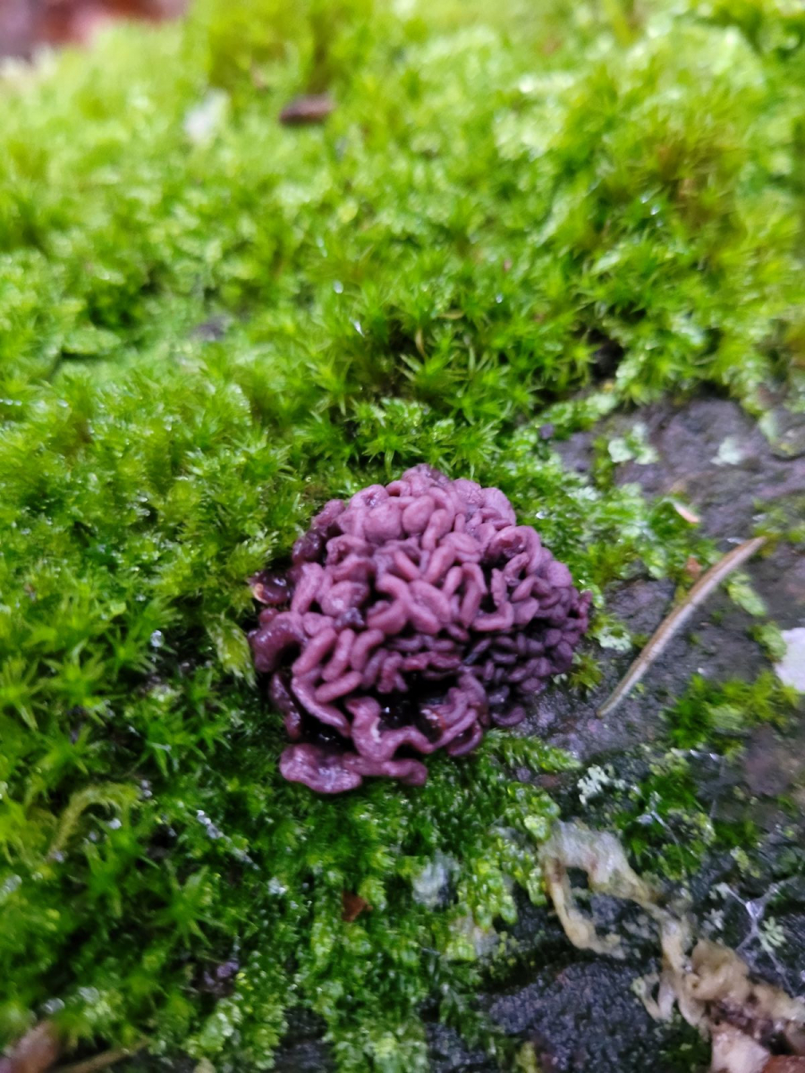 Heute ist mir auf einer umgestürzten Buche ein kleiner, gallertiger lila Pilz aufgefallen.