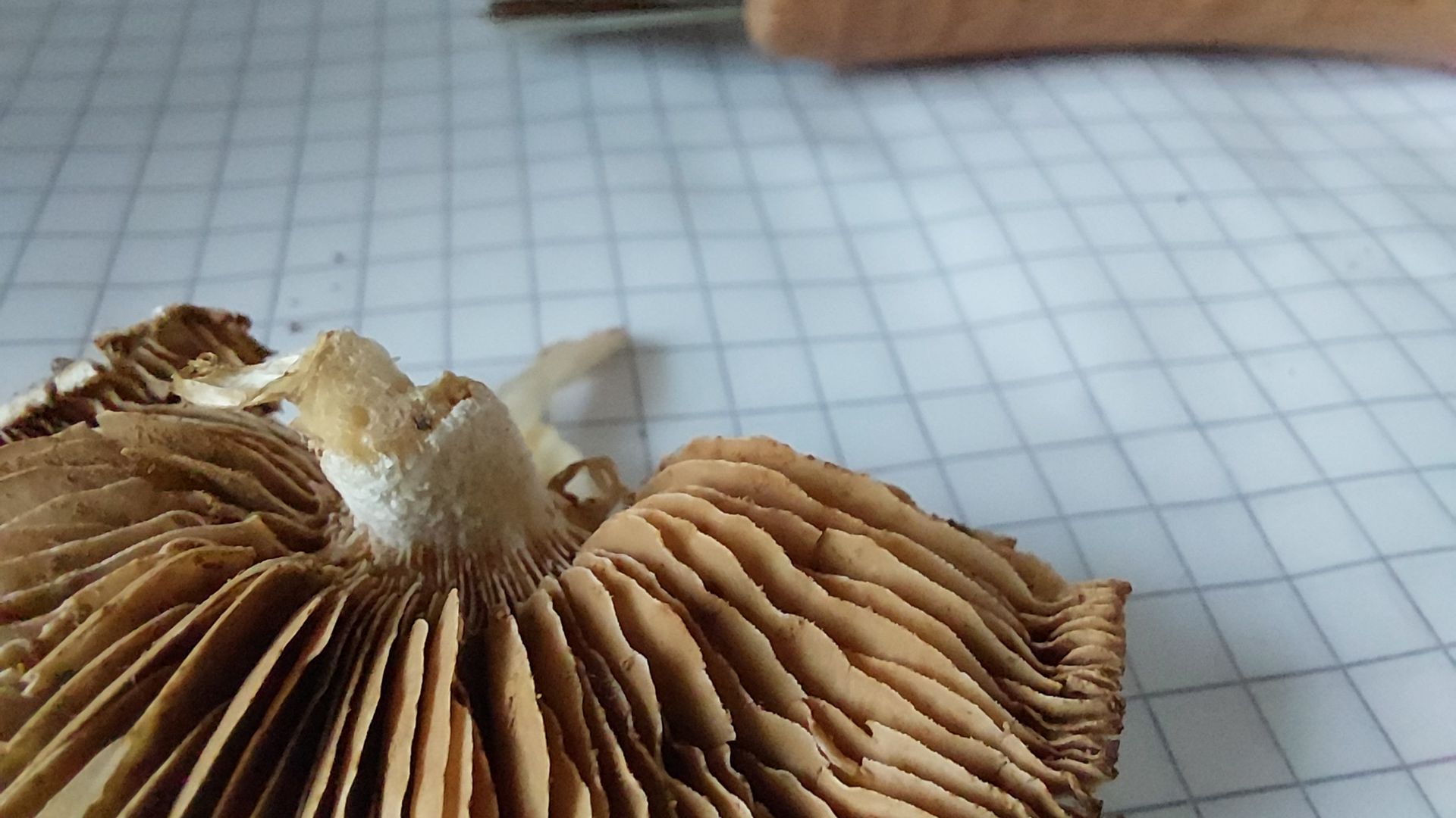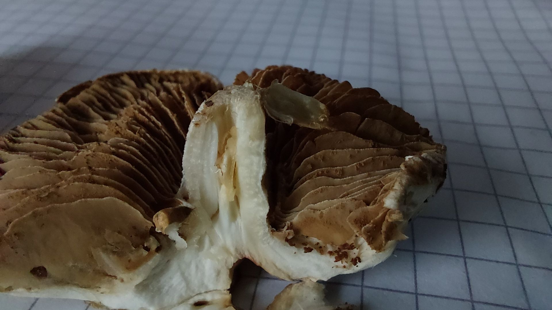 Lamellen milchkaffeebraun, nicht tränend, ausgebuchtet, untermischt, Schneiden weiß