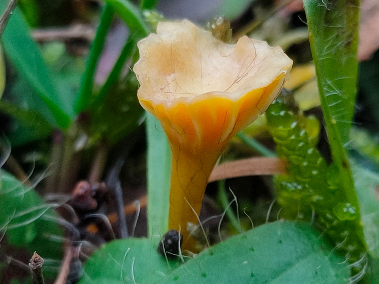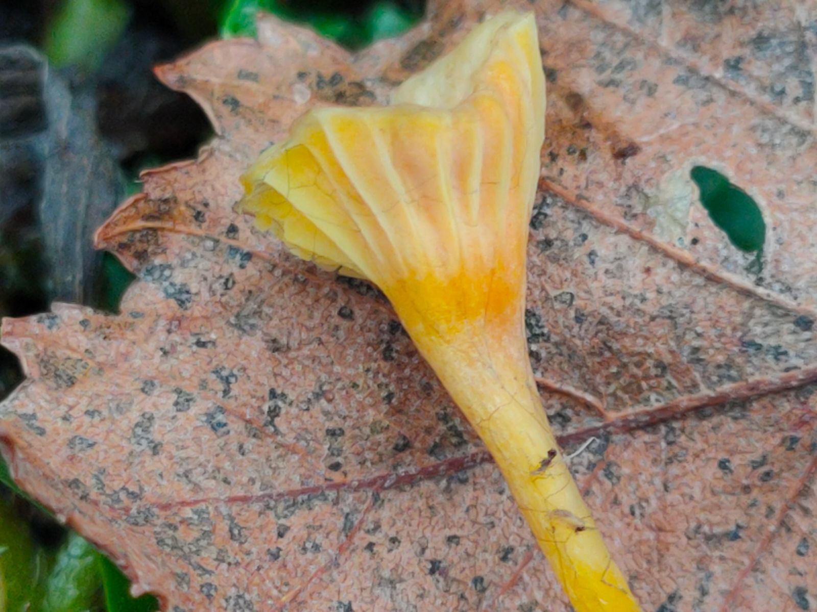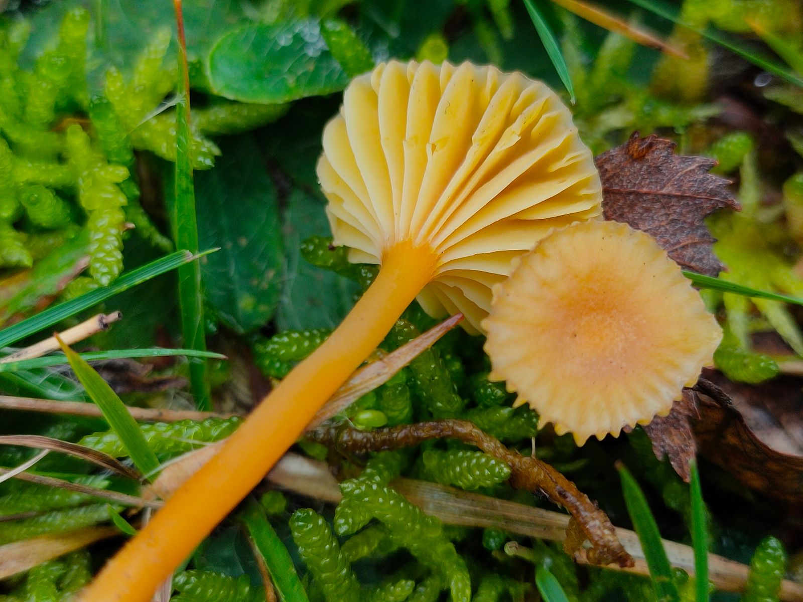 2. Gelbe Hygrocybe: Ein kleiner gelber Saftling mit herablaufenden Lamellen. Ich gehe von einem jungen trichterformigen