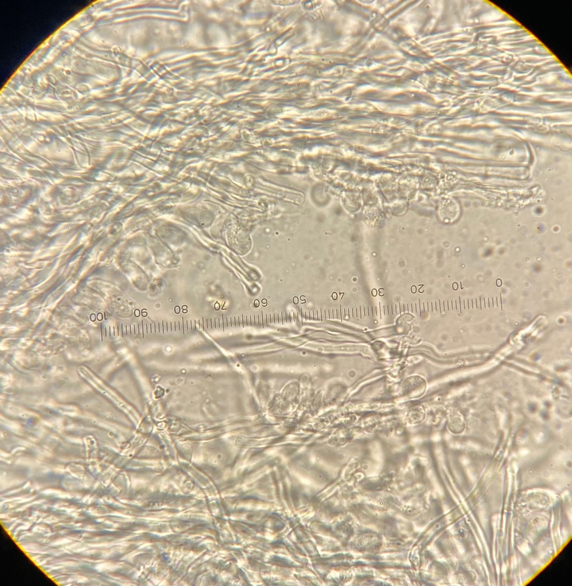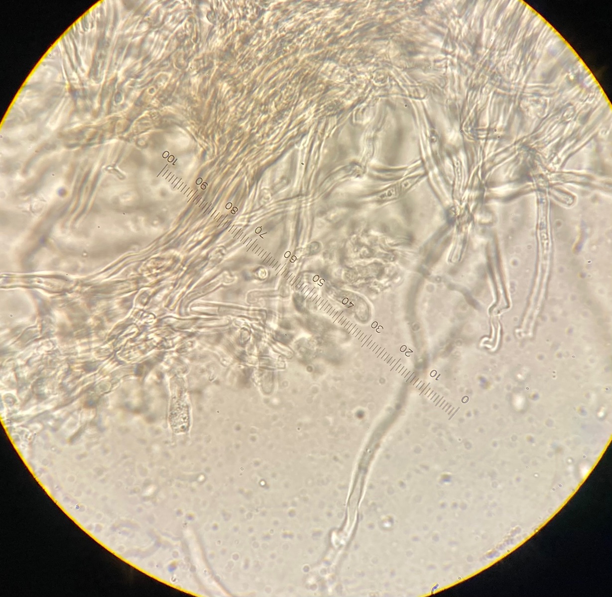 gestern hab ich im Südburgenland (pannonisches Klima) einen mir unbekannten Porling an einem Ulmenstumpf gefunden. Er hatte einen auffallend angenehmen Geruch, der nach einem Tag im Kühlschrank Richtung würzig geht. Irgendwie erinnert er mich an Postia balsamea, aber der soll an Nadelholz wachsen. Ich hab ihn mikroskopiert und die Sporenmaße ermittelt: 5x2,5-3; Schnallen vorhanden.