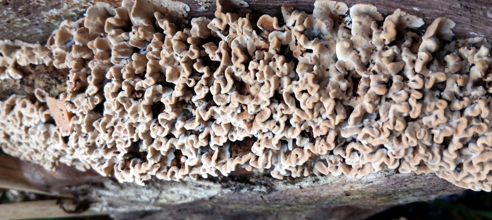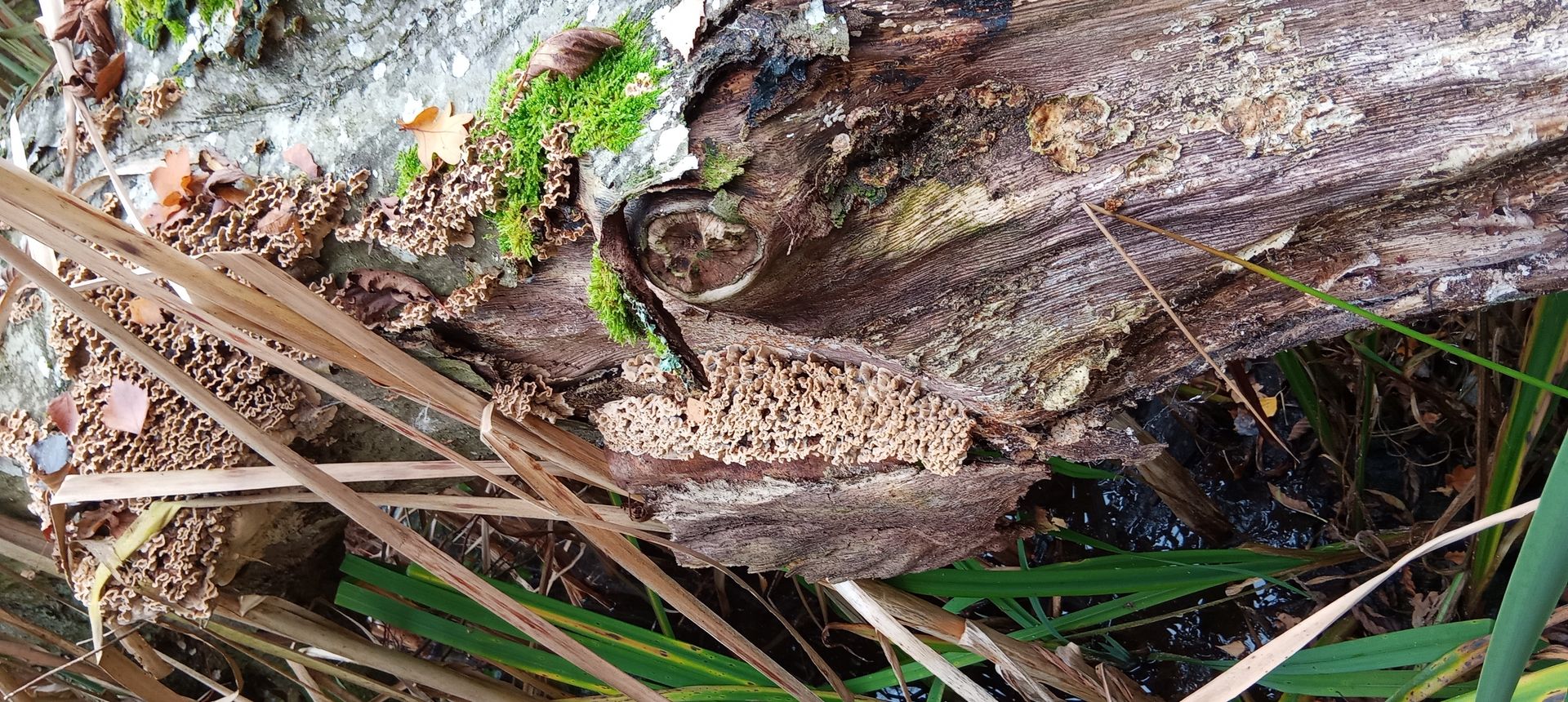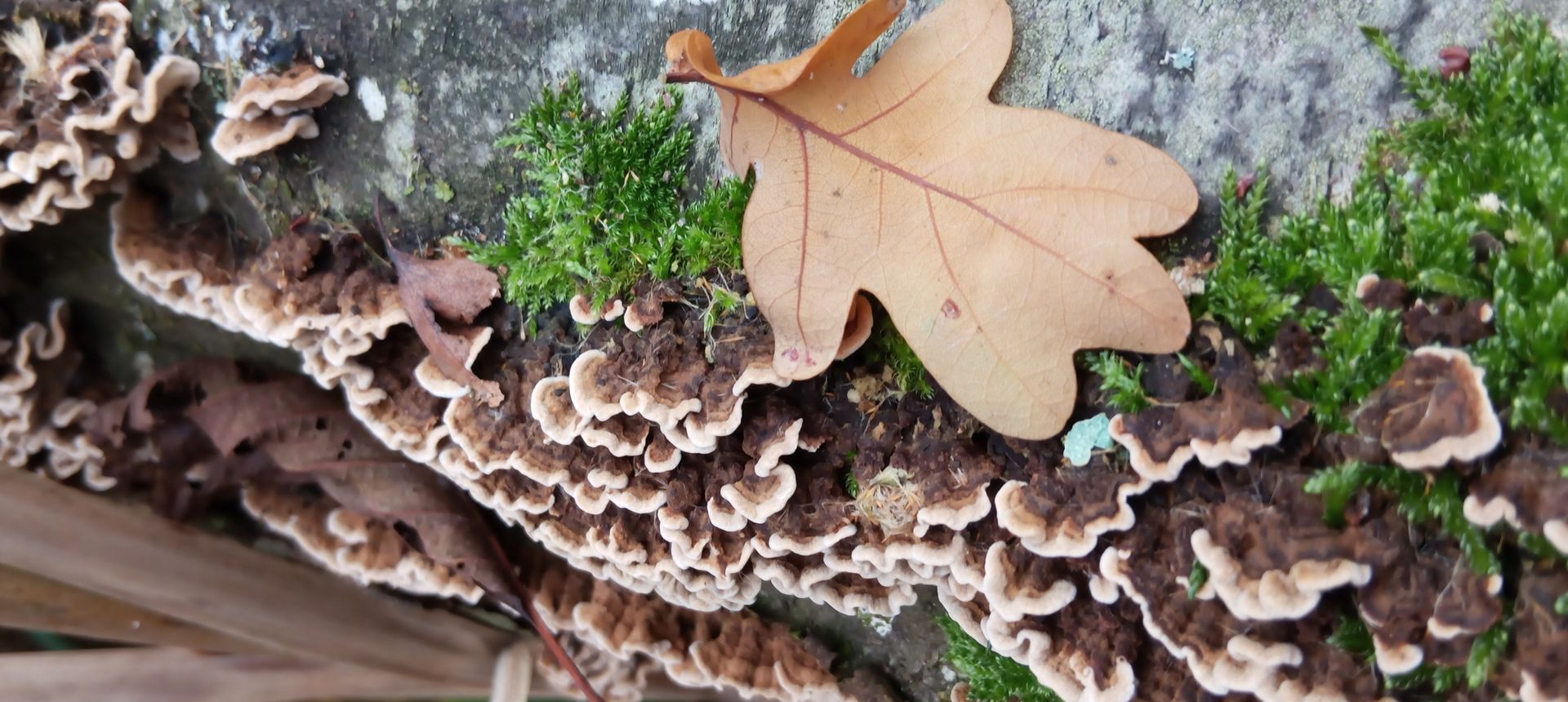 Heute ein Schichtpilz in einem Kurpark, an einem toten Laubbaum, der in einen Teich gekippt ist. Die Fruchtkörper waren alle gleich groß und wellig. Oben total braun und minimal samtig.