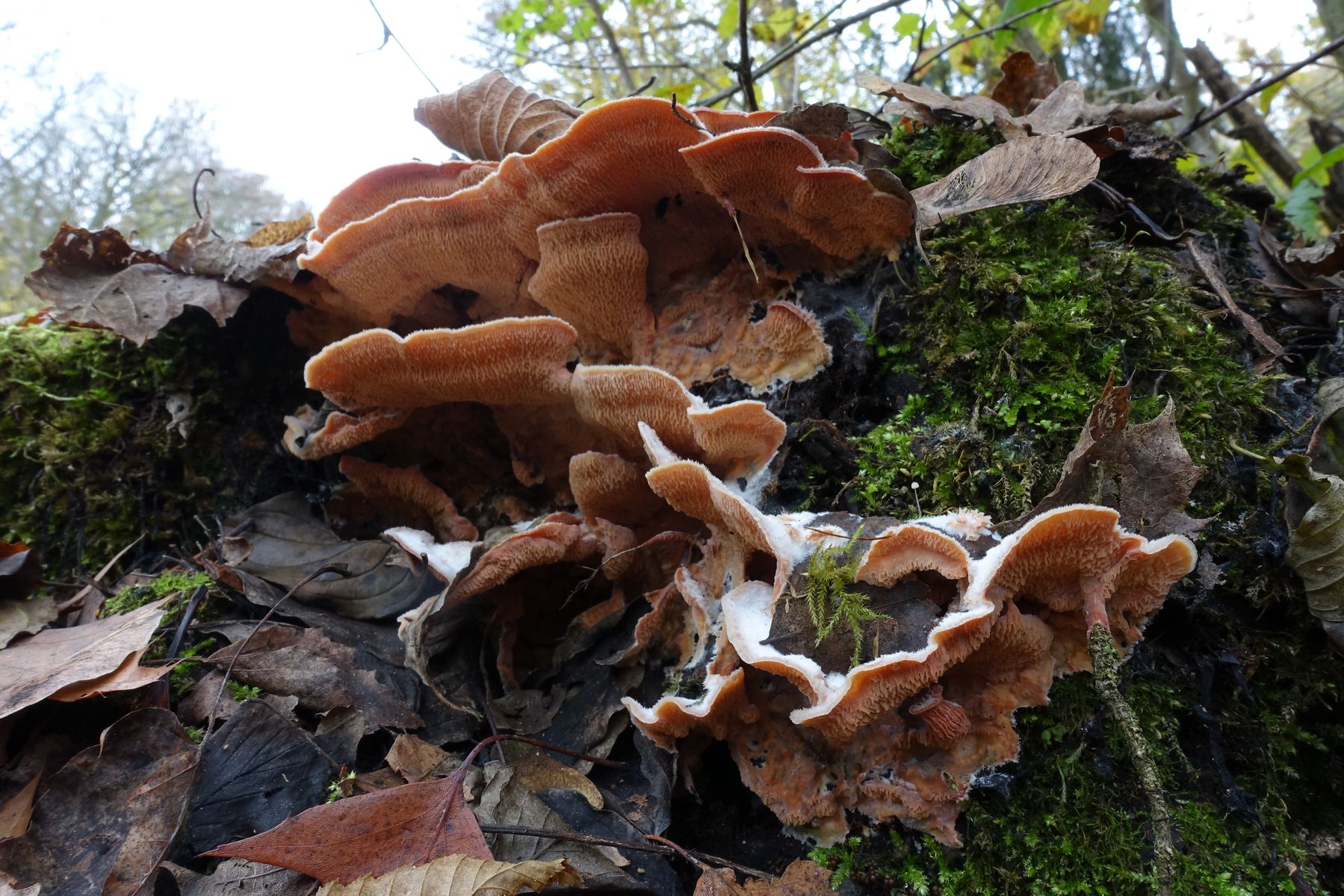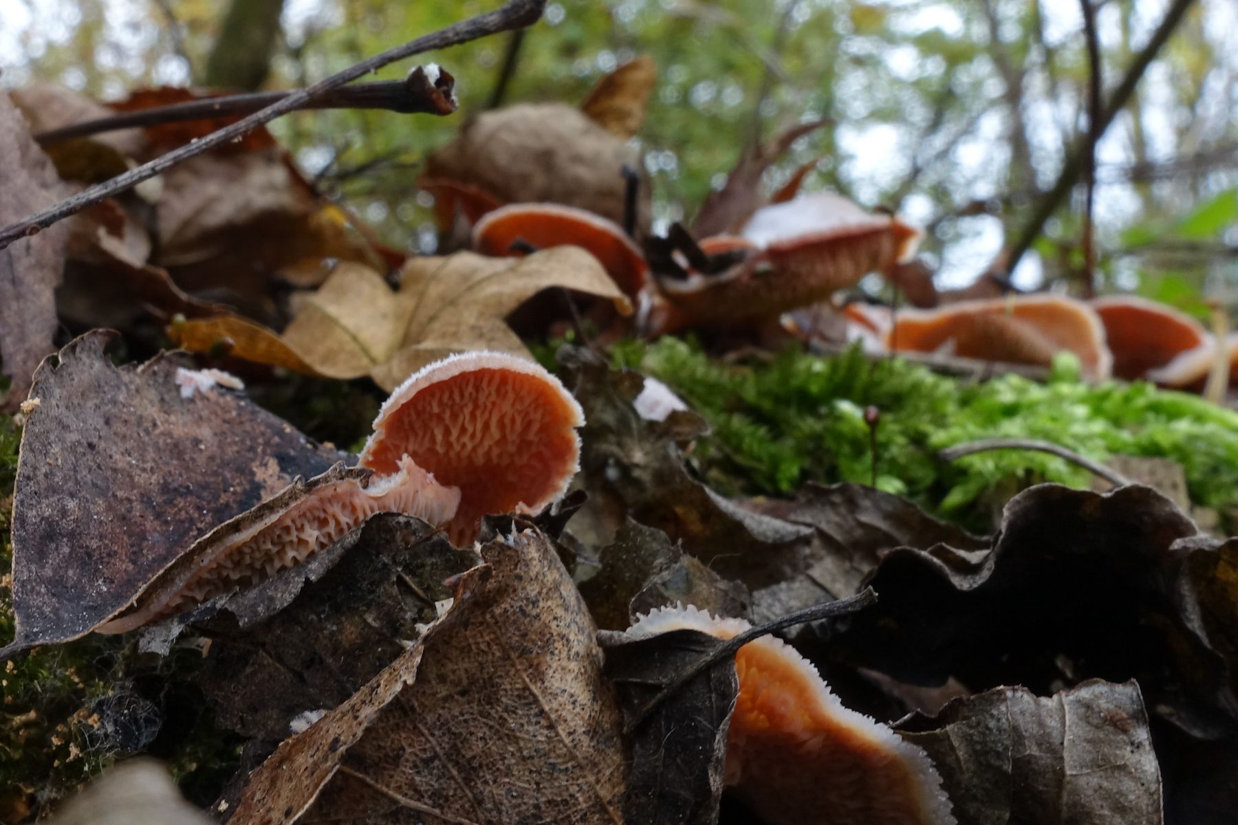 Die FKs frisch wirkend, nicht eingetrocknet oder holzartig verhärtet. Elastisch, als gallertartig wahrnehmbar, jedoch zäher, als man unter gallertartig verstehen möchte. Neben den großen FKs auch kleinere frische „Babies“ auf de Baumstumpf.