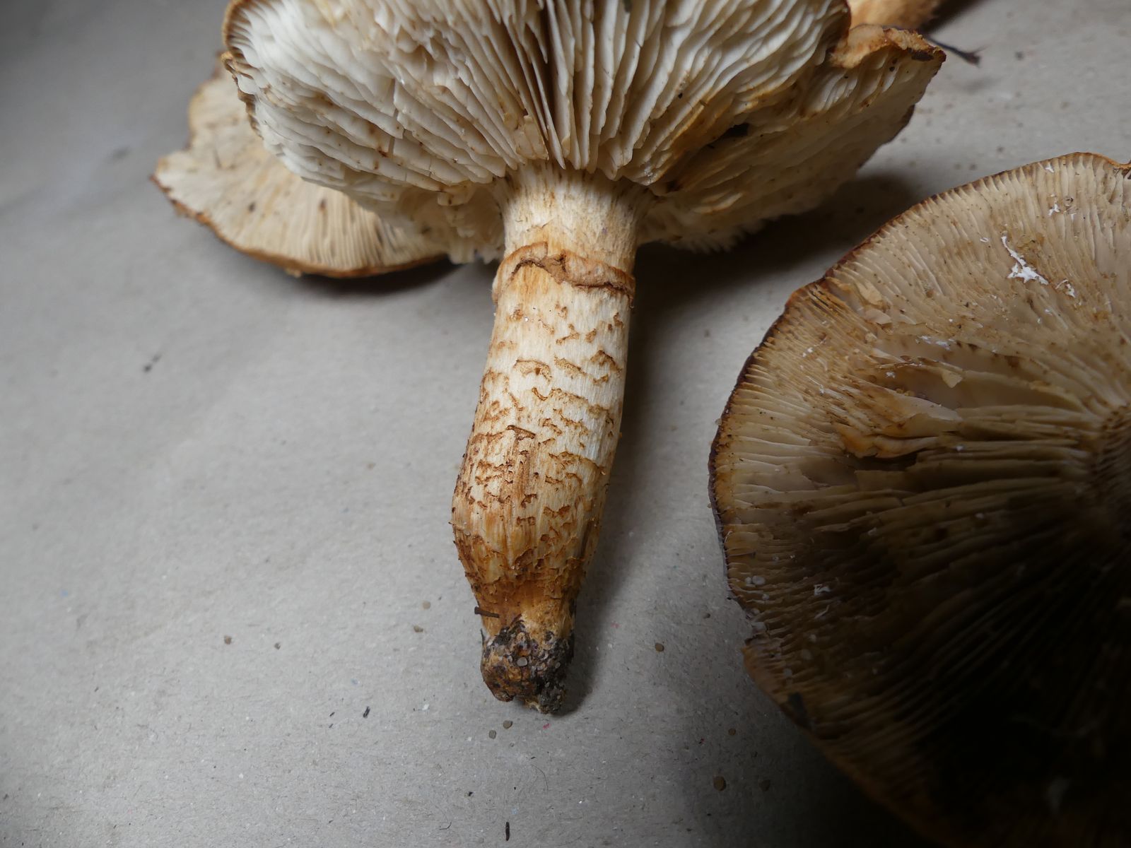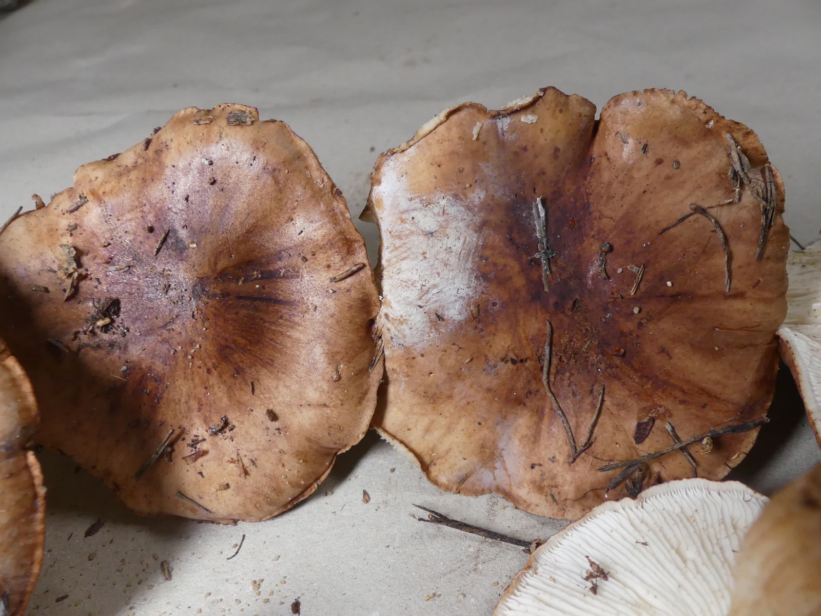 gestern war ich im sandig-sauren Kiefernwald unterwegs und habe zwei braune Ritterlinge eingesammelt. Der ersten Kollektion mit Ringzone habe ich deshalb den vorläufigen Arbeitstitel "Fastberingter Ritterling " gegeben, auch wenn der laut Gminder/Karasch auf Kalkböden vorkommen soll und die Hutoberfläche anders aussieht. Gibt es eine besser passende Art, die ich übersehen habe? Krokodil-Ritterling soll in nährstoffarmen Flechten-Kiefernwäldern vorkommen, das würde wesentlich besser passen. Zu schön, um wahr zu sein.