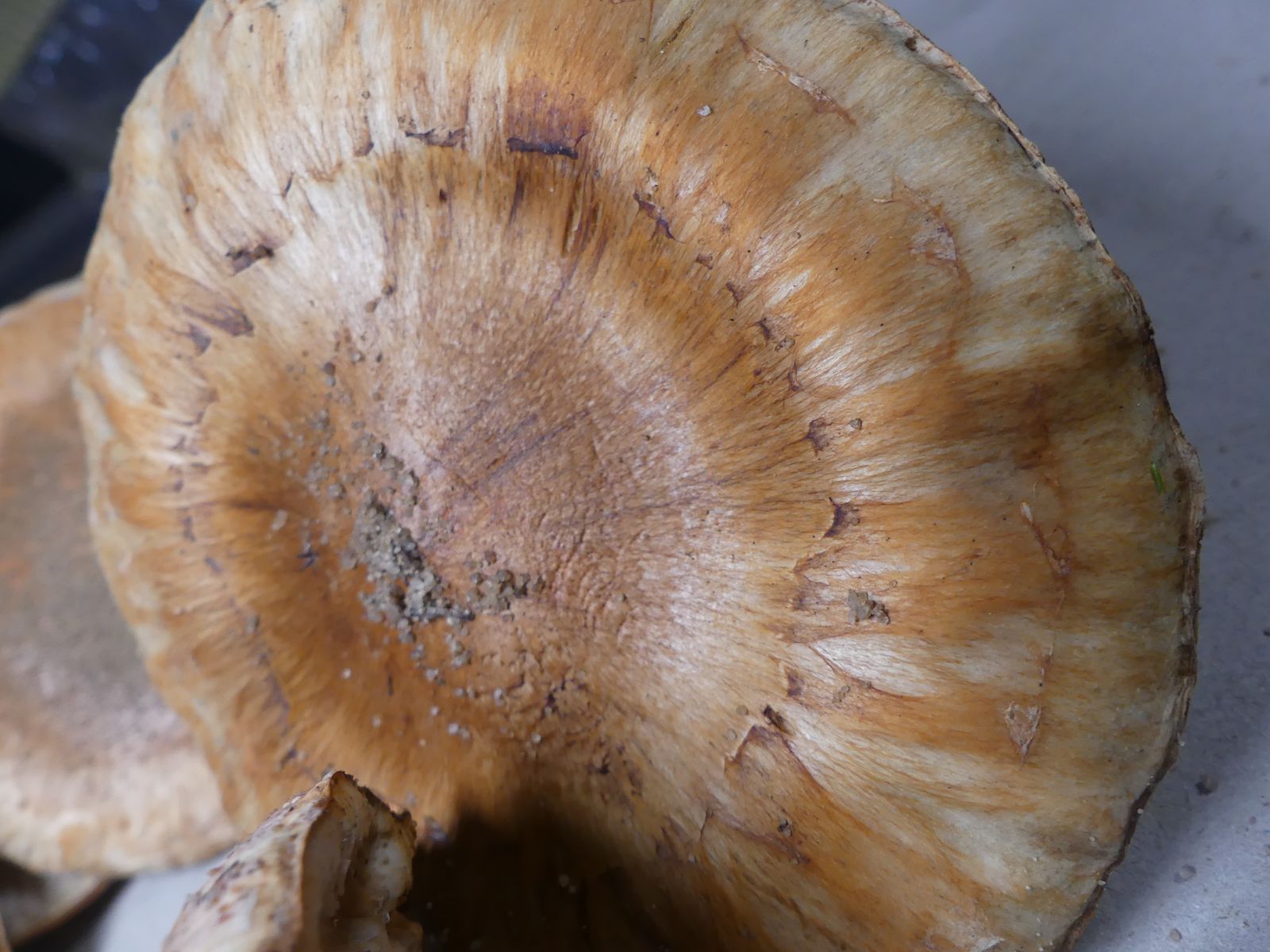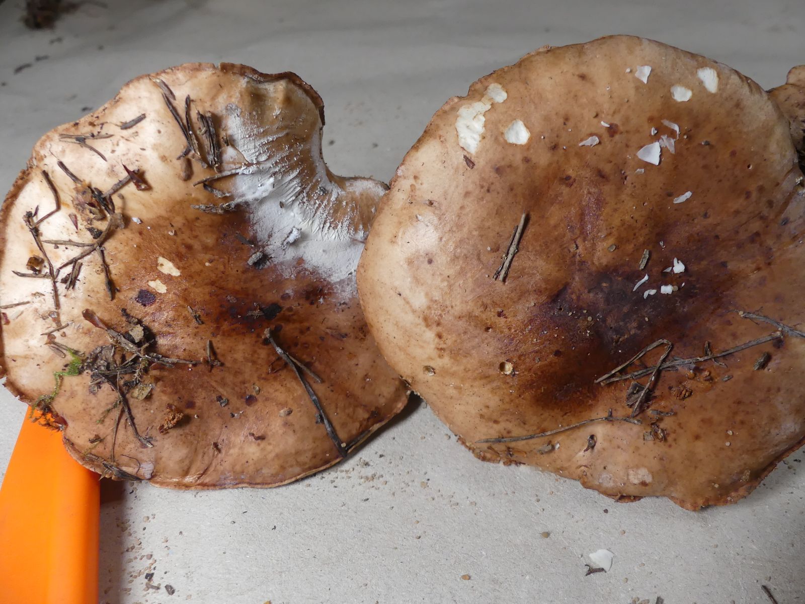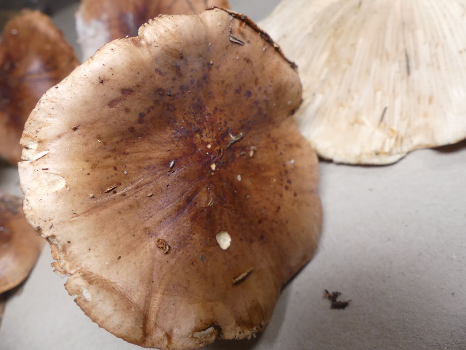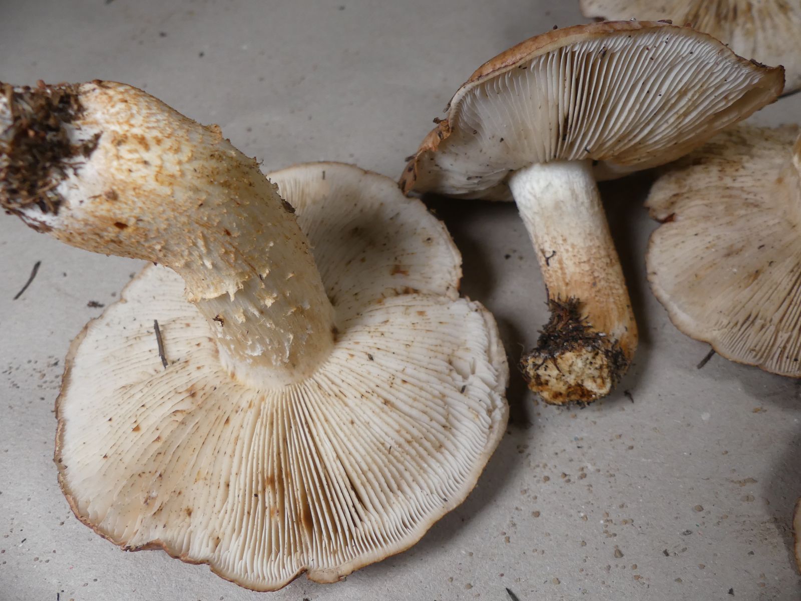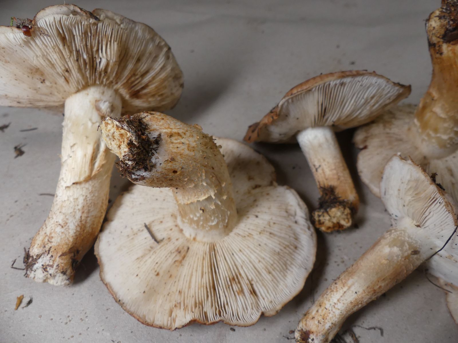 Die zweite Kollektion hat auch einen schwach mehlartigen Geruch, einen deutlich mehligen Geschmack und kommt ohne Ringzone und mit weniger strukturierter Hutoberfläche daher. Neben dem weißbraunen Ritterling T. albobrunneum soll es ja noch weitere sehr ähnliche Arten geben.