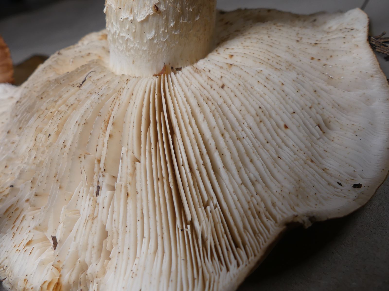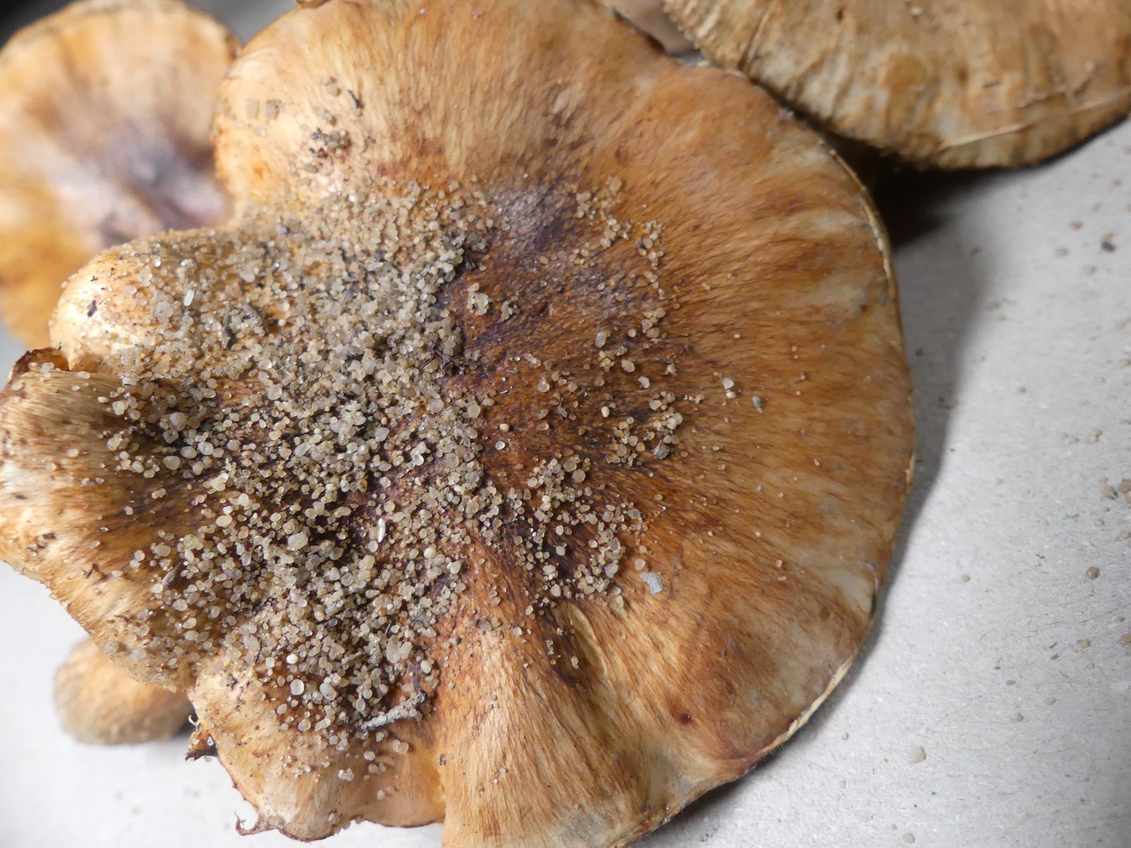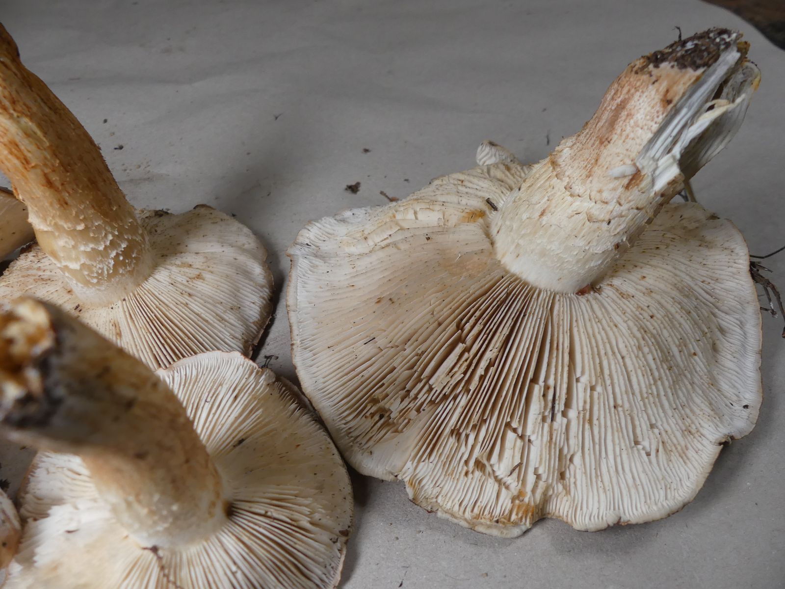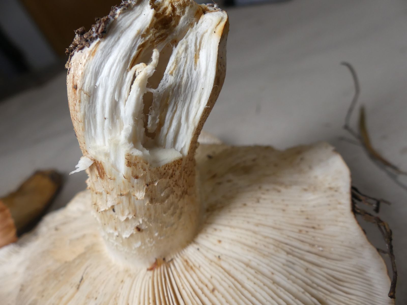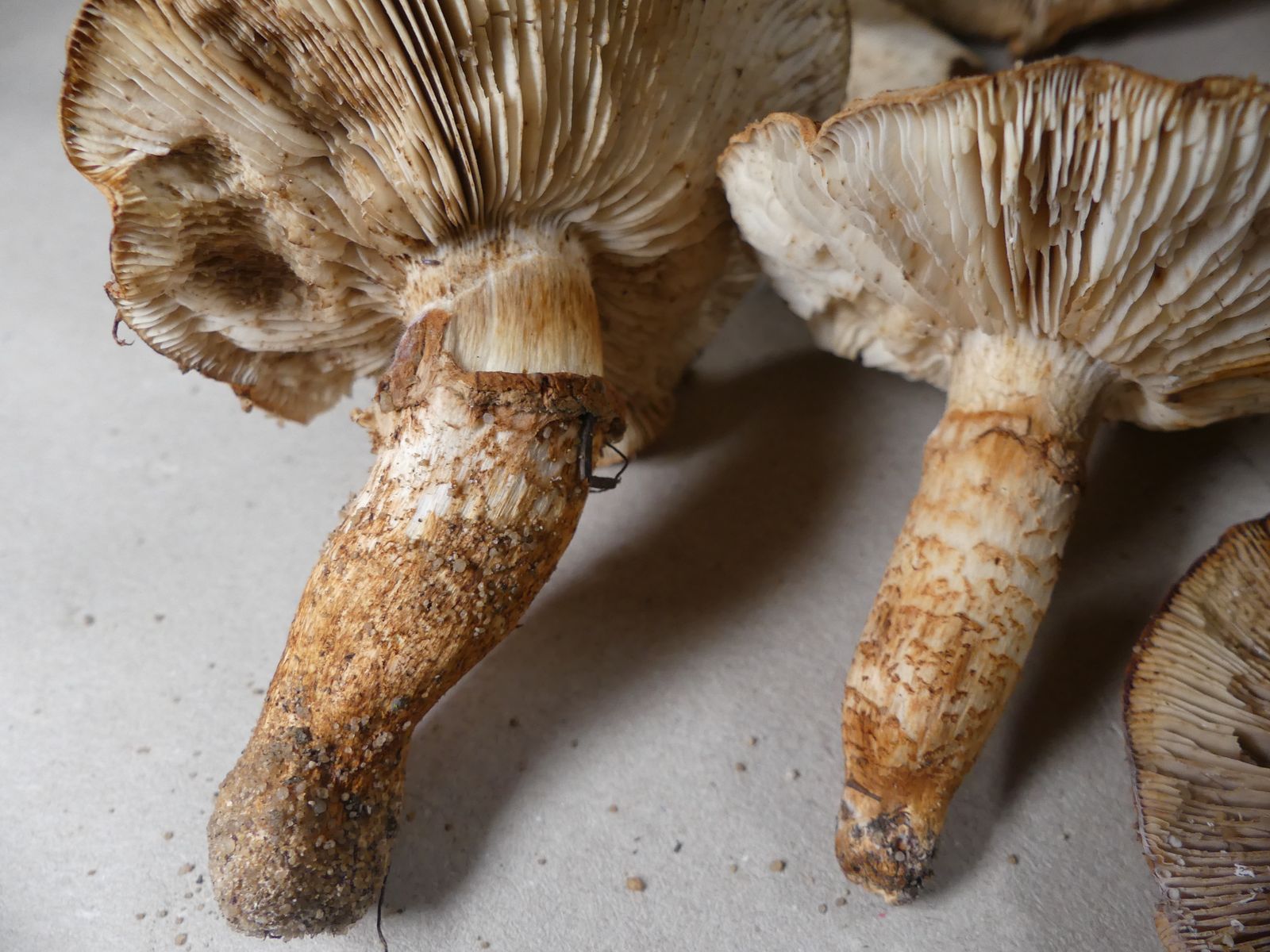 Die zweite Kollektion hat auch einen schwach mehlartigen Geruch, einen deutlich mehligen Geschmack und kommt ohne Ringzone und mit weniger strukturierter Hutoberfläche daher. Neben dem weißbraunen Ritterling T. albobrunneum soll es ja noch weitere sehr ähnliche Arten geben.