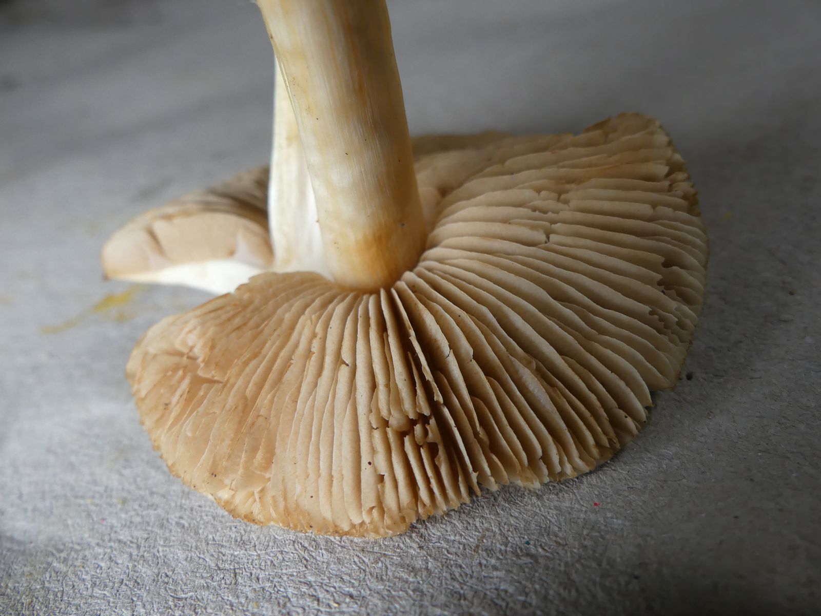 Eine Hebeloma habe ich mit so einer Lamellenfarbe noch nicht gesehen, aber vielleicht kommt beim Sporenabwurf doch ein "Mykologen-Rosa" heraus? An der Stielspitze sieht es fast so aus, as wäre das Sporenpulver rostorange? Den Sporenabwurf würde ich über Nacht versuchen, wenn man mir nicht schon vorher auf die Sprünge hilft ....