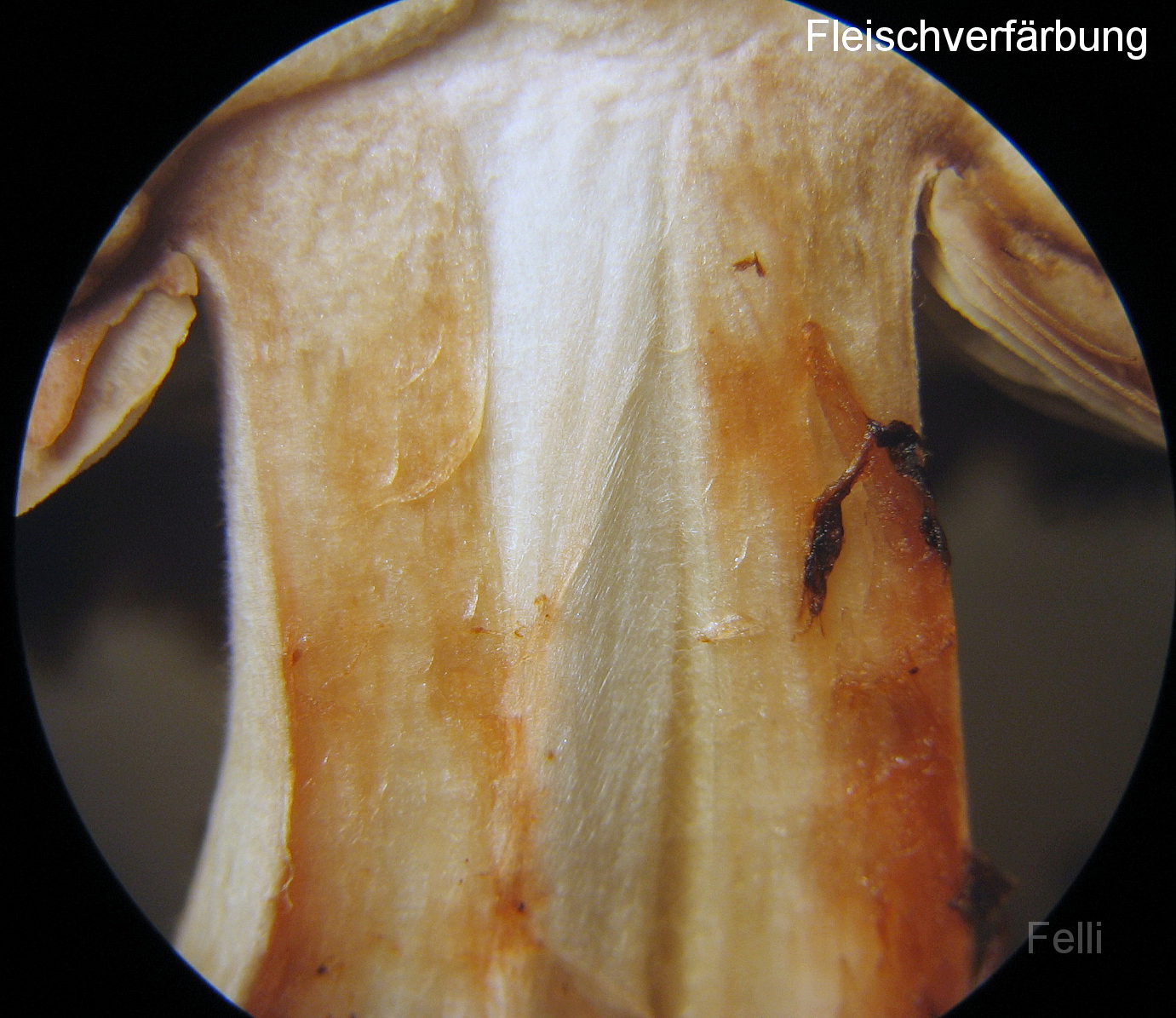 Im Stielschnitt schwach orange-rot. Zur Basis hin eher ganz schwach gelborange.