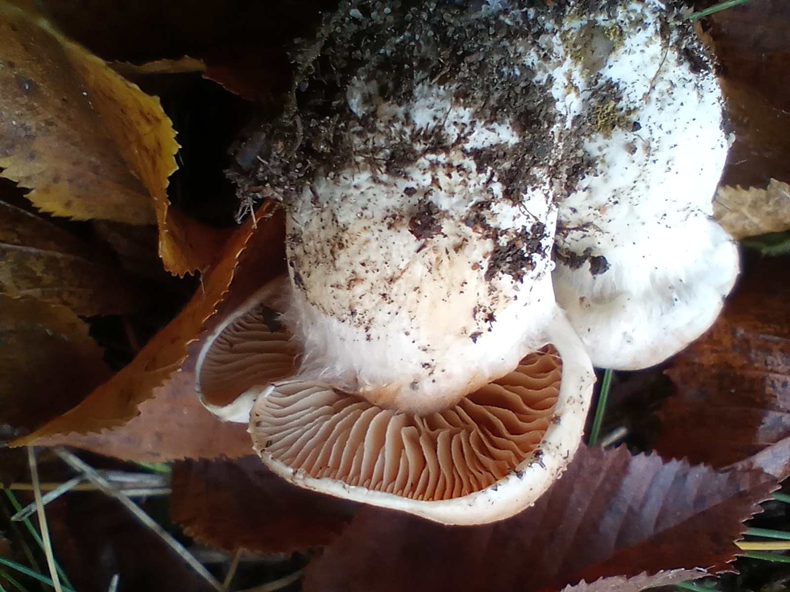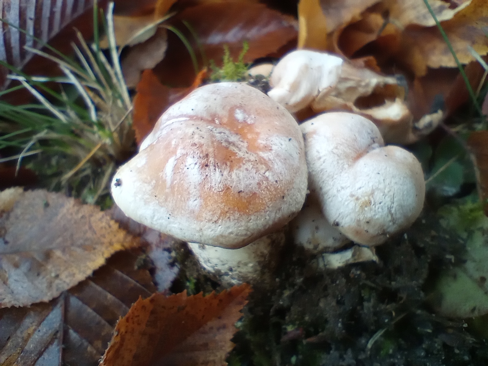 10. Als ich nach Hause gehen wollte, fand ich unterm Laub versteckt noch eine Gruppe von Schleierlingen. Ich kann die immer noch nicht in ihre Gruppen einteilen, denke, dass es sich um einen Schleimkopf oder Klumpfuß handelt? Mitgenommen habe ich sie nicht, wollte dann aber doch wissen, was es sein könnte. Das Schlüsseln mit Winkler/Keller gelingt mir nicht. Begleitbaum war eine Hainbuche, der Geruch unauffällig pilzig. Ich kriege junge Schleiereule nicht mehr aus dem Kopf ohne sagen zu können, woran ich das festmachen sollte. Vielleicht hat ja jemand eine Idee.