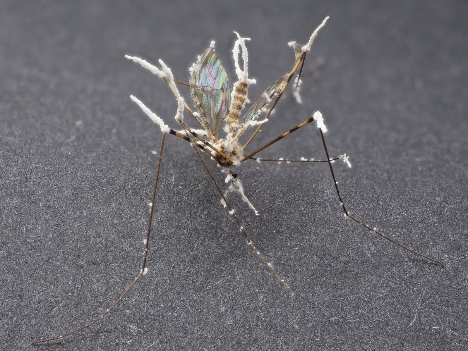 Aufgrund der farinösen (mehligen) Oberfläche und der irregulär verzweigten spitzen "Keulchen" denkt man vielleicht an Isaria. Zu Torrubiella fand ich nur Befälle an Spinnen, zudem sollten die "Keulchen" regelmäßiger und stumpf sein. Hirsutella käme nach Bildvergleich vielleicht noch in Frage. Kurzum ich habe keine Ahnung wo ich suchen soll. Daher schrieb ich Thorben an, der anhand des makroskopischen Bildes eine I. farinosa in die Nähere Auswahl zog. In der Annahme die Schnaken nicht in der Feuchtkammer inkubieren zu müssen habe ich mich dann heute an die Mikroskopie gemacht.