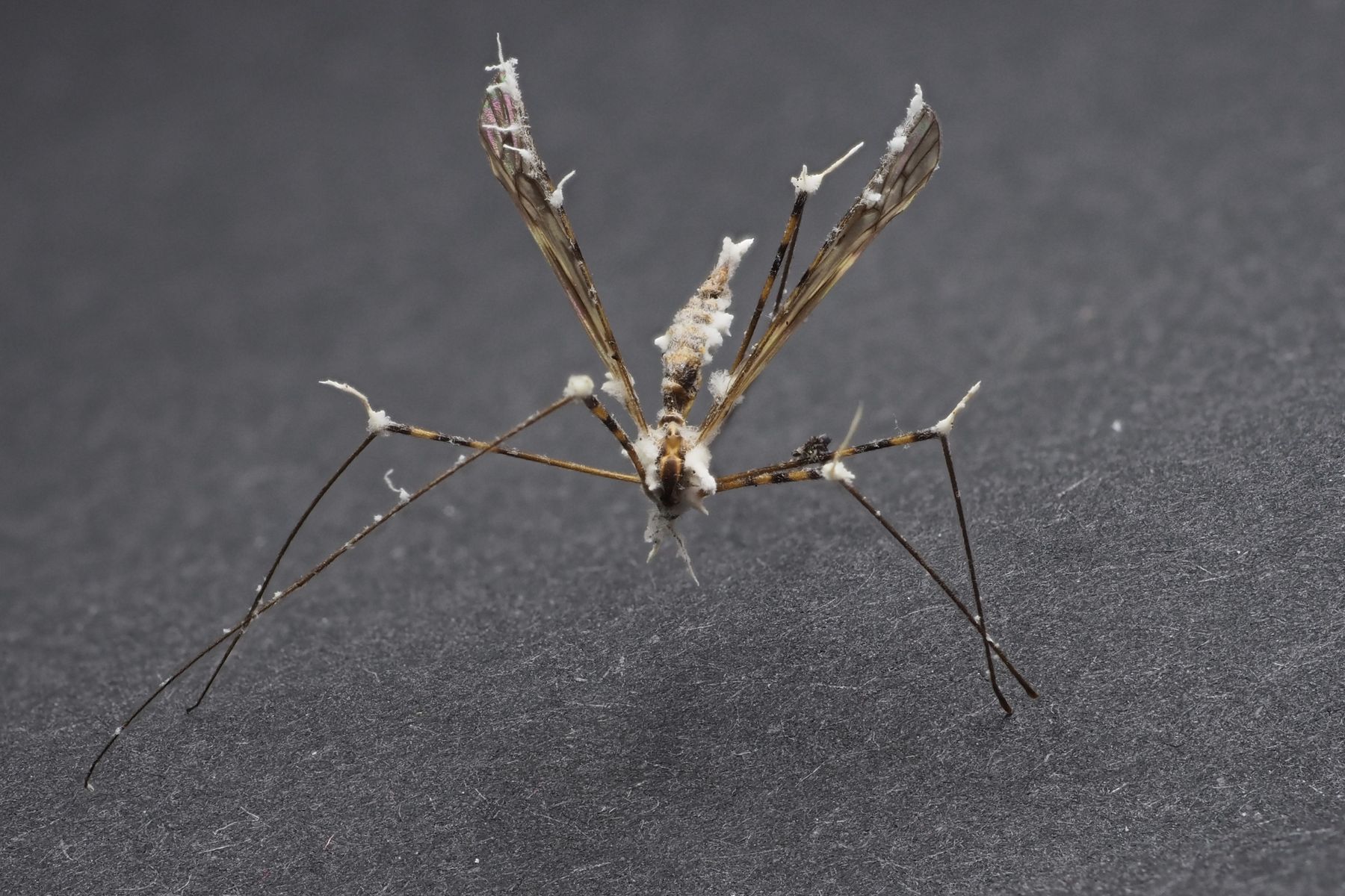 am letzten Wochenende fand ich auf einem Familienausflug zu einer kleinen öffentlich zugänglichen Höhle im fränkischen Jura große Mengen Schnaken an den Wänden. Ob sie dort überwintern oder auf ihren Tod warten entzieht sich meiner Kenntnis. Jedenfalls fiel mir auf, dass viele Schnaken an den Gelenken weisse Auswüchse trugen. Ich konnte nicht umhin eine Probe einzustecken. Eine Internetrecherche erbrachte keine sonderlich ähnlichen Gattungen. Spezielle Literatur besitze ich nicht bzw ist oft nicht öffentlich zugänglich.