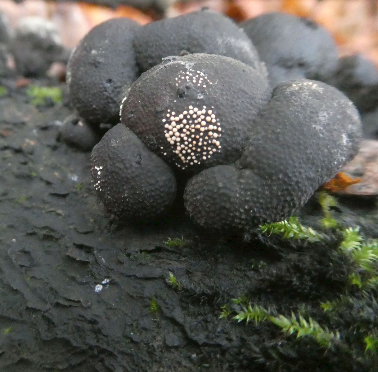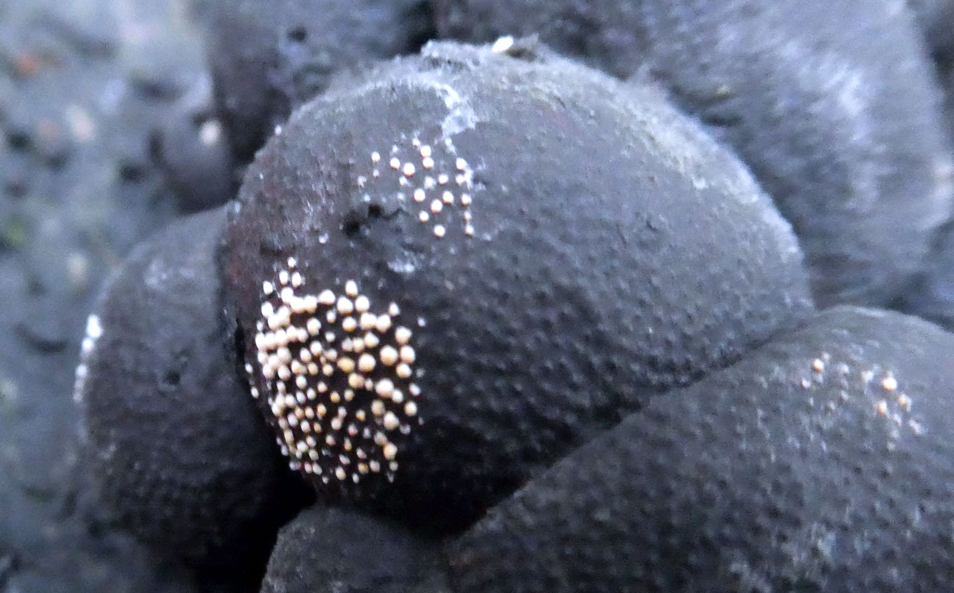 was sind diese hellen weiß-beigen Punkte auf den schwarzen 2,5-3,5cm kugeligen FK der vermutlich Vielgestaltige Kohlenbeere?