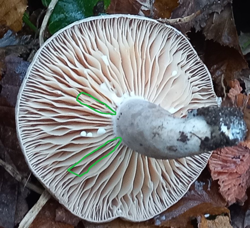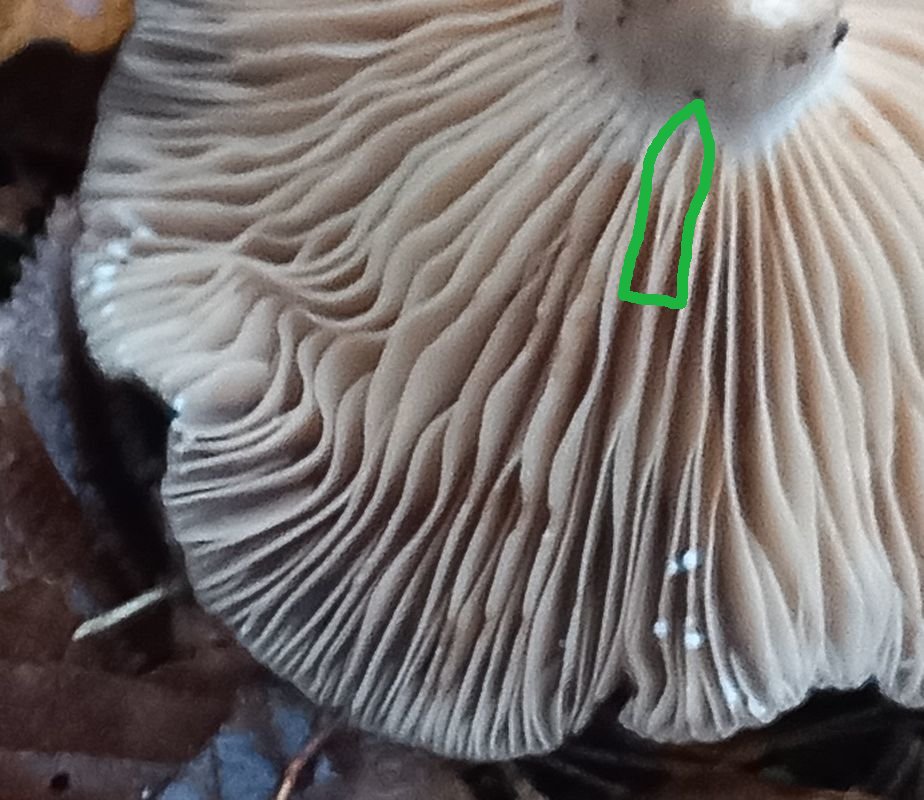 Die Lamellen sind teils gegabelt, manchmal verbinden sich zwei Lamellen erst am Stiel: