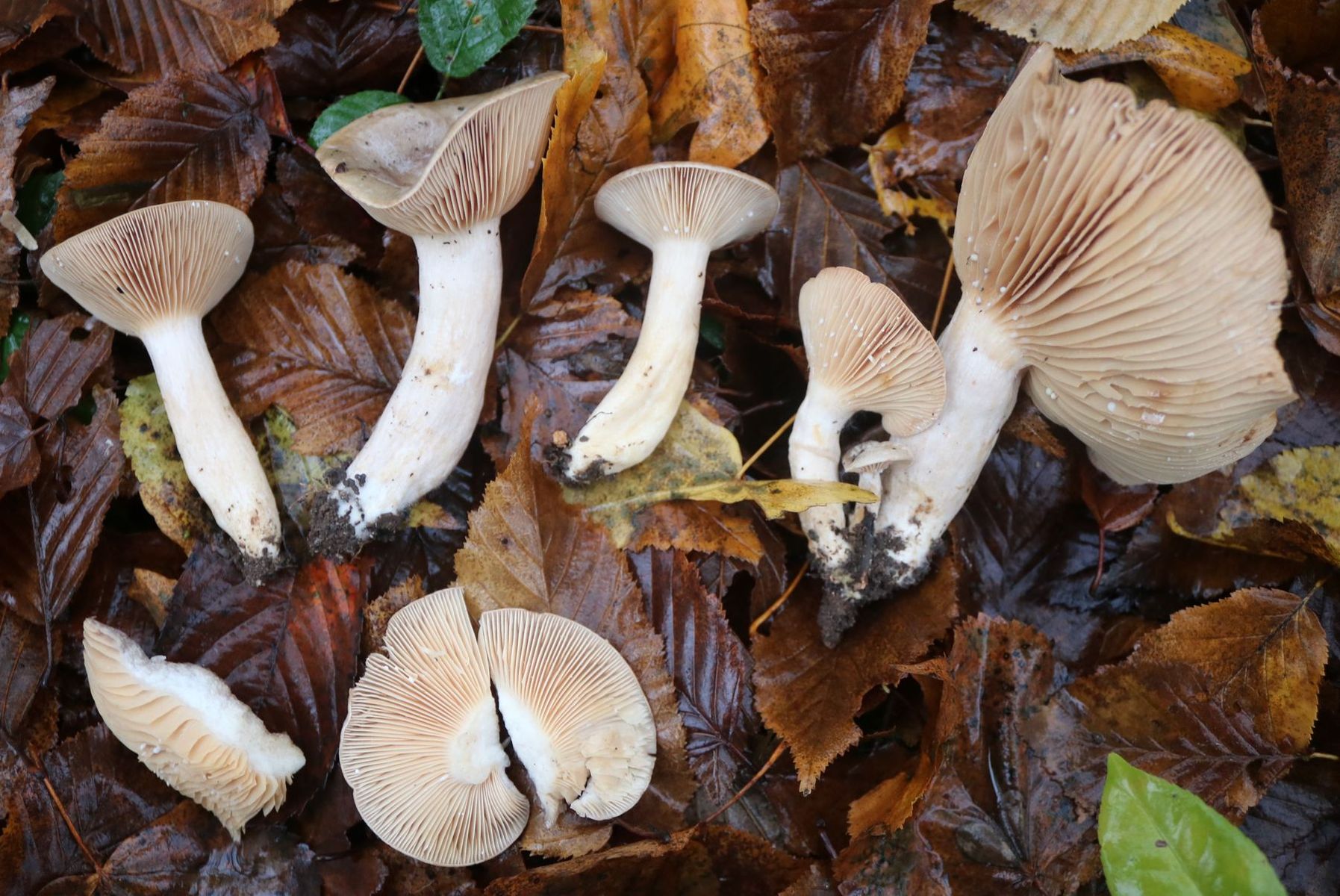 • Ich könnte mir da sogar L. fluens vorstellen, wegen des helleren Hutrandes und den crmefarbenen, nicht weißen Lamellen. Die Ökologie würde auch nicht dagegen sprechen (Mönchsköpfe!).