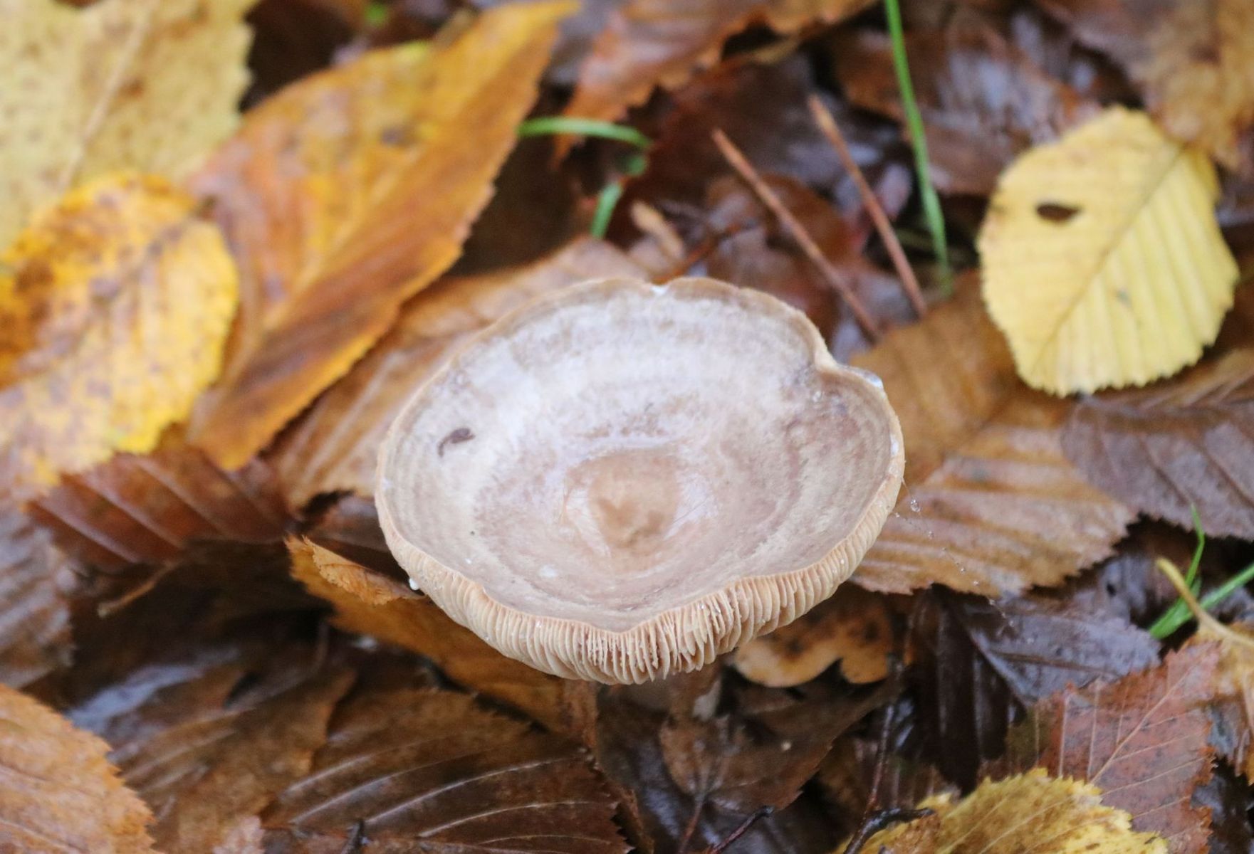 Es ist kein Totentrompeten-Semmelstoppel-Waldgebiet. L. blennius kenne ich inzwischen, er häte z.B. nicht wie mein Fund die ockerlichen Lamellen mit einem Hauch von rosa.