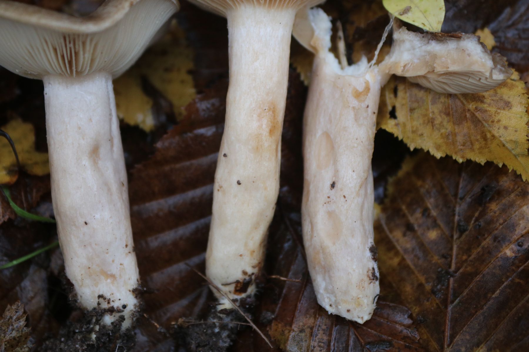 Nur an einem Stiel habe ich auf einer Seite Grübchen entdeckt, so wie sie bei manchen anderen Milchlingen vorkommen (rechts im Bild):