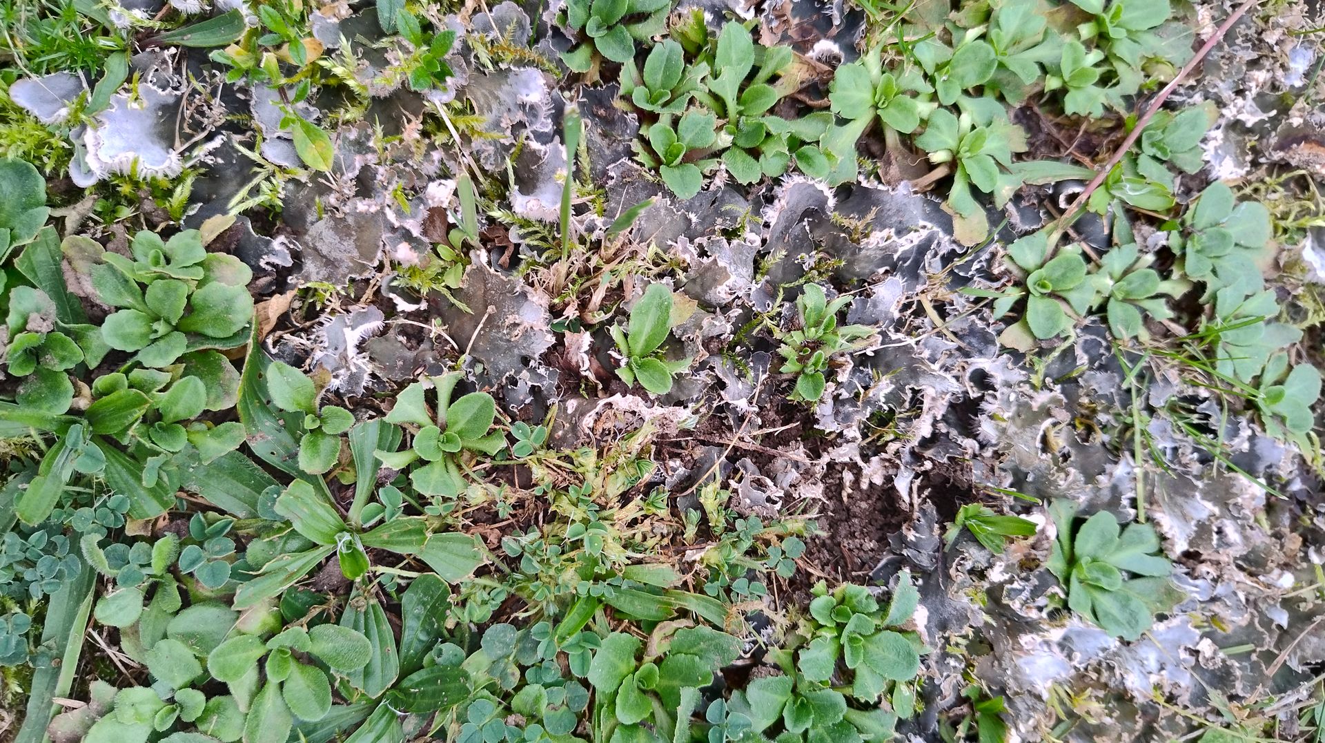 Es stellte sich heraus, dass der graue Schatten durch Unmengen (!) von Peltigera-Lagern kommt, die zwischen den kurzgeschorenen Gefäßpflanzen und Moosen fröhlich Urständ feiern.