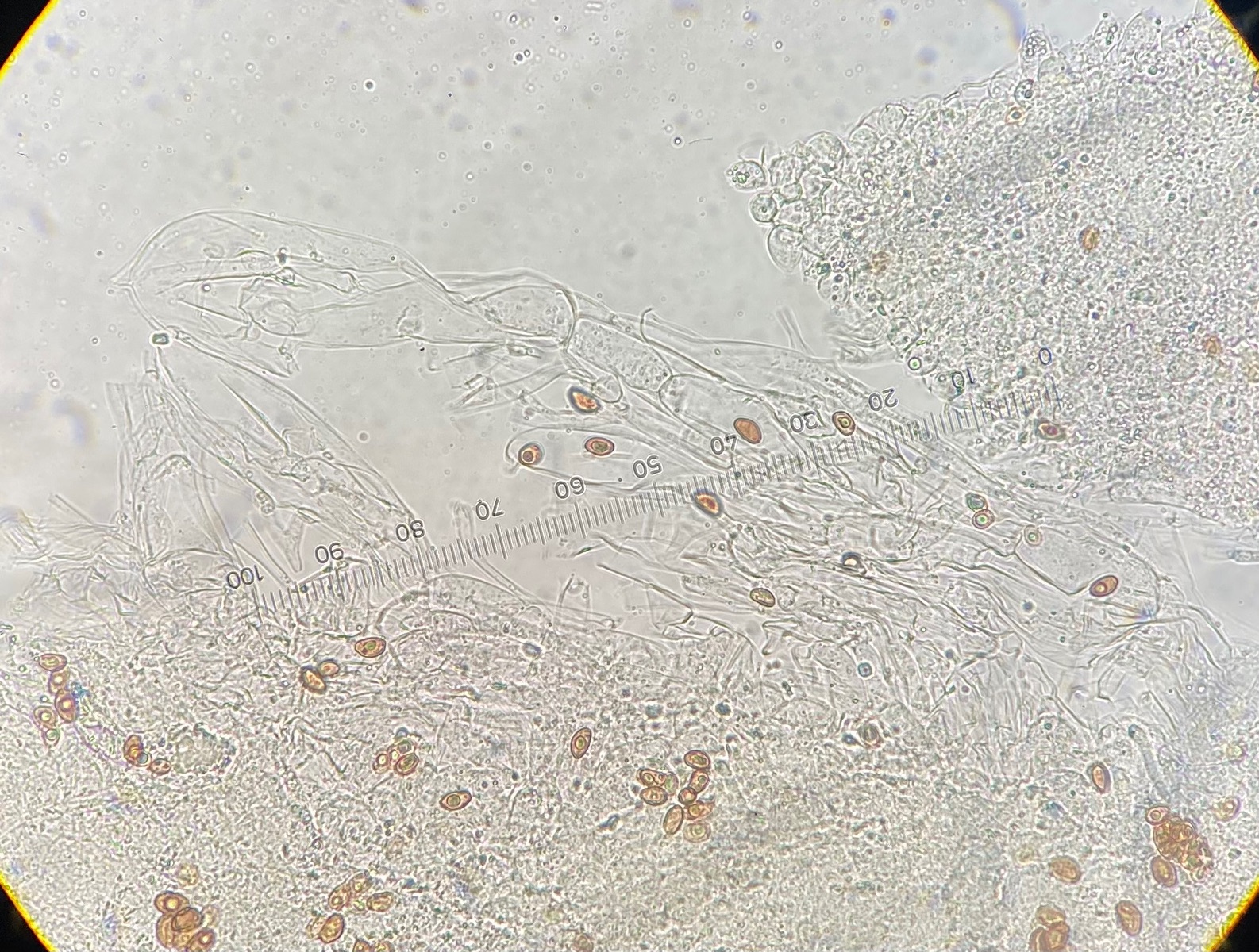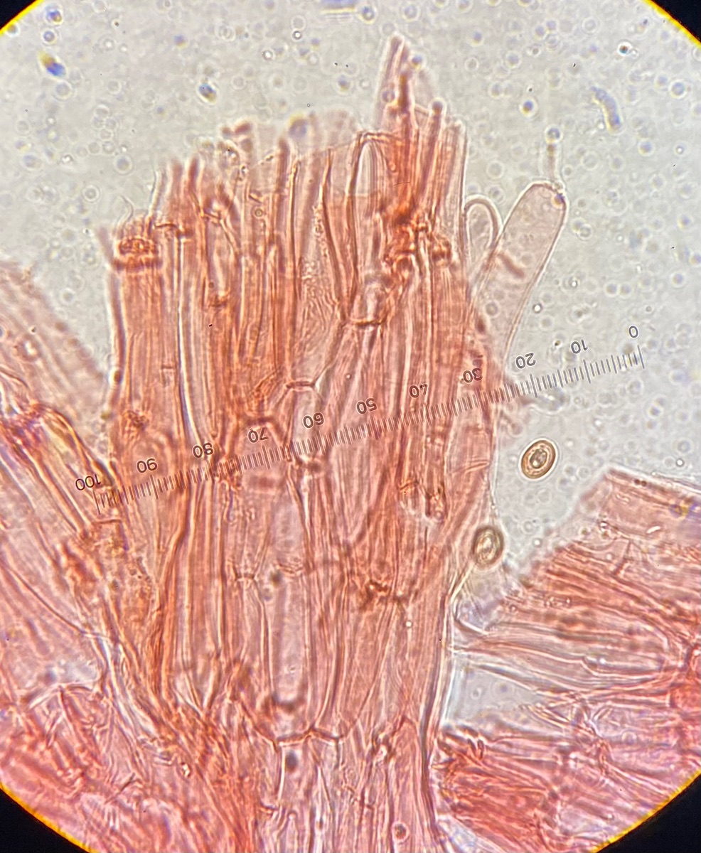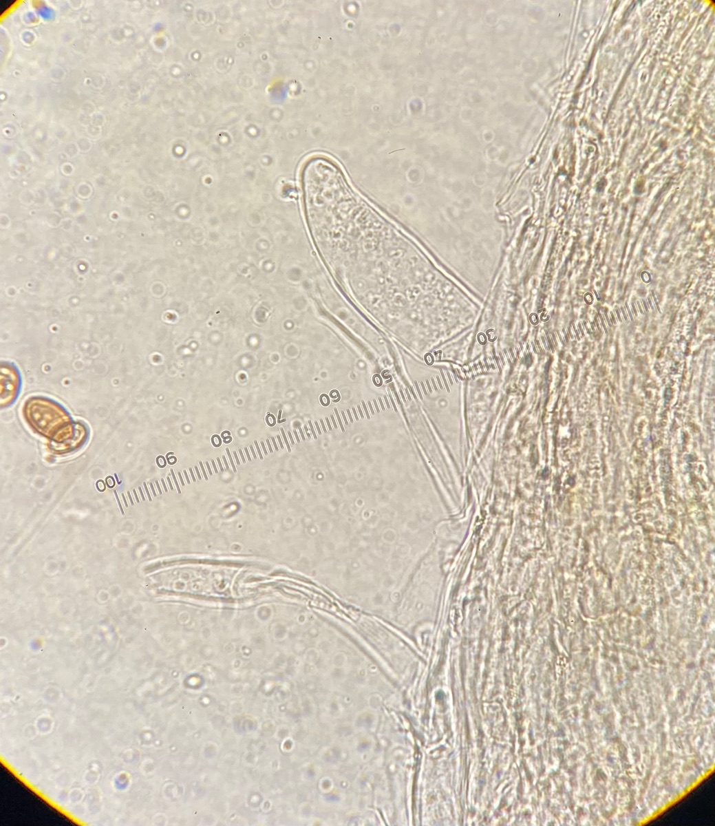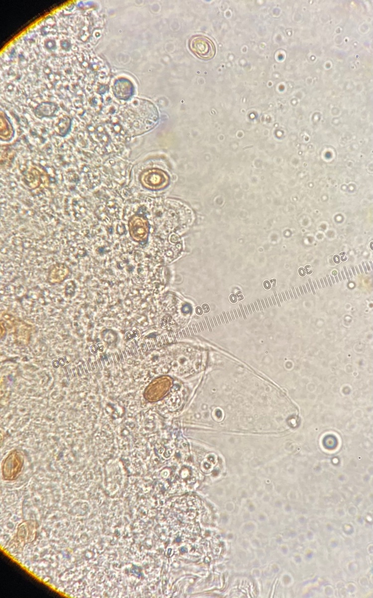 Die Sporen sind glatt und messen 9-10,2 x 5-6, der Keimporus ist etwas exzentrisch. Die eher flaschenförmigen Cheilozystiden messen 28 x 9. Das Velum besteht meiner Interpretation nach aus Zellketten.