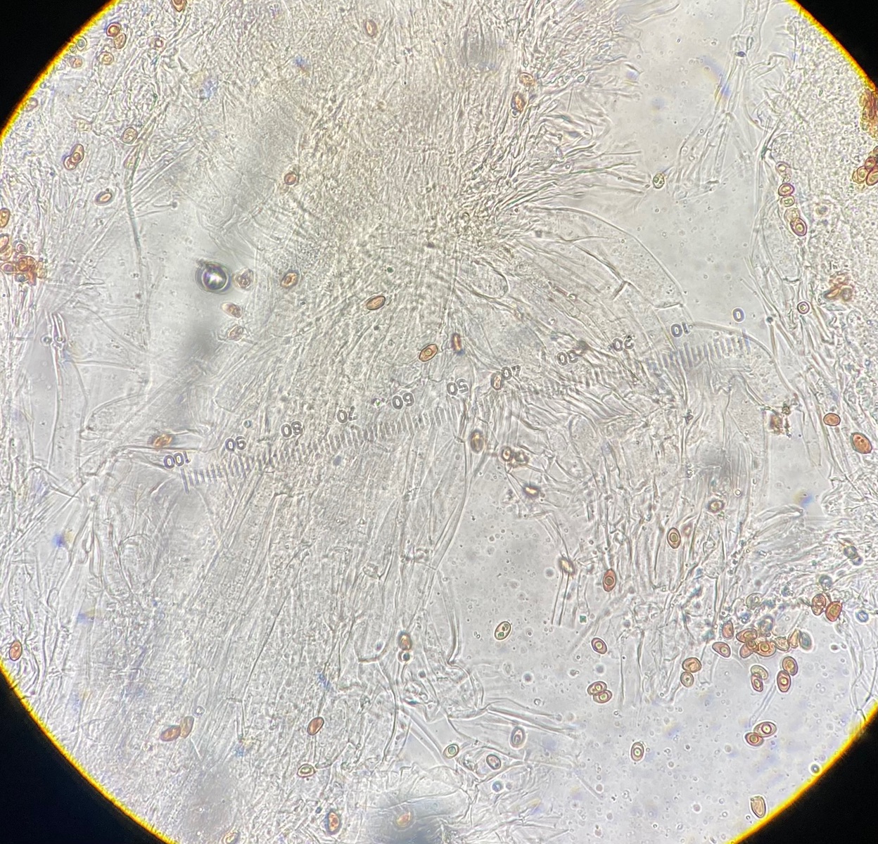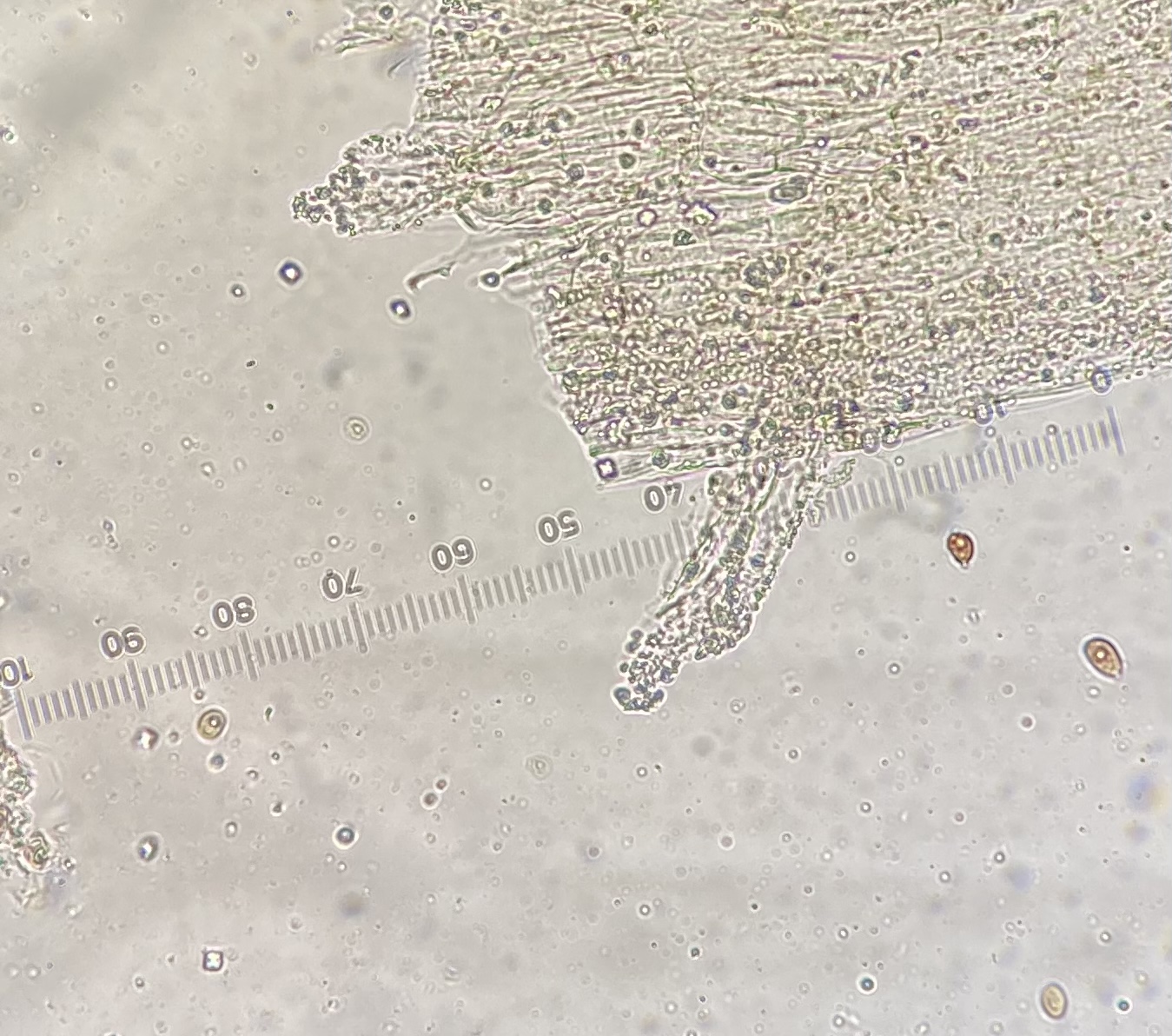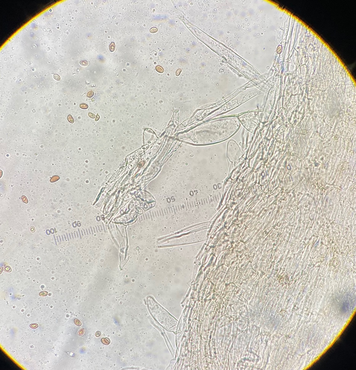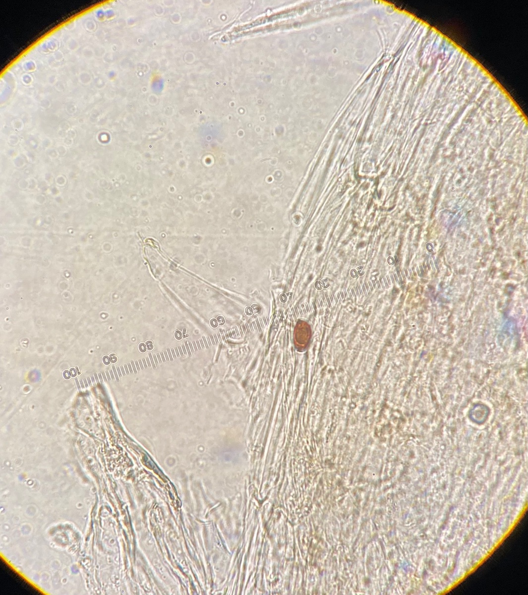 Die Sporen sind glatt und messen 9-10,2 x 5-6, der Keimporus ist etwas exzentrisch. Die eher flaschenförmigen Cheilozystiden messen 28 x 9. Das Velum besteht meiner Interpretation nach aus Zellketten.