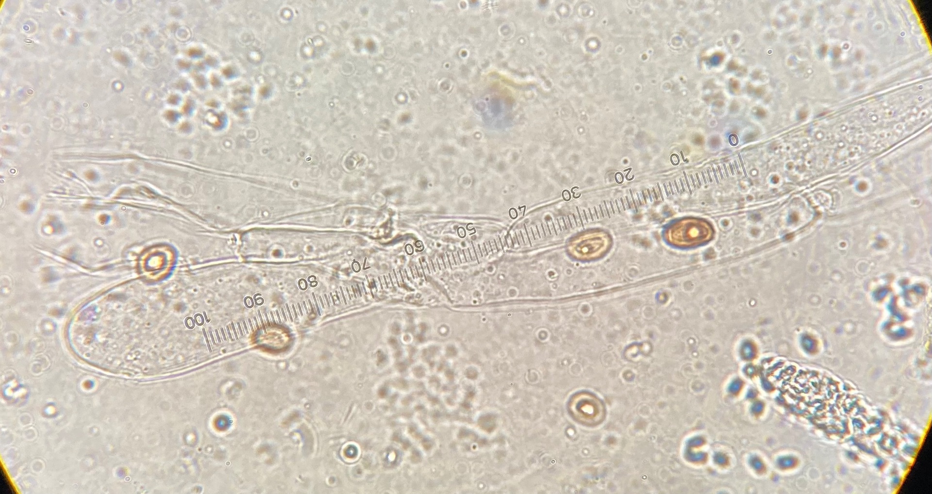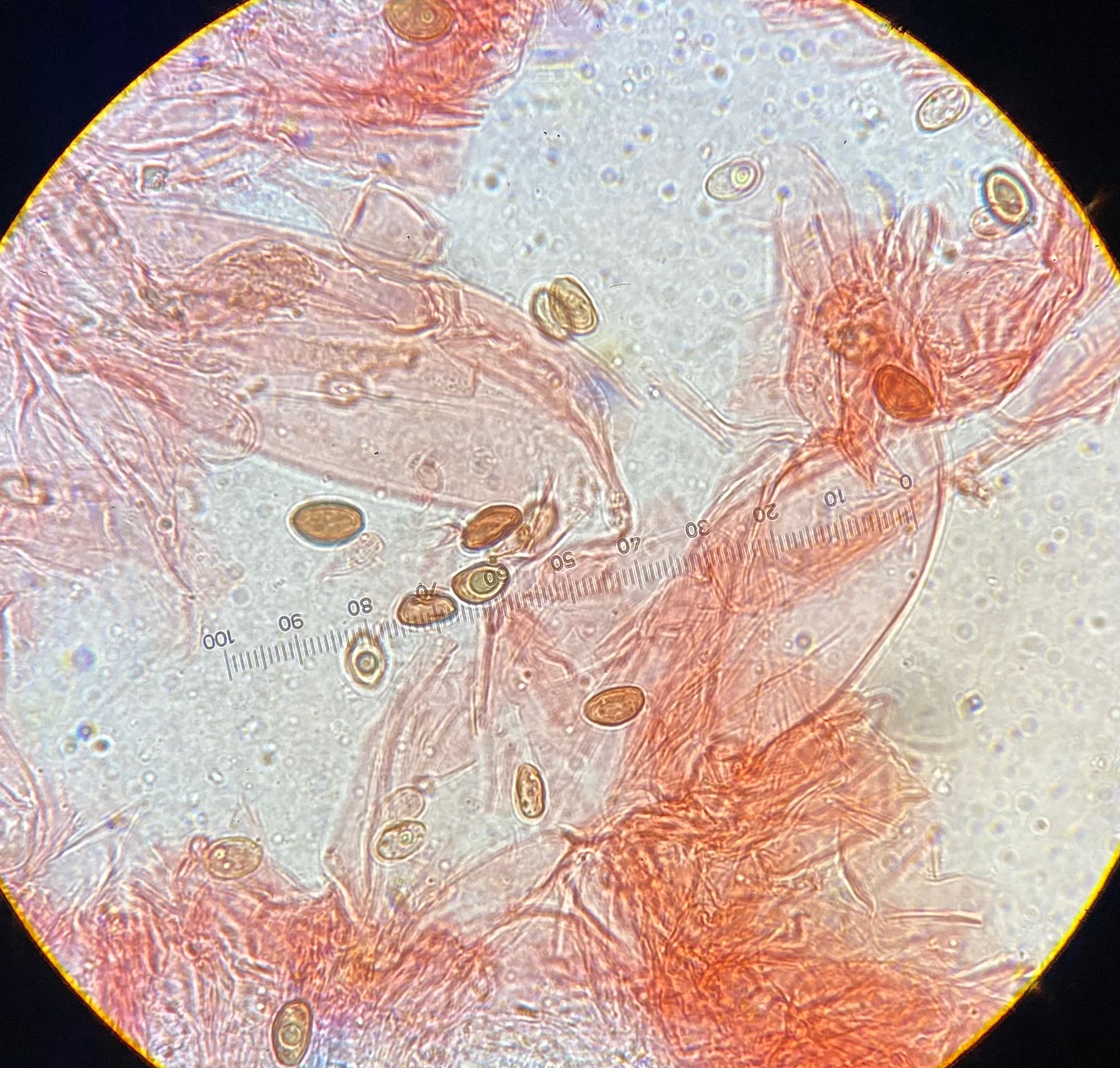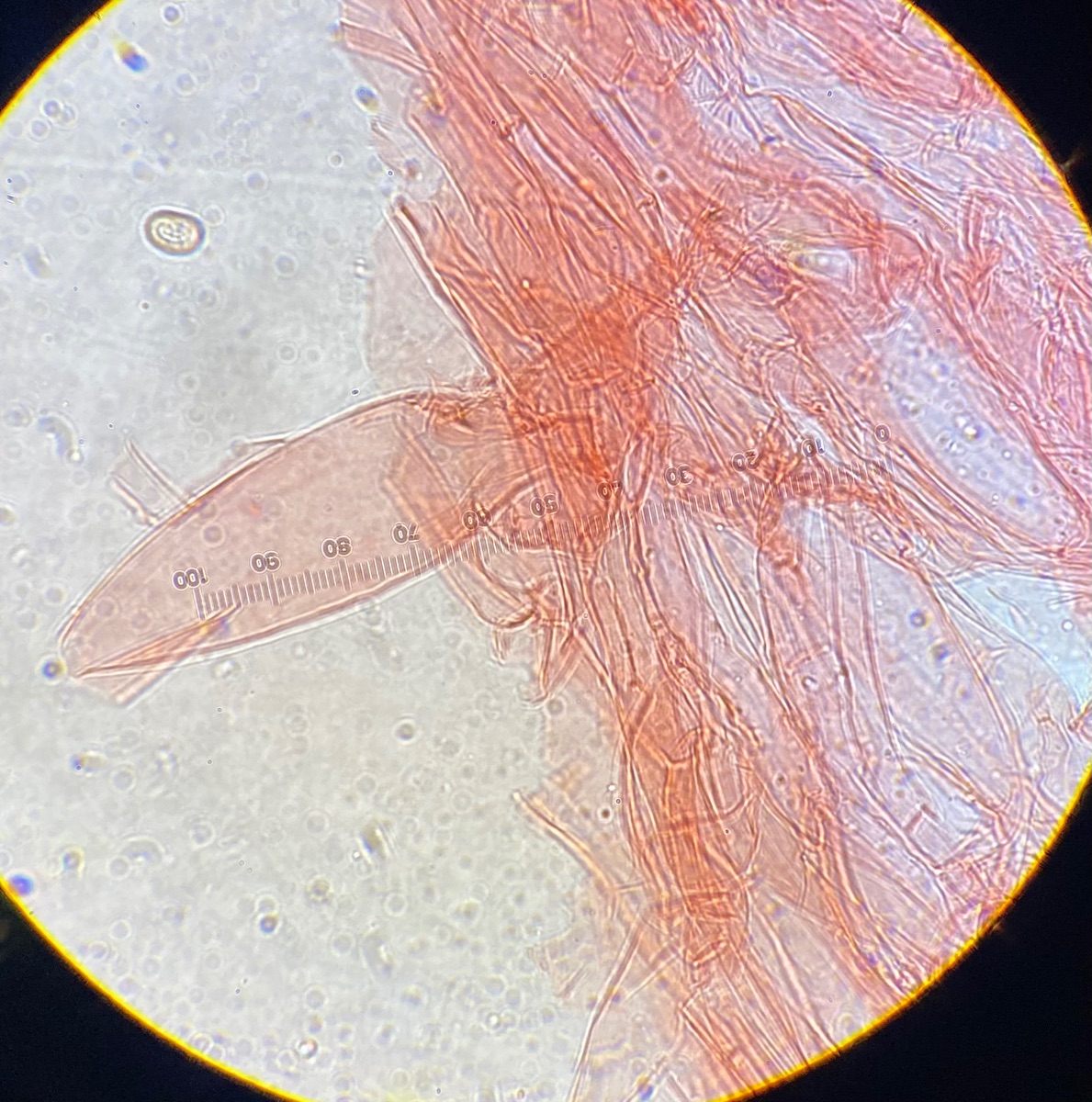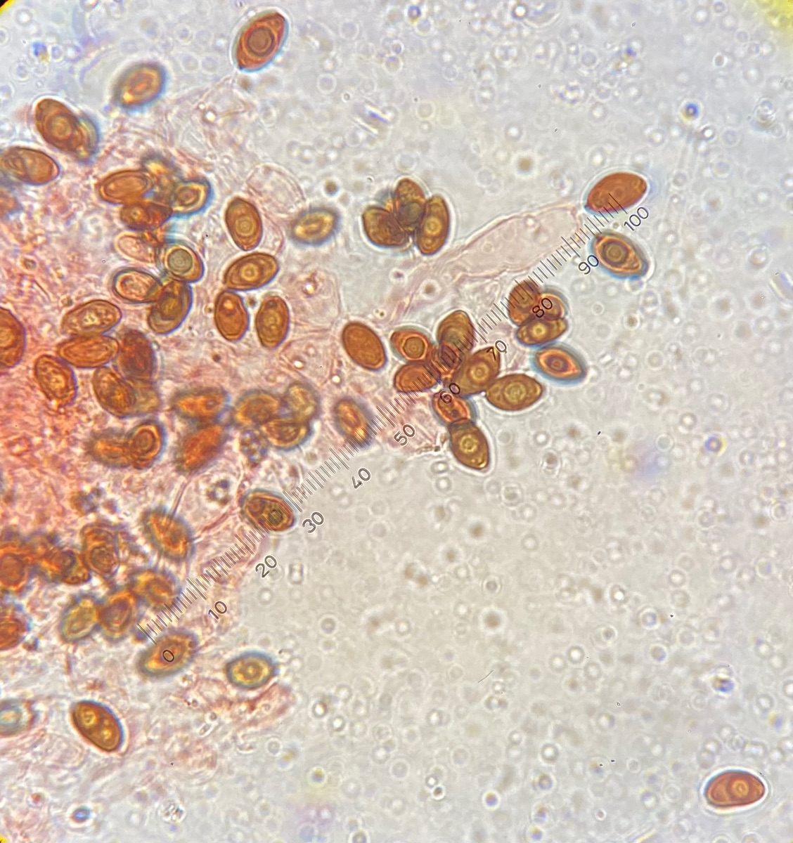 Die Sporen sind glatt und messen 9-10,2 x 5-6, der Keimporus ist etwas exzentrisch. Die eher flaschenförmigen Cheilozystiden messen 28 x 9. Das Velum besteht meiner Interpretation nach aus Zellketten.