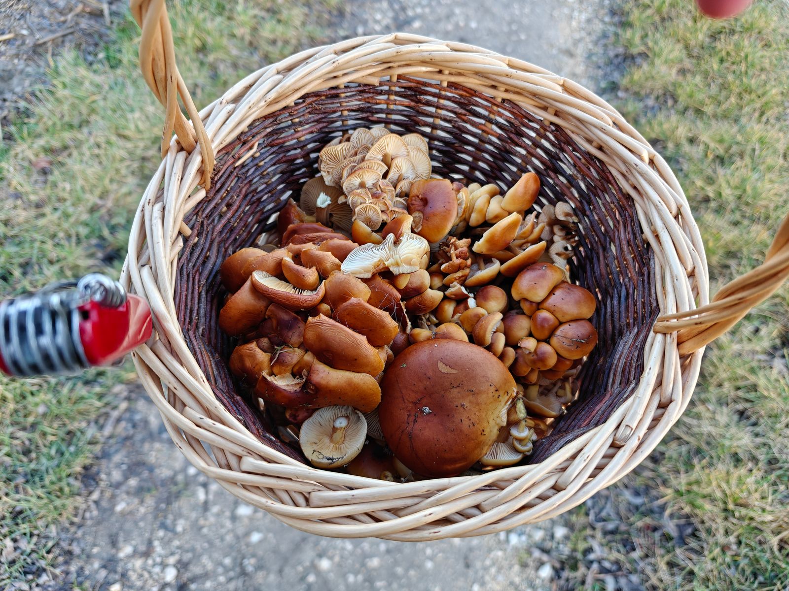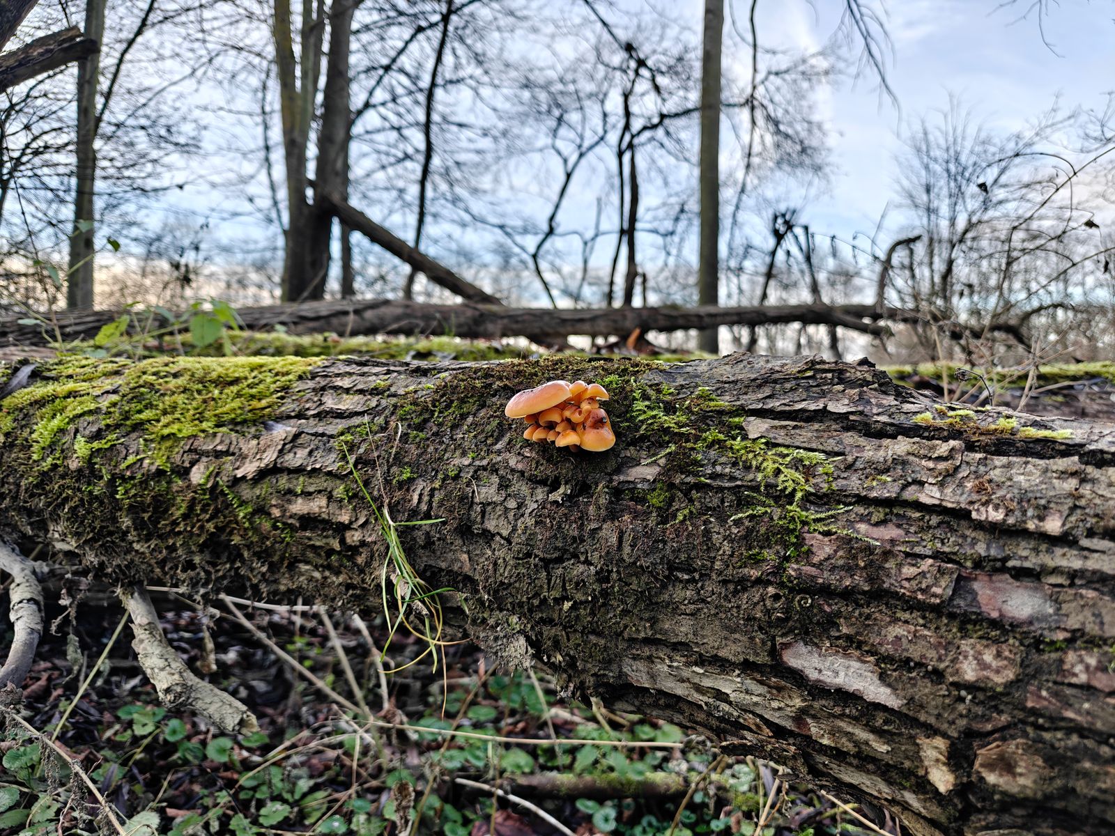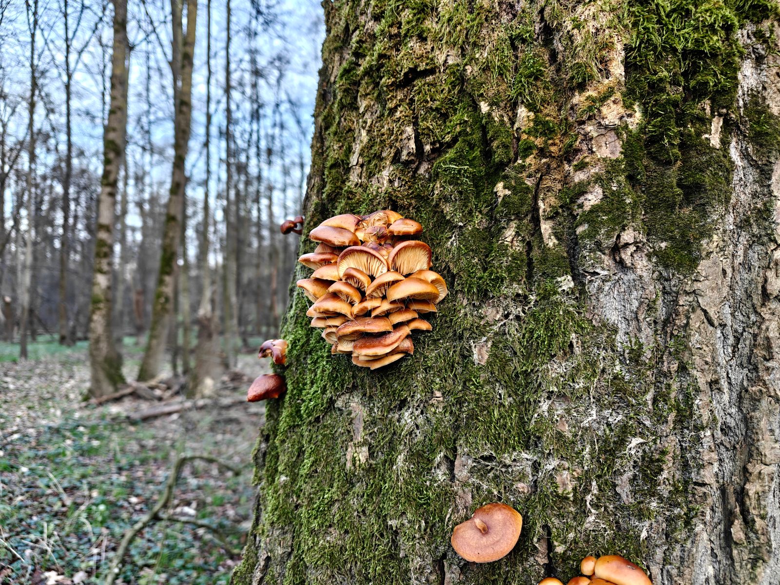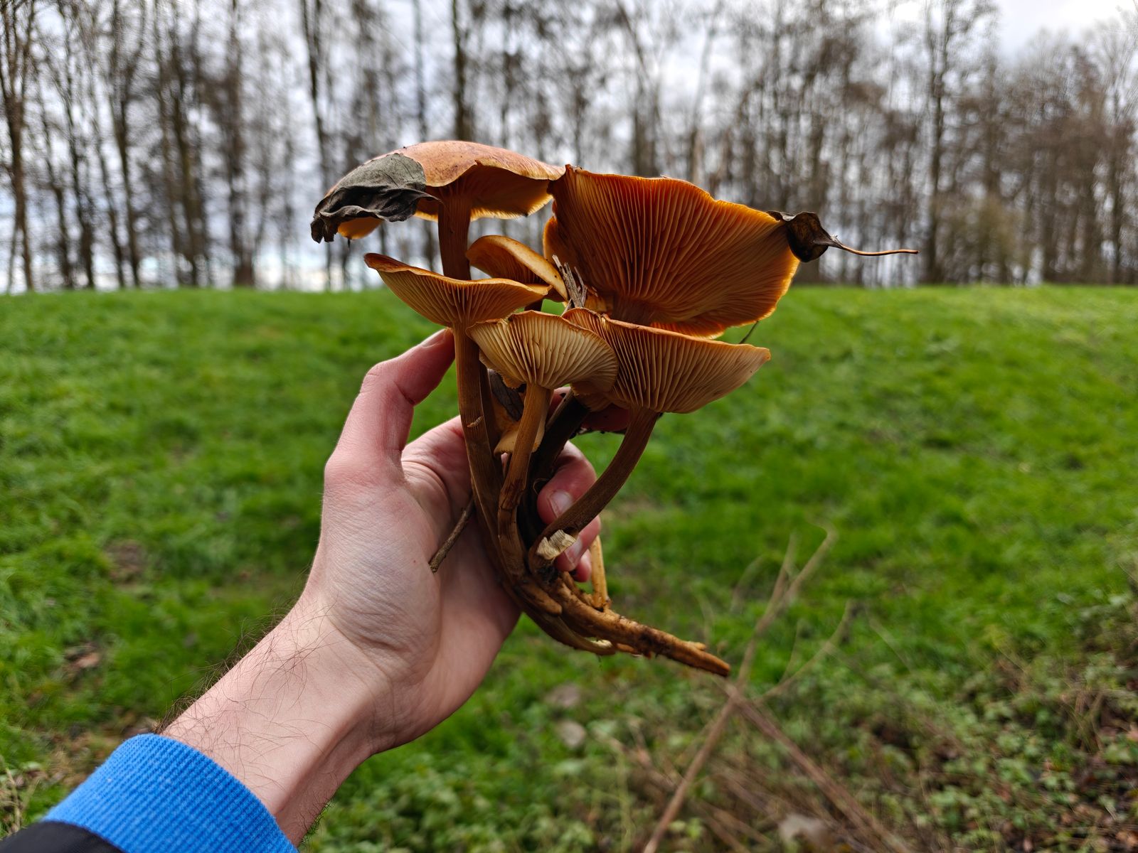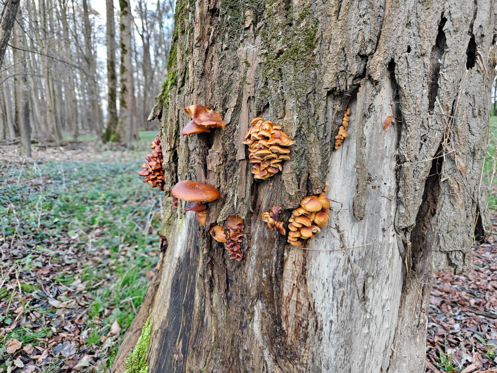 Heute war ich mit dem Rad in den Donau-Auen unterwegs - Austernseitlinge suchen. Leider auch diesmal ohne Erfolg. Bin dann auf Samtfußrüblinge umgestiegen, welche es hier und da auf Weidenstümpfen in nennenswerter Anzahl hatte. Und dann.... dann kam eine noch lebendige Weide mit Befall. Mir ist regelrecht die Kinnlade heruntergeklappt. Der gesamte Stamm eingehüllt mit Samtfußrüblingen, die teils eine Größe hatten, wie ich sie noch nie gesehen habe. Manche Fruchtkörper mit "Steinpilzkaliber".