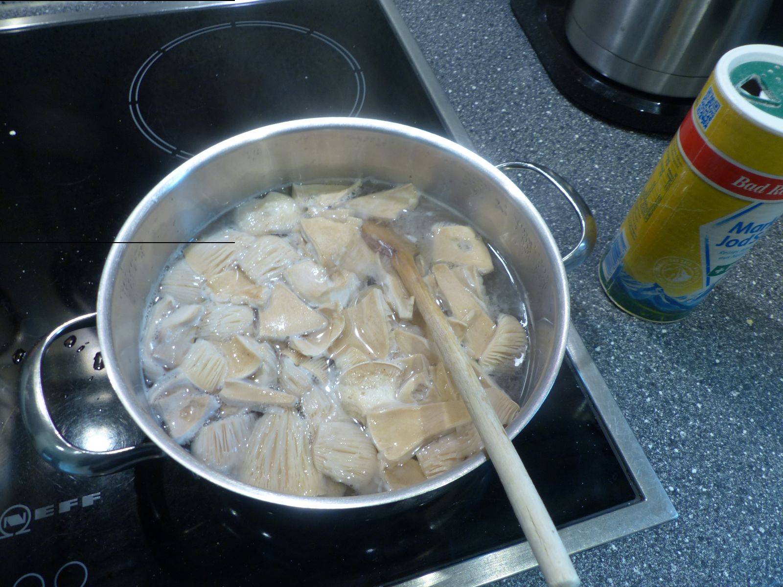 Pilze in gut gesalzenem Wasser (Originalrezept sagt "leicht gesalzenes Wasser") für 12 Minuten kochen lassen (Originalrezept sagt "5 Minuten", aber da bin