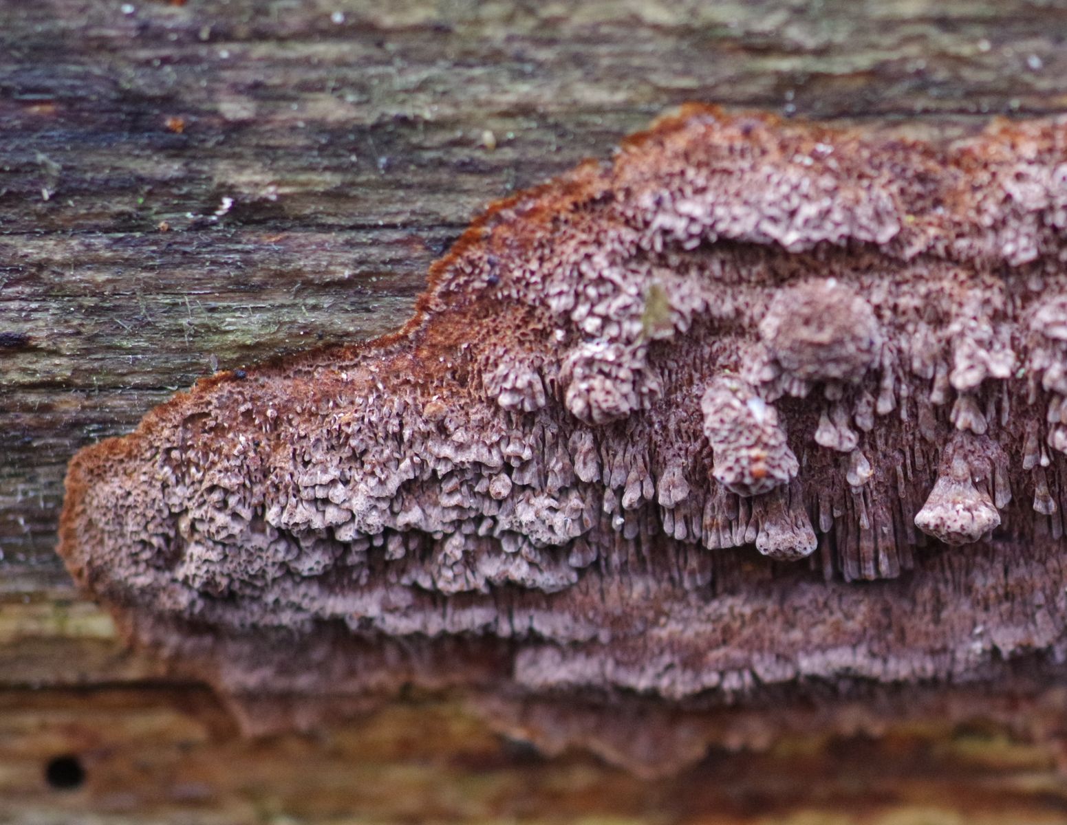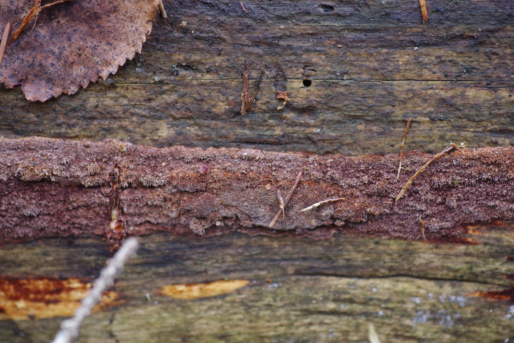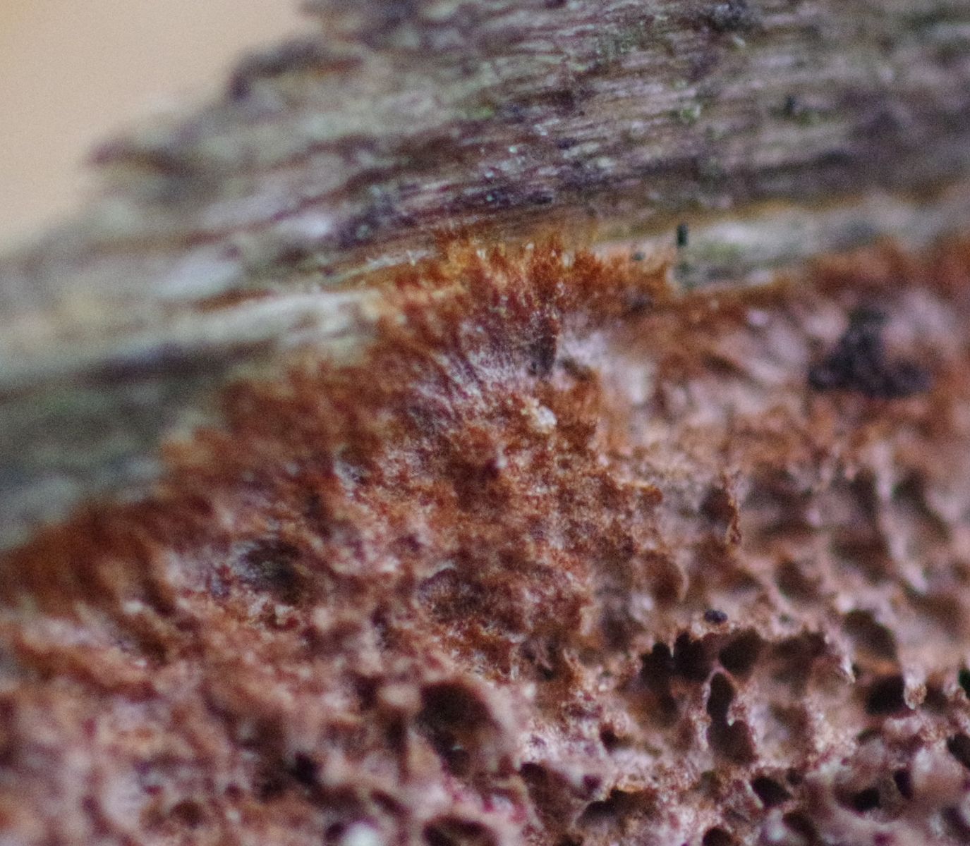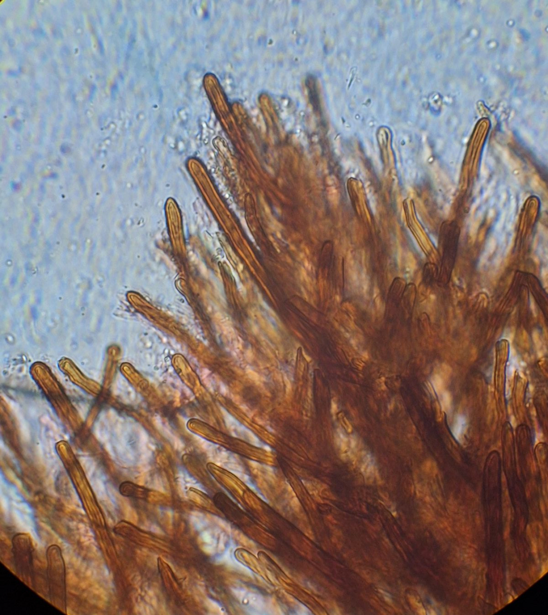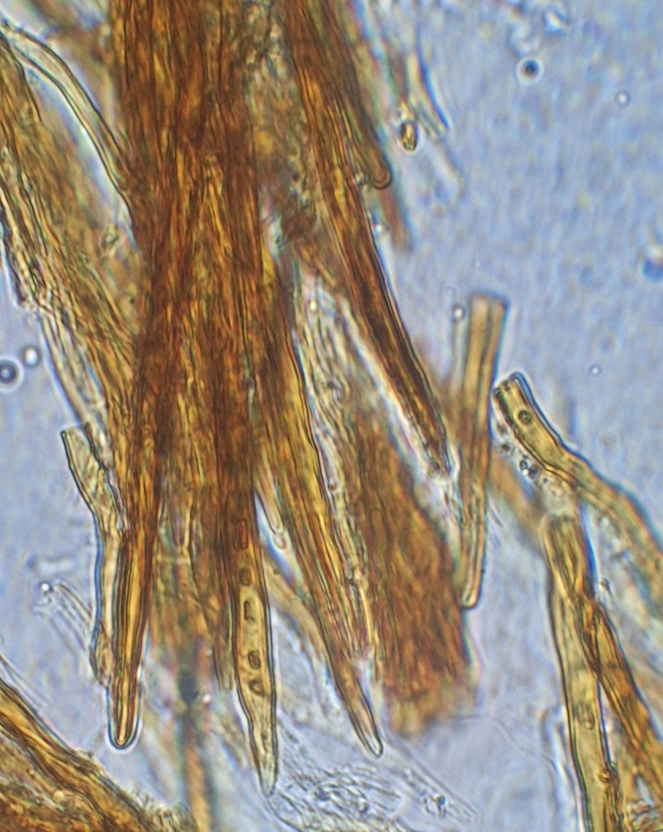 an einem mäßig morschen Fichtenstamm wächst seitlich bis leicht unterseitig ein rötlichbrauner Pilz, der mit seinen Büscheln wie eine Atrodia wirkt und sich in einem wenige cm breiten Strefen über knapp einen halben Meter hinzieht. Ist aber sehr fest und wird mit KOH (~3%) sofort schwarz. Nach einiger Suche bin ich auf Phellinus ferrugineofuscum gestoßen, dessen deutscher Name Rostrotrandiger Feuerschwamm nicht umpassend erscheint für den rostroten Zuwachsbereich. Ob die Mikrobilder dazu passen kann ich nicht sagen, da Vergleichsmaterial fehlt. Zumal dies mein erster Versuch mit einem Phellinus ist.