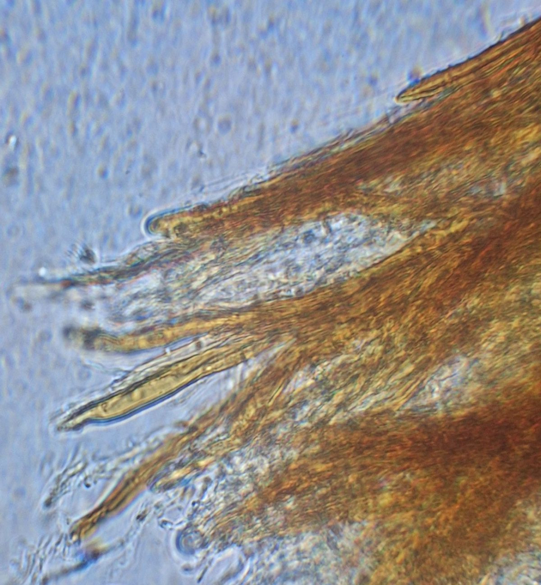 In Wasser. Basidien habe ich keine gesehen, Sporen wohl auch nicht, dafür jede Menge Bruchstücke, Krümel und Tropfen. Hauptsächlich gelbe, dickwandige, bis 5 µm dicke "Stacheln"