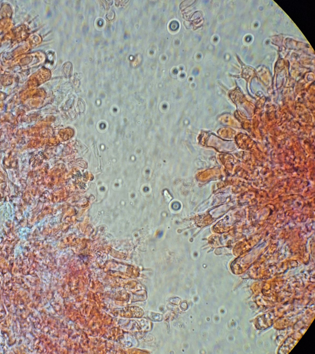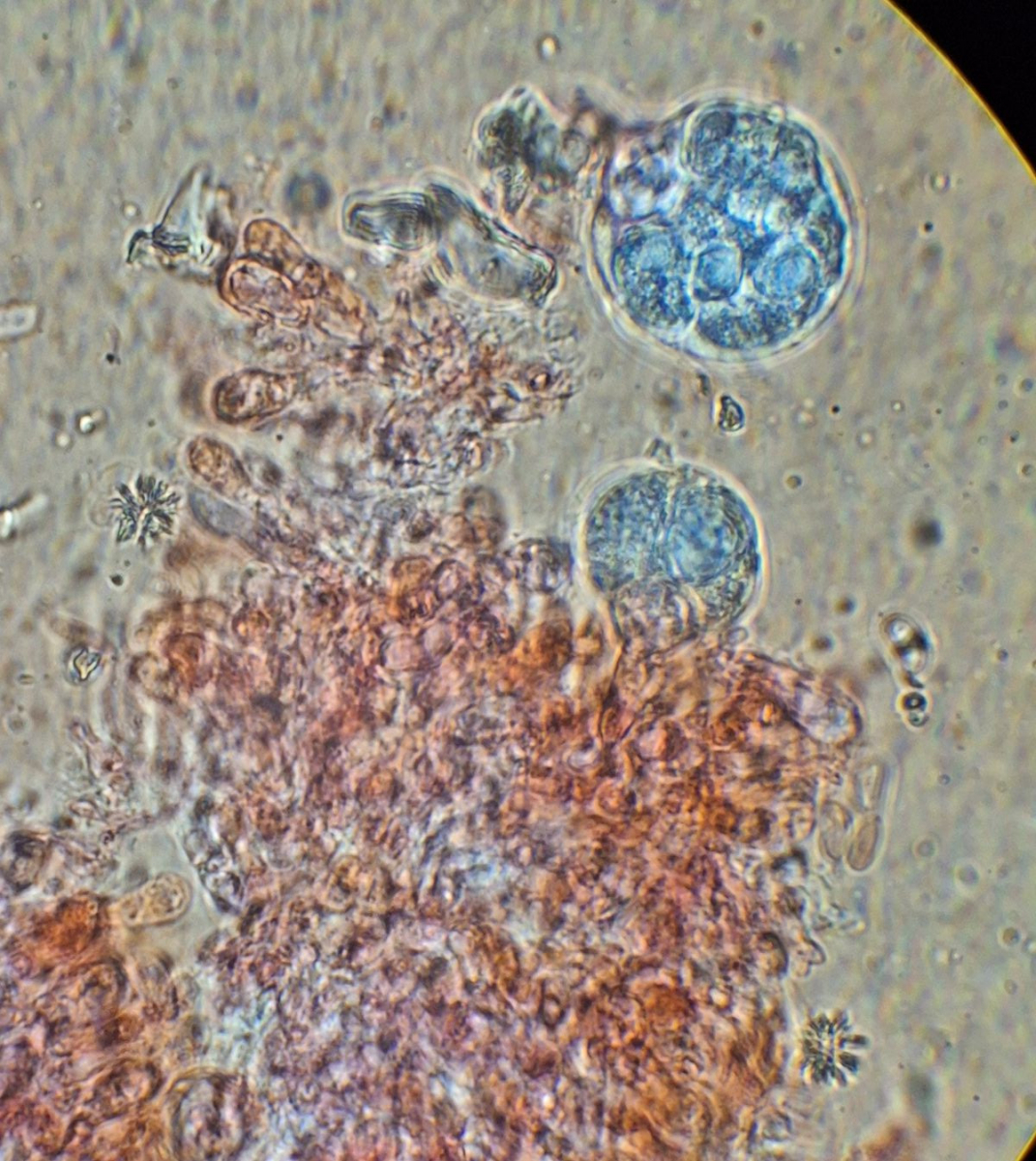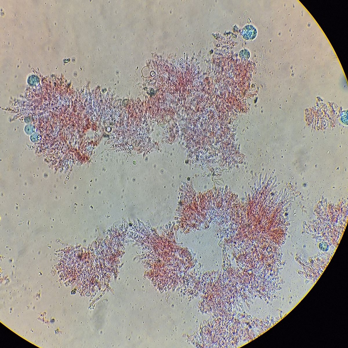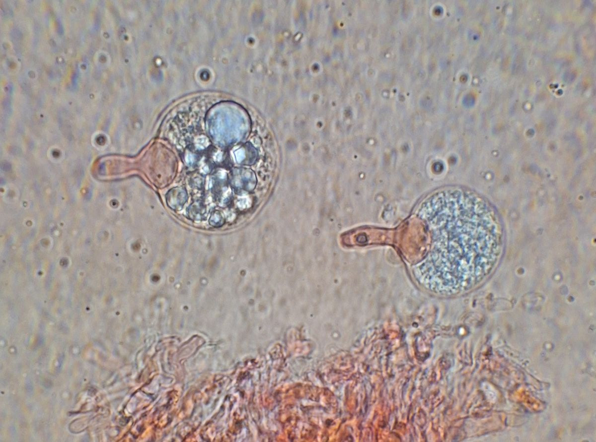 Die Weihnachtsbaumkugeln gehören vermutlich gar nicht zu dem Pilz, sondern sind Zoosporen? Vielleicht hat jemand eine Idee dazu, vielleicht thorben96 ?