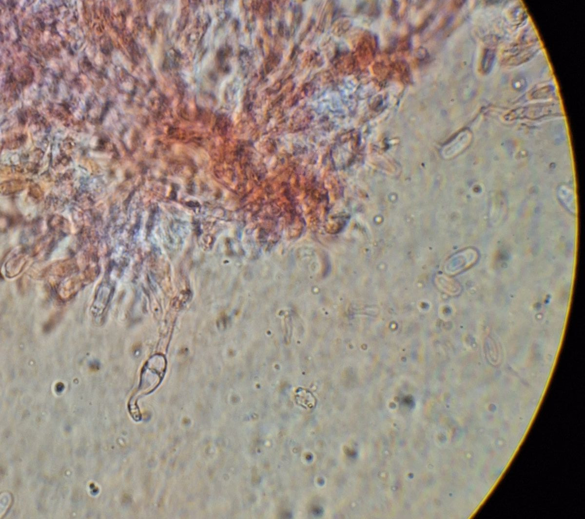 Sporen (Basidio oder Konidien?) 6-8*3-4 µm, und ein komischer Haken