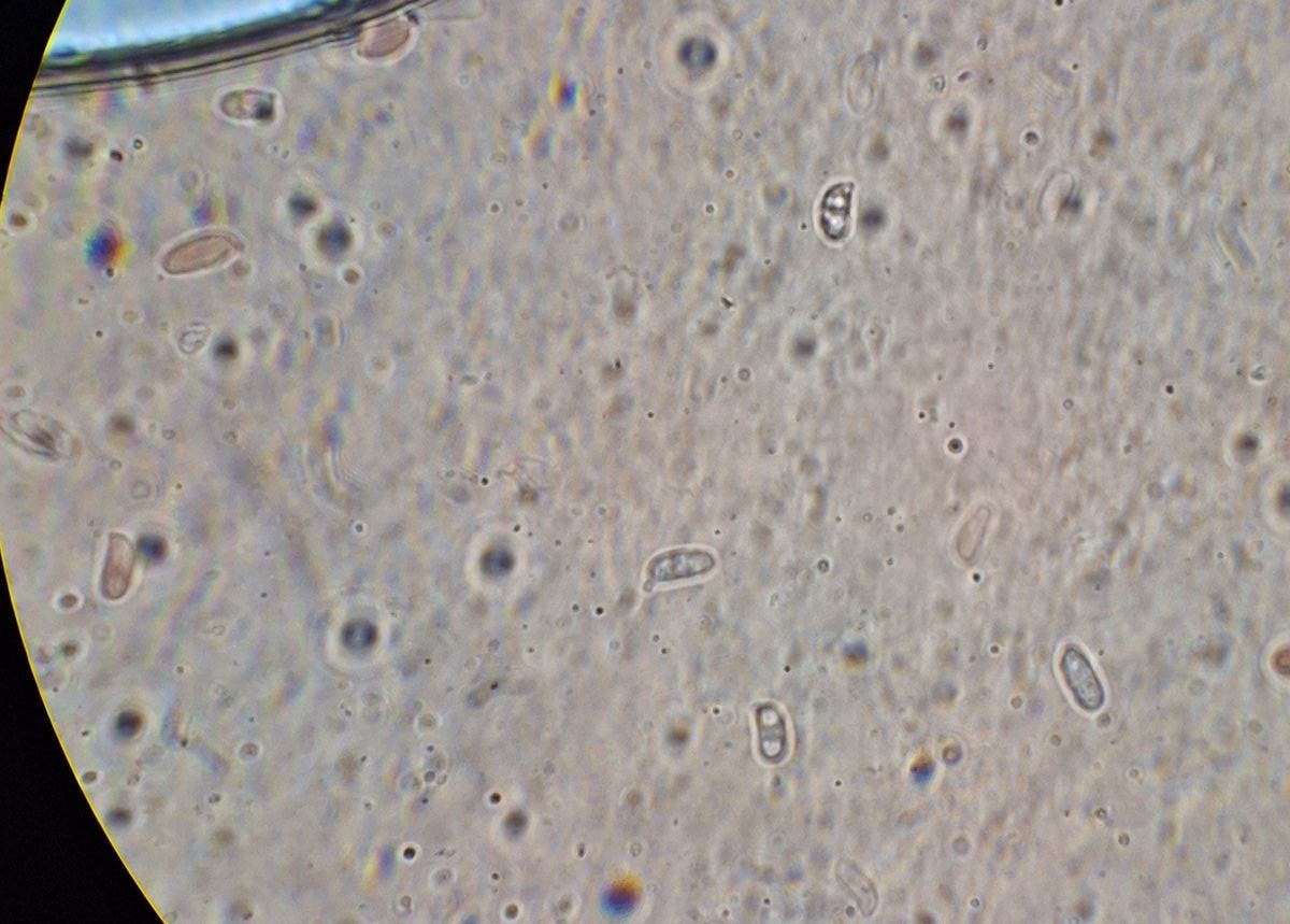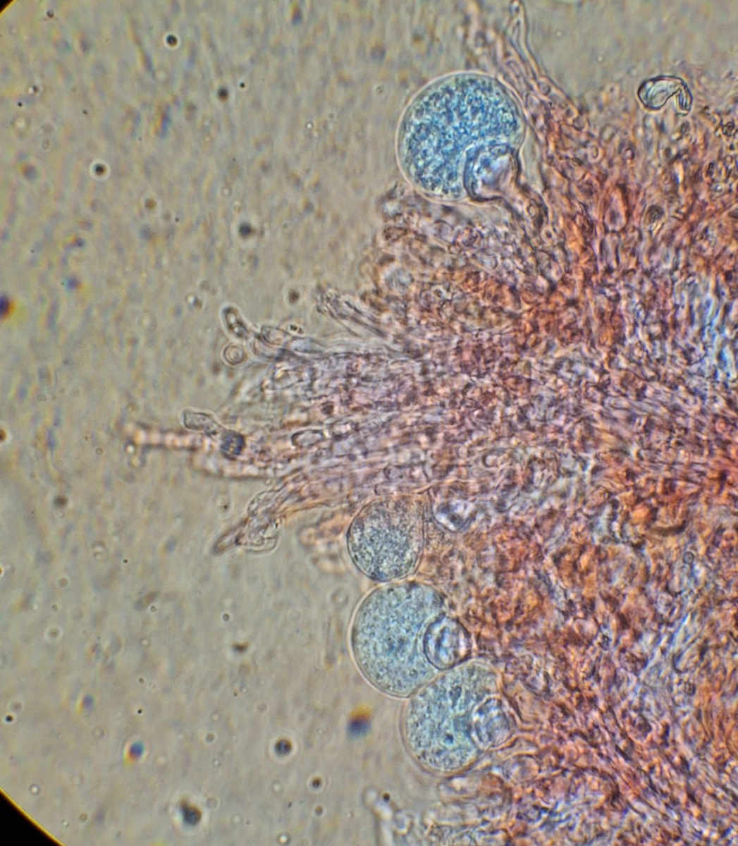Die Weihnachtsbaumkugeln gehören vermutlich gar nicht zu dem Pilz, sondern sind Zoosporen? Vielleicht hat jemand eine Idee dazu, vielleicht thorben96 ?