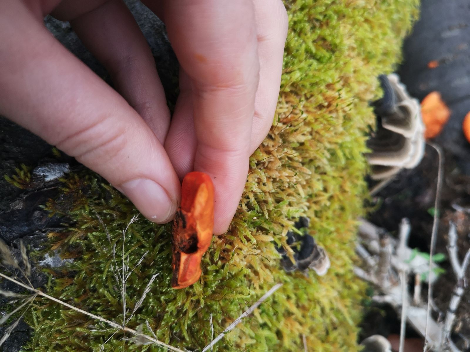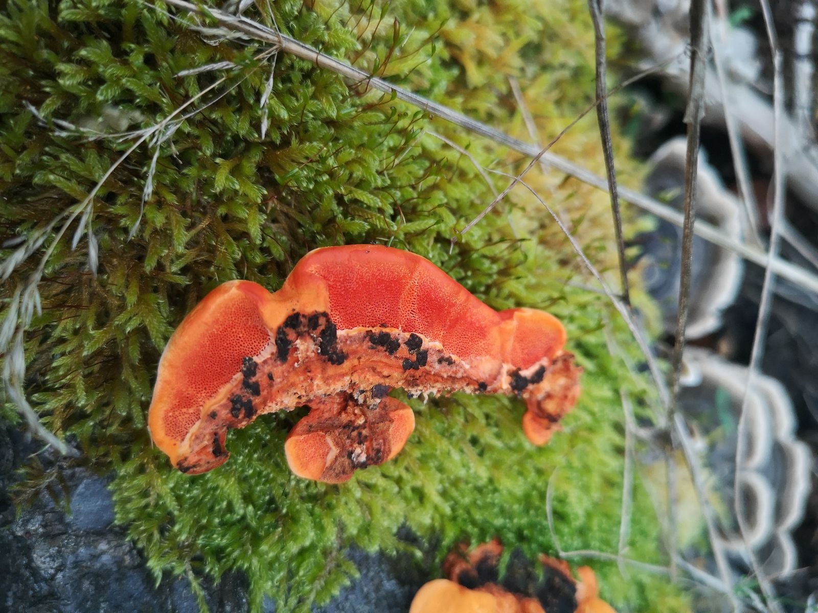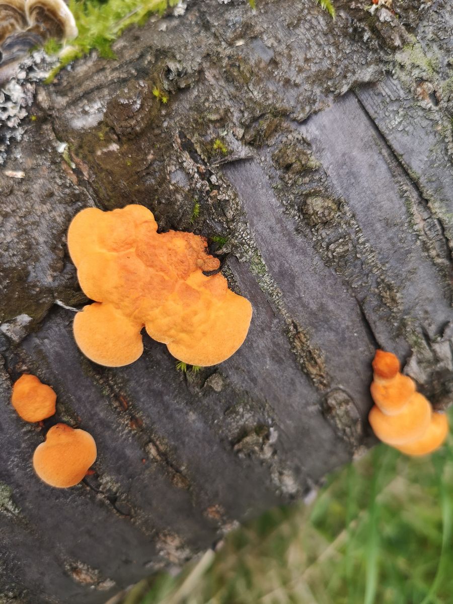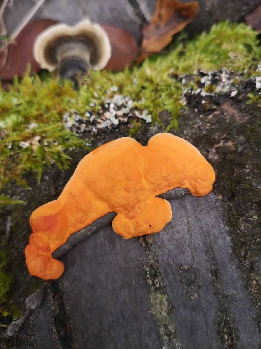 Hallo, diese Fruchtkörper fand ich auf einer Ziermandel (Totholz), neben Schmetterlingstrameten. Größe: 2-6 cm Geruch: unspezifisch Sehr elastisch, kaum zerreißbar. Könnte das der nördliche Zinnoberschwamm sein? Was meint ihr? Lieben Gruß und Danke! Nika
