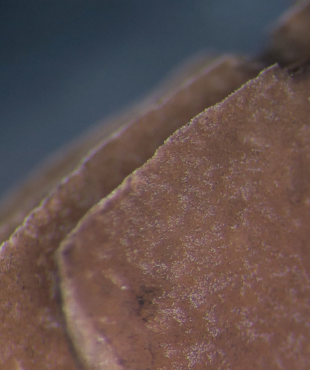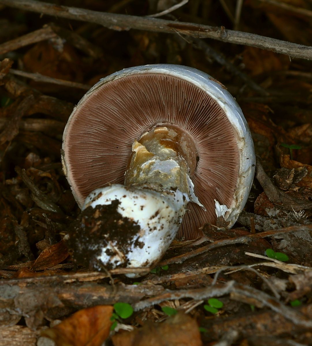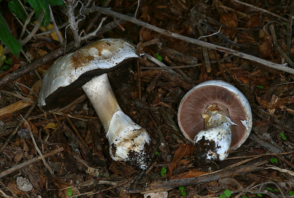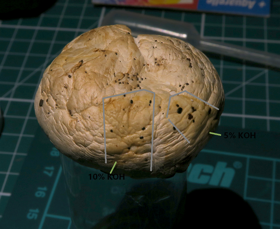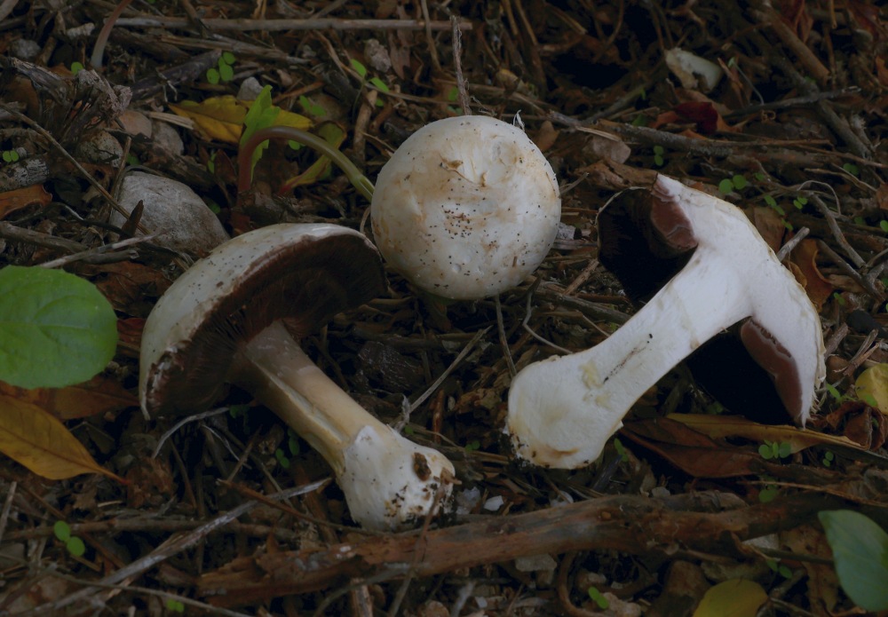 I found fruiting bodies of Agaricus sp. on leaf litter and twigs below Pomegranate trees in a shaded and humid place. Slicing or bruising did not produce any significant colour change. The scent was interesting as it was slightly foetid (like millipedes) and I am usually used to scents of anise, ink, mealy, or good-scented mushroom scents with Agaricus sp. The ring was not well developed. The spore print was moderate brown (not dark) like, milk-chocolate. The spores were small with an eccentric apiculum. The cheilocystidia were hard to see, and if what I seen are Cheilocystida, they were clavate with large vacuoles. Basidia 2- 3- and 4- sporous. Under the stereomicroscope I saw glistening white elements on the sides of the lamella which may be pleurocystidia.