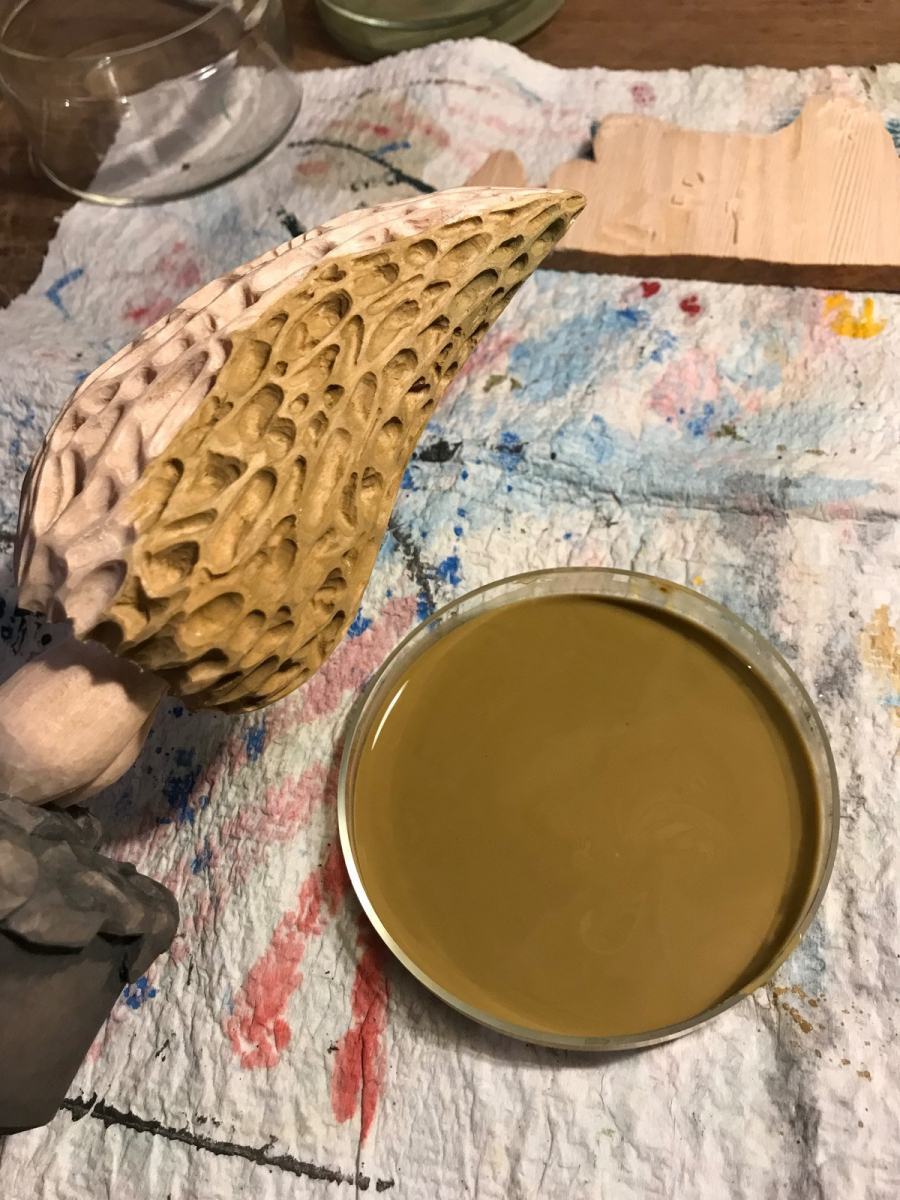 Anschließend wird lackiert. Da ich selbst noch nie eine Morchel angemalt habe, war ich ganz froh, das ich zu diesem Zeitpunkt auch meine Morchel fertig, aber nicht angemalt hatte. So konnte ich an meiner üben und probieren, und dann bei Tuppie auftragen.
