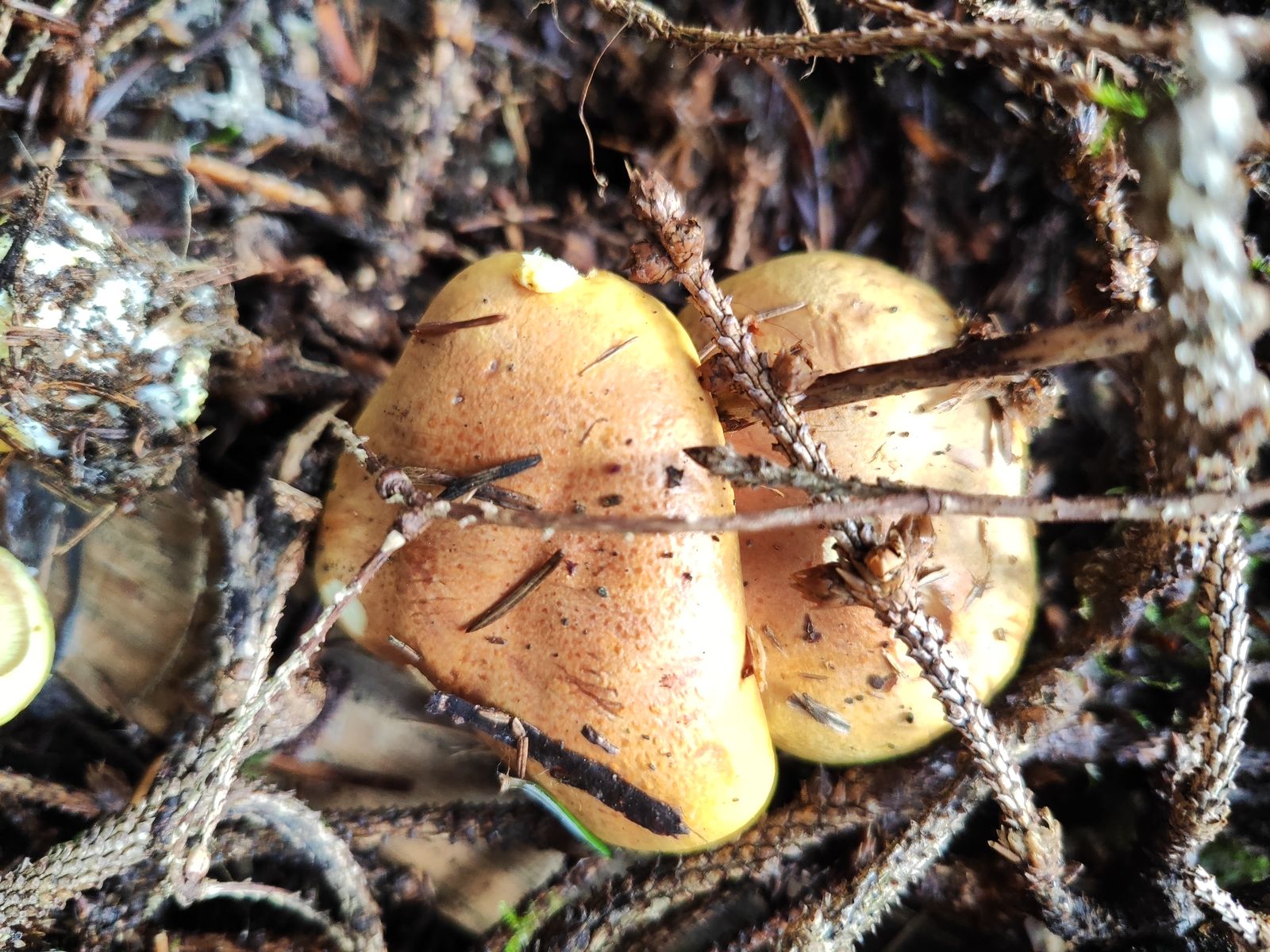 Unter der gleichen Lärche weitere Massen des grauen Lärchenröhrlings.