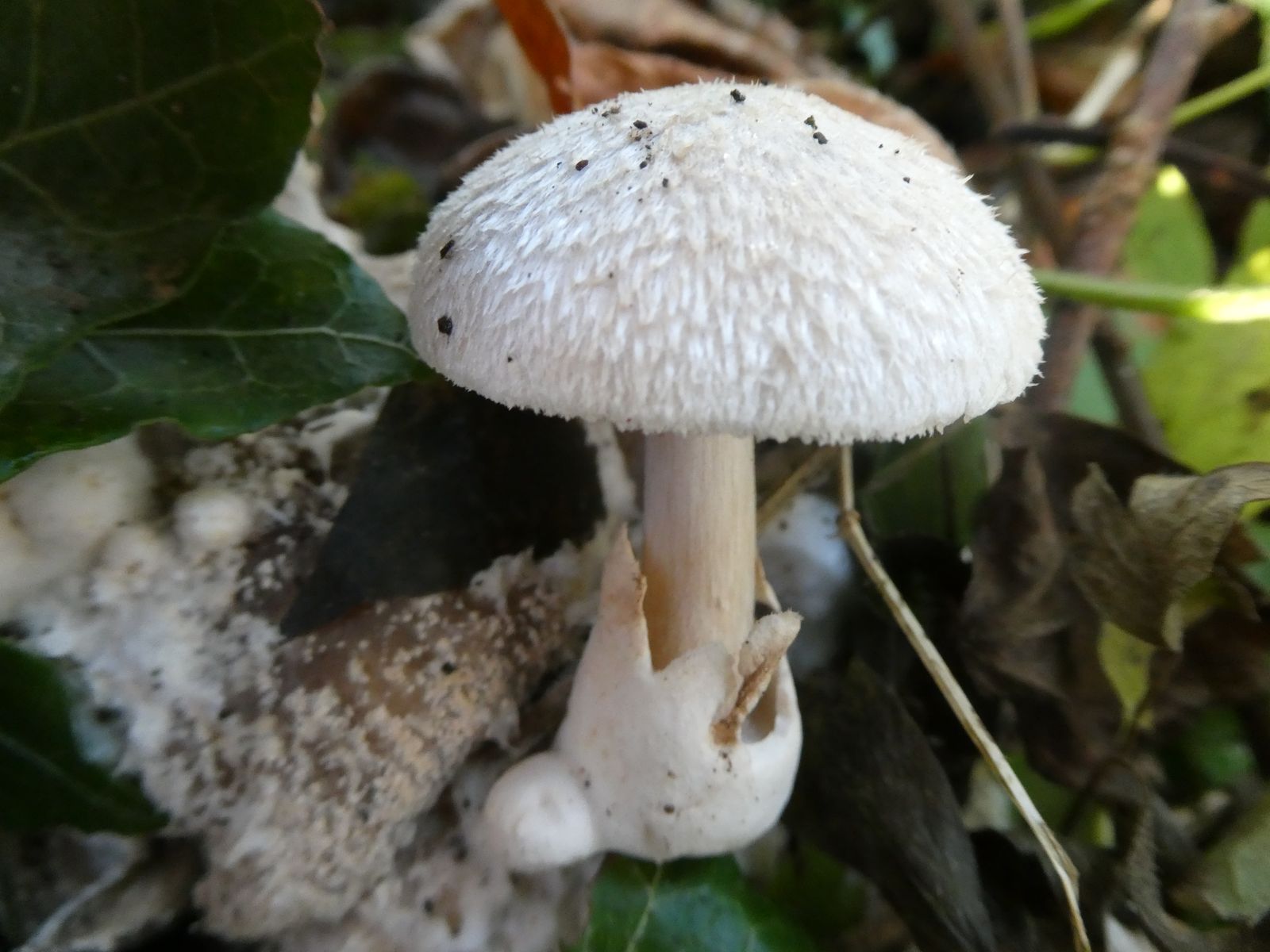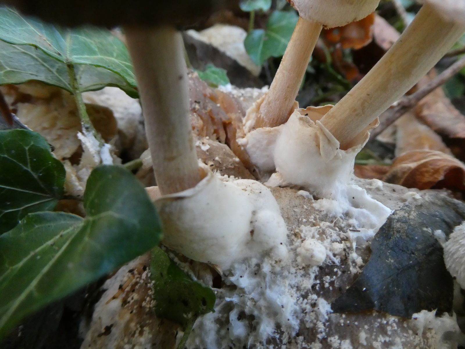 Jedesmal waren mehrere Nebelkappen befallen also Linien. Die Nebelkappen waren so tief kurzstielig unter Efeu und Laub, daß nur Volvariella zu sehen war.