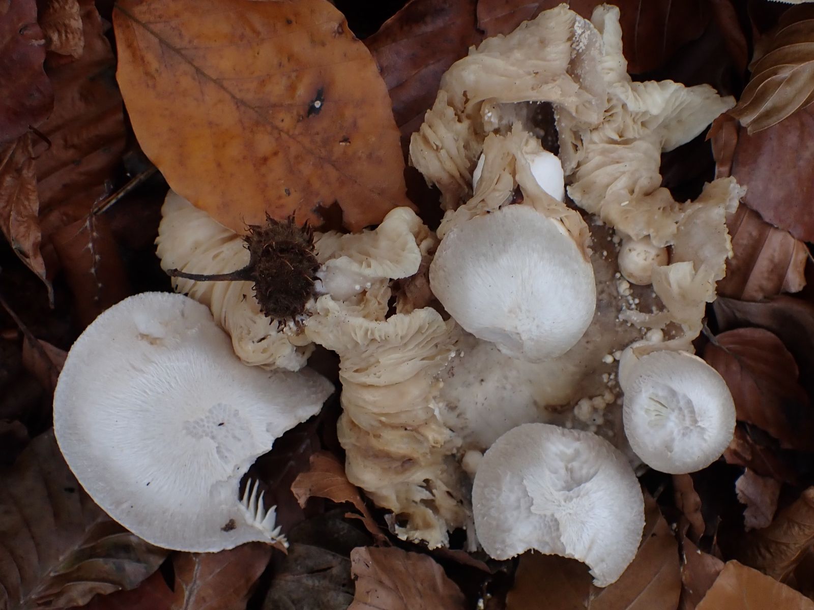 Jedesmal waren mehrere Nebelkappen befallen also Linien. Die Nebelkappen waren so tief kurzstielig unter Efeu und Laub, daß nur Volvariella zu sehen war.