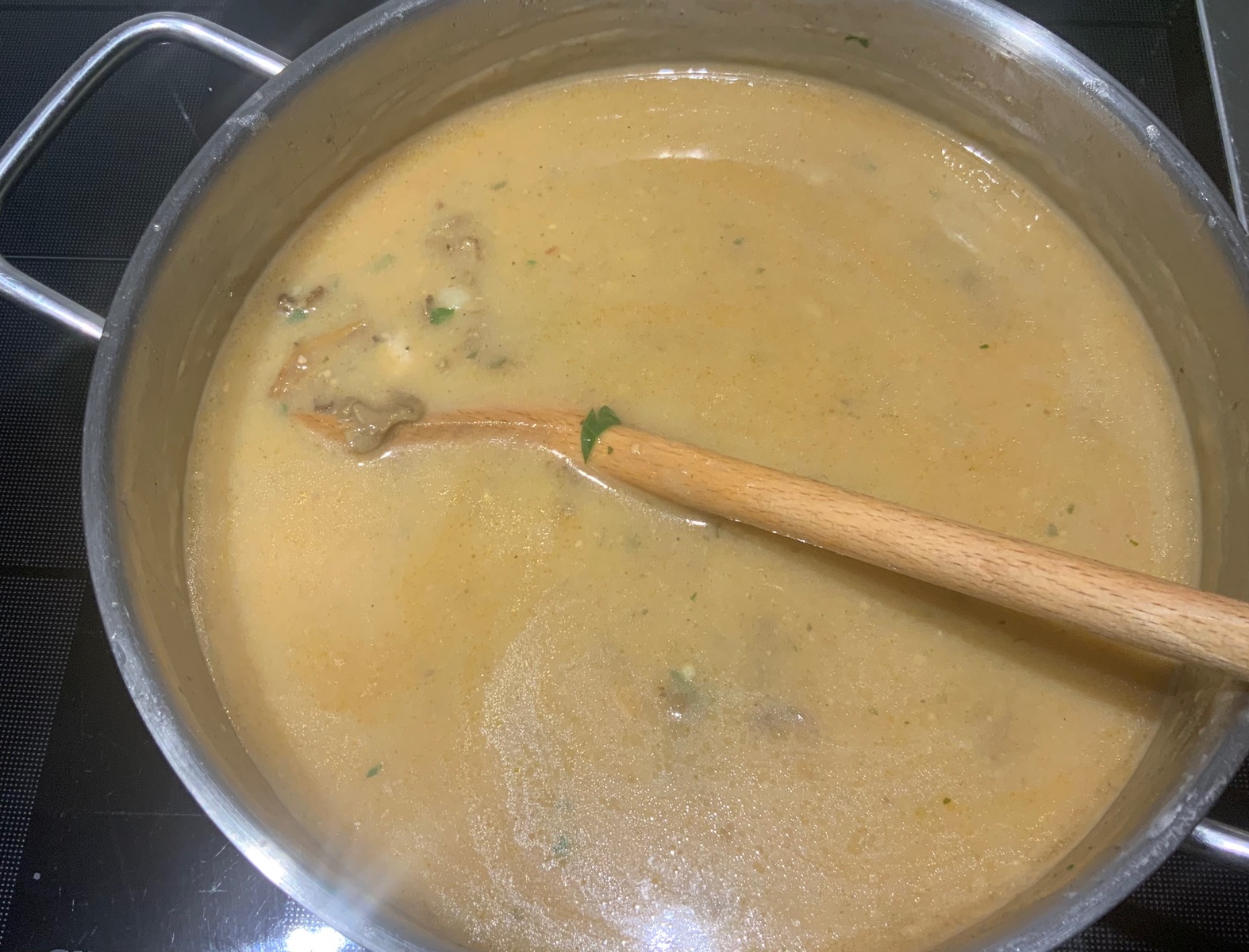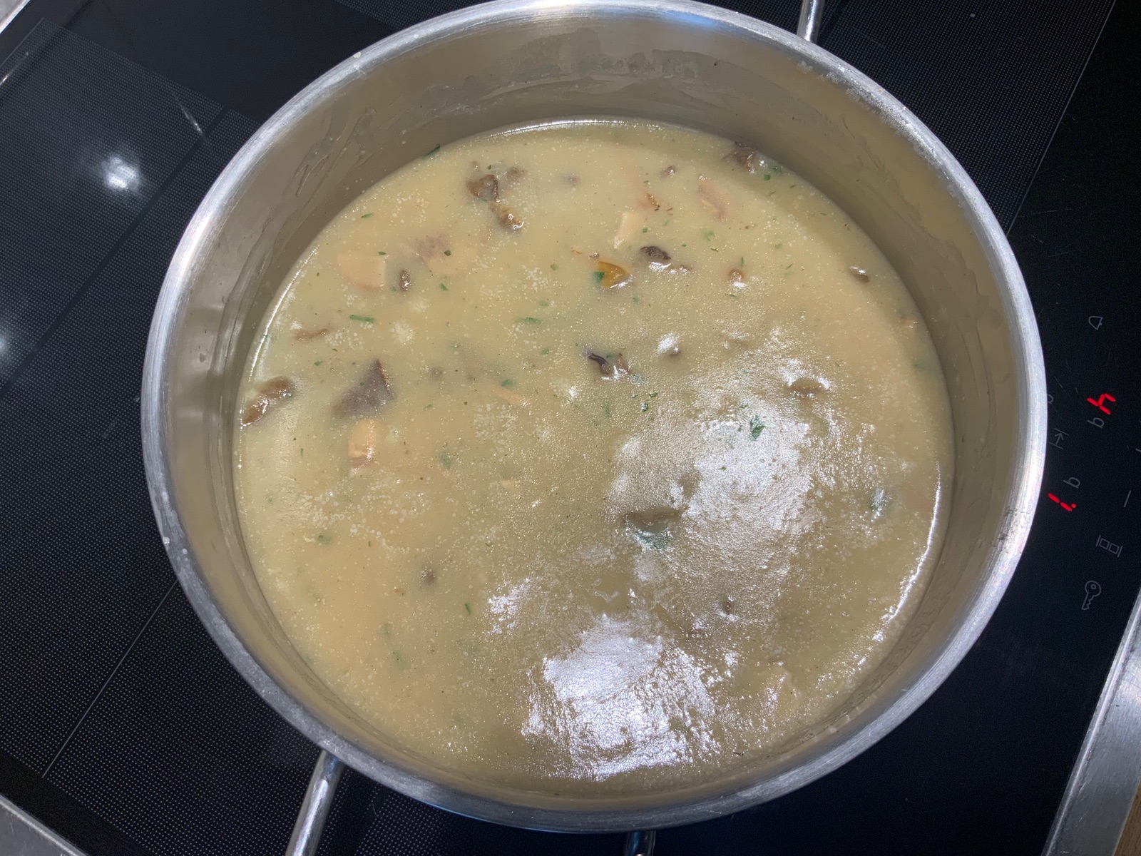 ist zwar noch nicht ganz Wochenende, aber ich habe die Pilzsuppe für morgen bereits vorgekocht. Frische und gefrostete Trompetenpfifferlinge, ´ne ordentliche Ladung gerade gemahlenes Pilzpulver aus getrockneten Steinpilzen und Maronen, Butter, Mehl, Schalotten, Knobi, Zitronensaft, Tomatenmark, Kalbsfond, Wasser, Salz, Pfeffer und frische Petersilie.