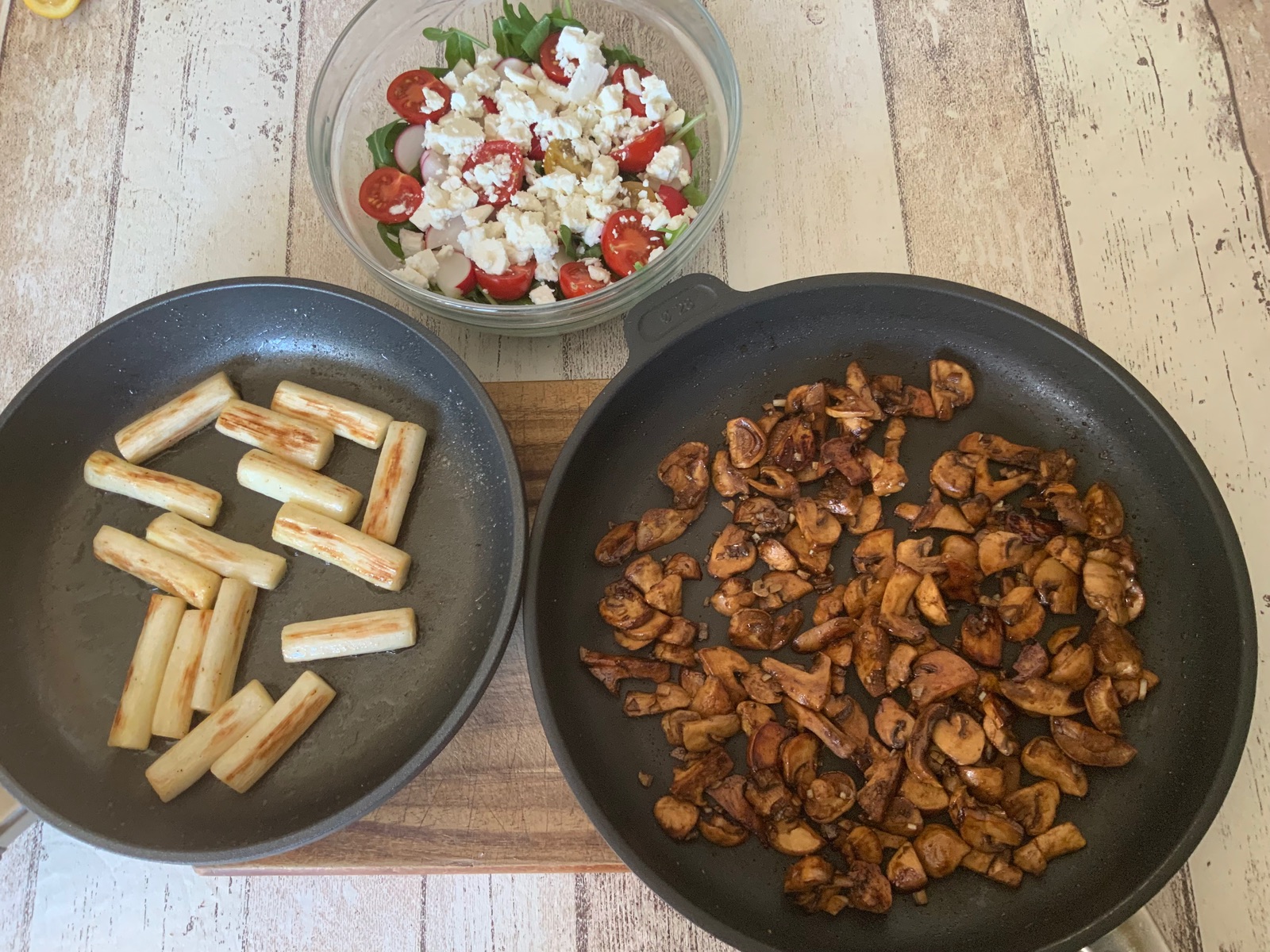 Mit Balsamico-Honig und Knoblauch glasierte Maipilze und ein paar Zuchtchampis aus der Manufaktur Rostocker Heide. Abgewürzt mit einem Spritzer Zitrone, Salz und Pfeffer.