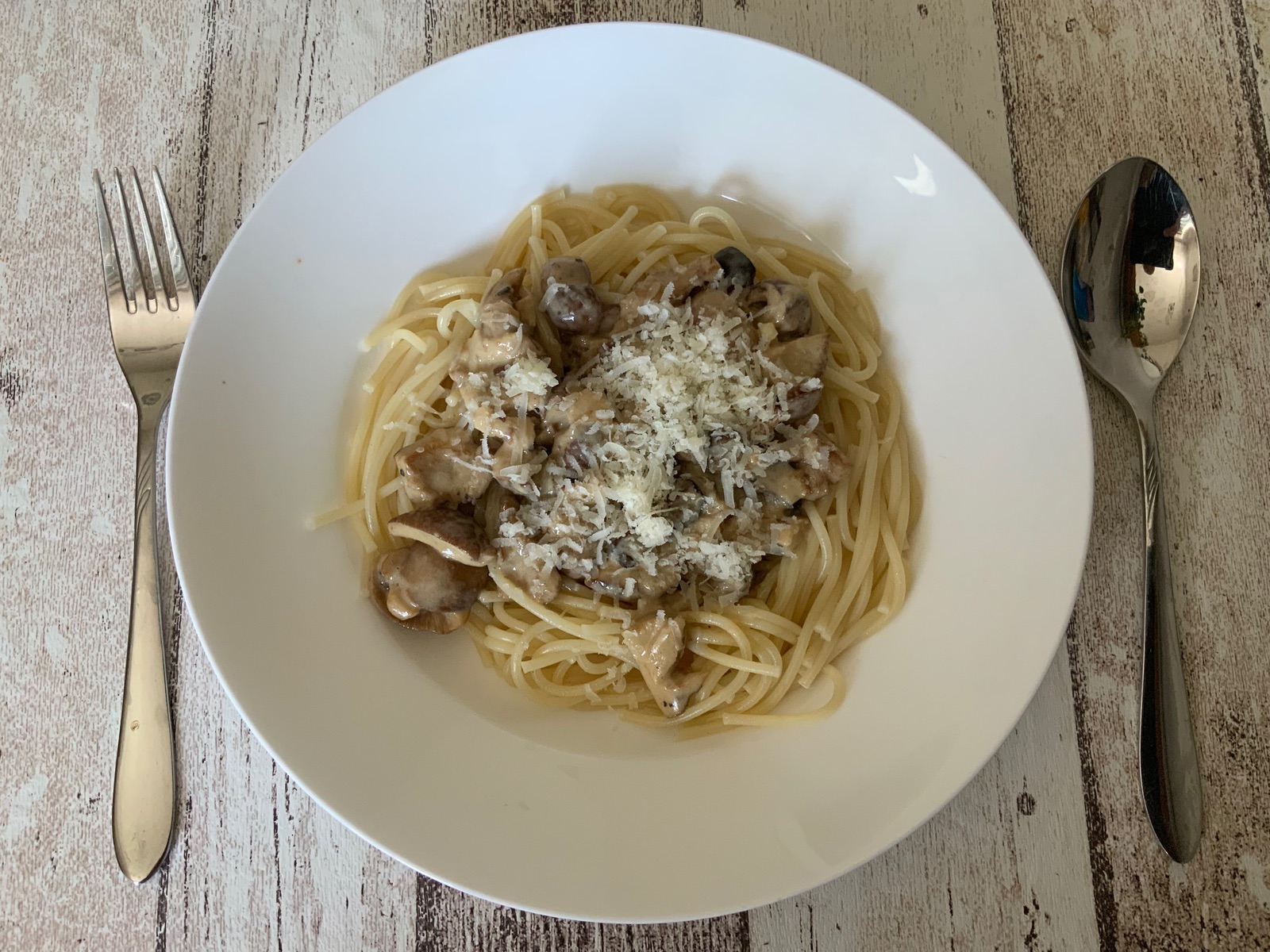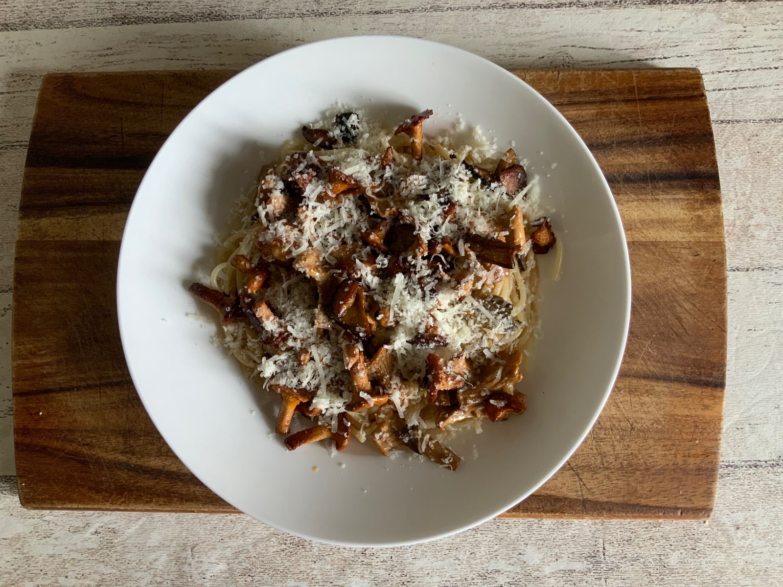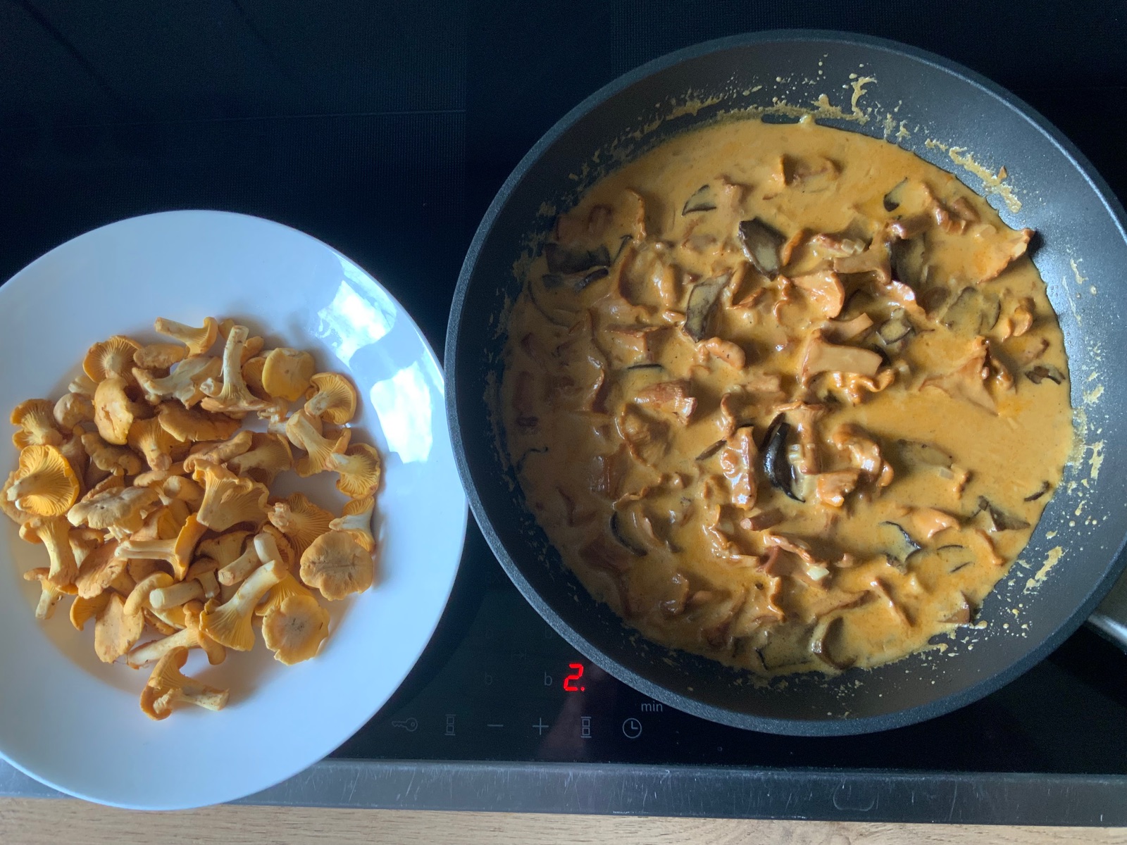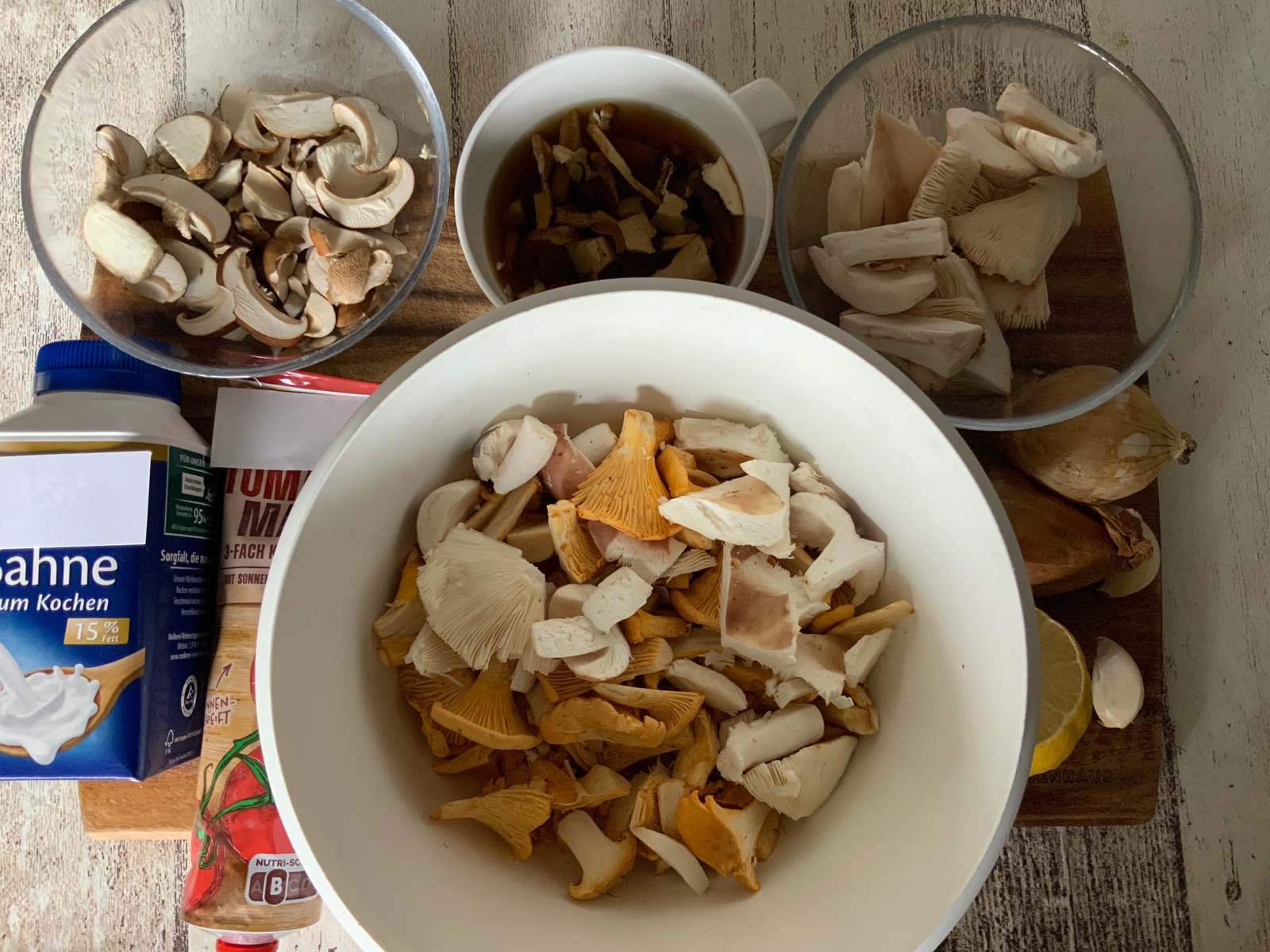 heute gab es eine leckere Pasta mit frischen Steinis, Flockenhexen und ein paar Täublingen. Die angebratenen Frischpilze wurden mit 2 gehackten Knobizehen, etwas Zitrone, einem Klecks Tomatenmark, Salz und Pfeffer abgewürzt und mit einem Tässchen eingeweichter Trockensteinpilze samt Kochsahne abgelöscht. Ein Hauch Cayenne durfte auch nicht fehlten.