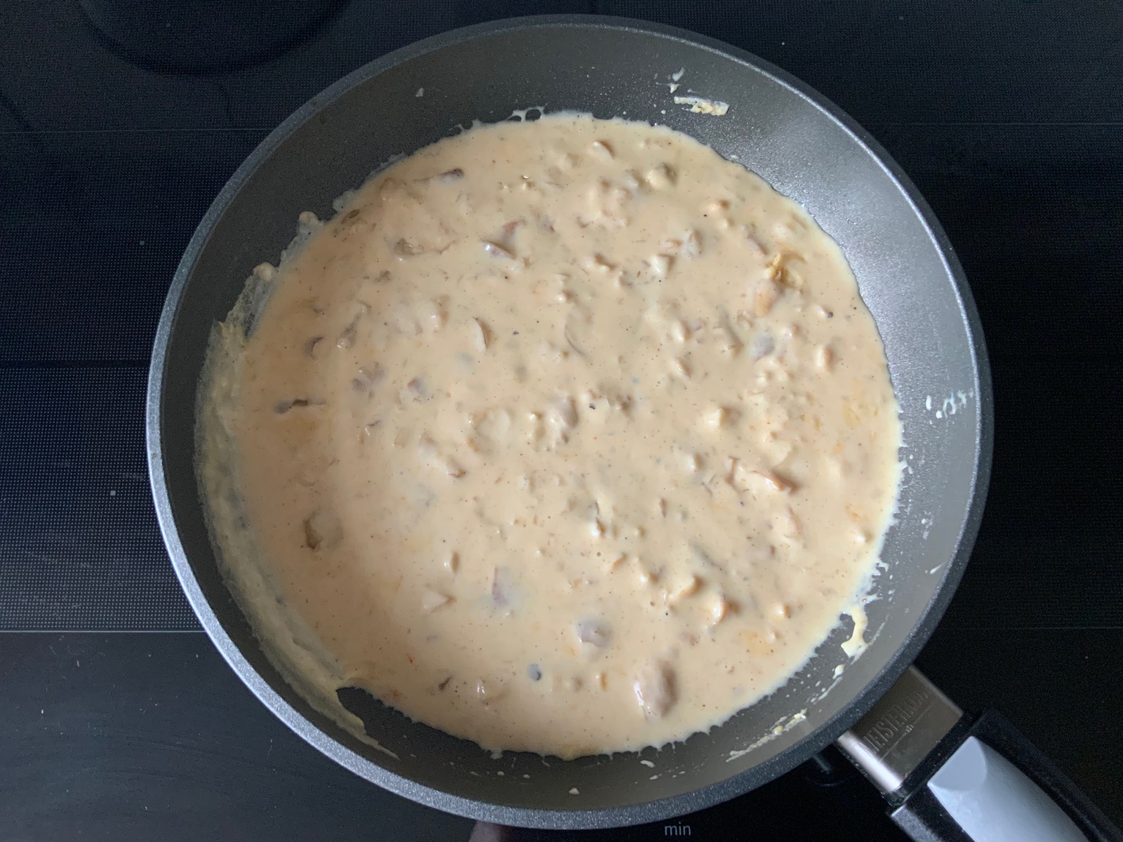 Mit dabei sind eine Schalotte, zwei Knobizehen, Chilli-Knobipulver, Salz, Pfeffer, der Saft einer viertel Zitrone, ein Päckchen Kochsahne, ein großer Esslöffel Schmelzkäse light und etwas Pfifferlingspilzpulver.