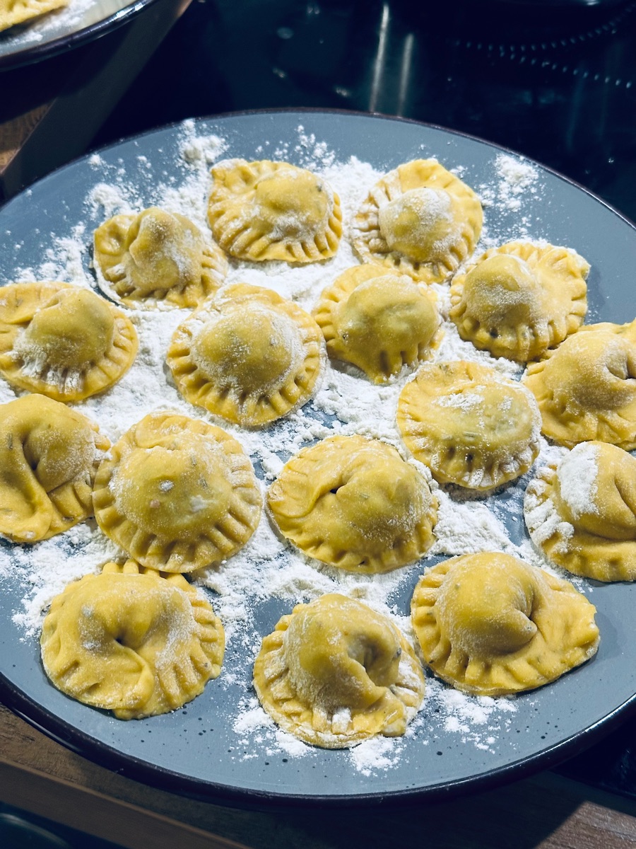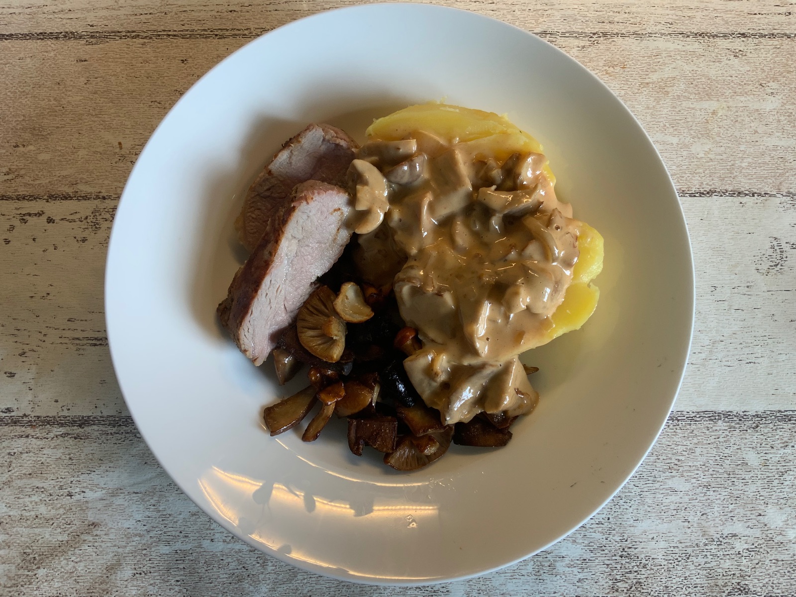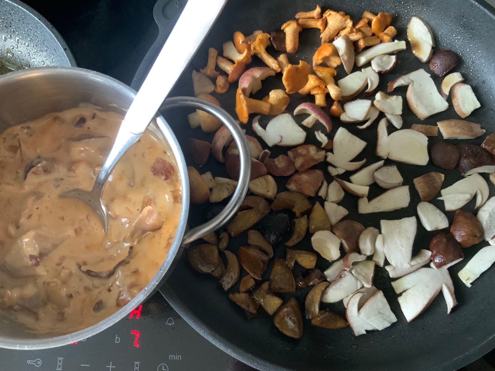 Teigtaschen mit einer Rindfleisch Füllung /Pfifferling-Maronen Sauce und einer gemischten Pilzpfanne ( Steinpilze, Goldröhrlinge,Kuhröhrlinge,Maronenröhrlinge und Rosa-Rote Lacktrichterlinge (nur die Hüte von denen)