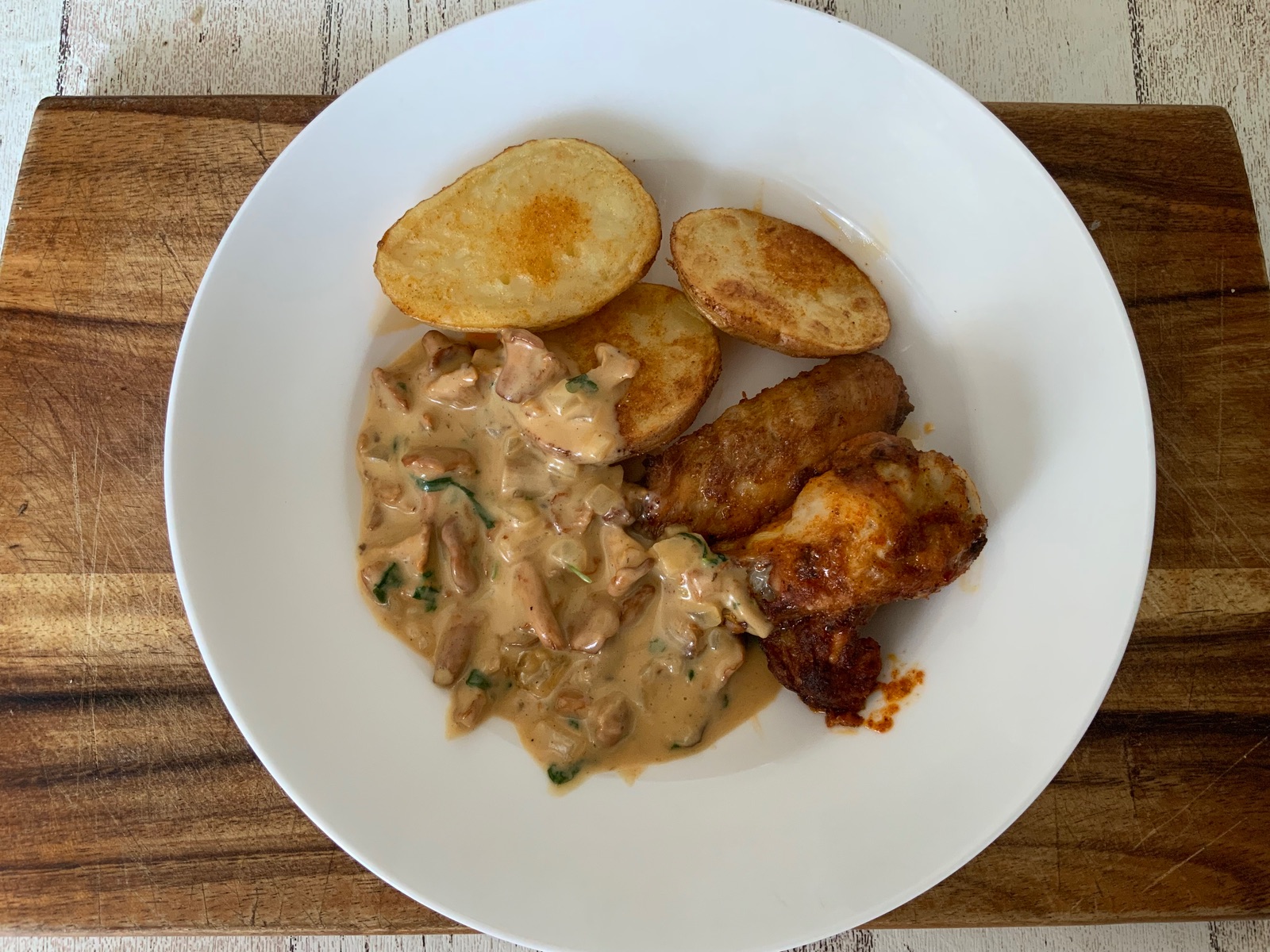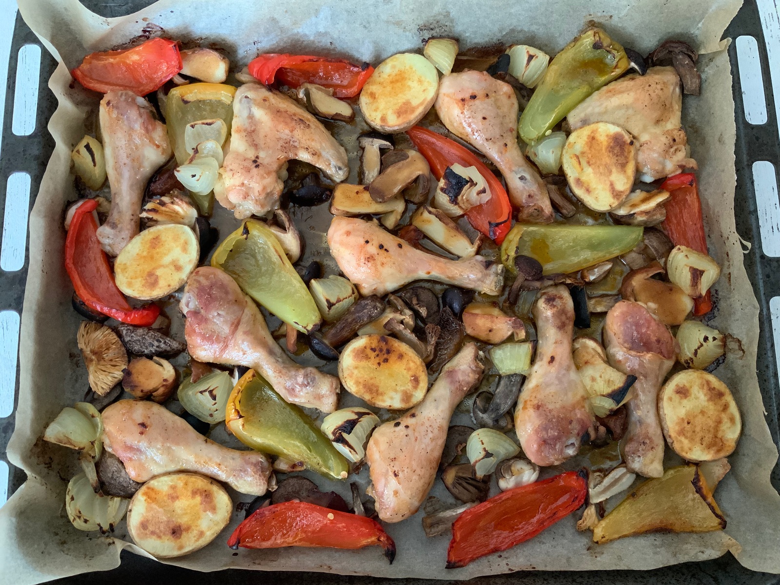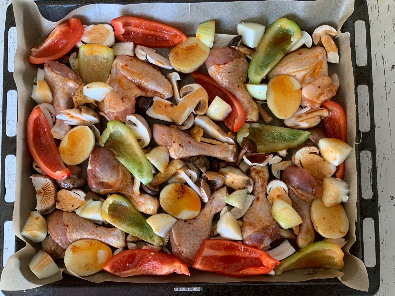 heute gab es Paprika-Hühnchen (über Nacht in scharfer Paprikamarinade eingelegt), Pilze (Steinpilze, Maronen, Perlpilze, Reifpilze, Täublinge, Pfifferlinge, Birkenpilze), Paprika, Zwiebeln, Kartoffeln mit guter, würziger Ölmischung bestrichen aus dem Ofen.