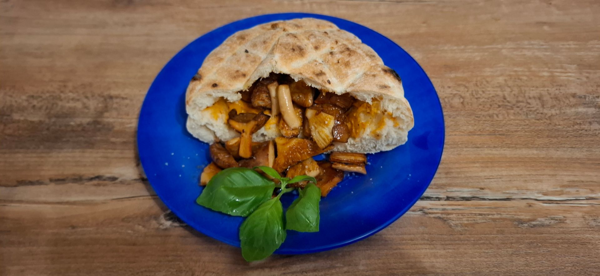 Salat, nicht nötig. Das Innere habe ich mit einem roten Pesto mit Walnüssen bestrichen, die Reizker und die Täublinge in Butter gebrutzelt, pur ohne Salz.