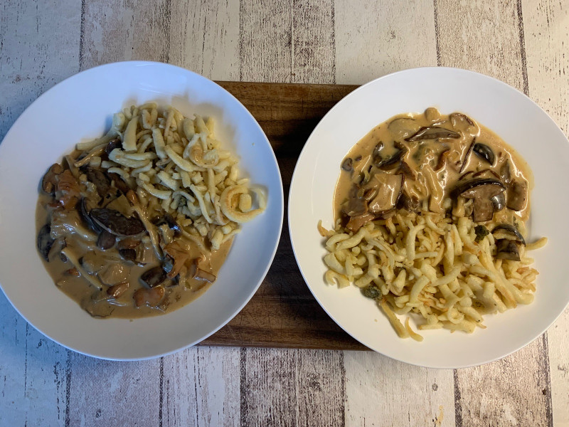 Salat, nicht nötig. Das Innere habe ich mit einem roten Pesto mit Walnüssen bestrichen, die Reizker und die Täublinge in Butter gebrutzelt, pur ohne Salz.