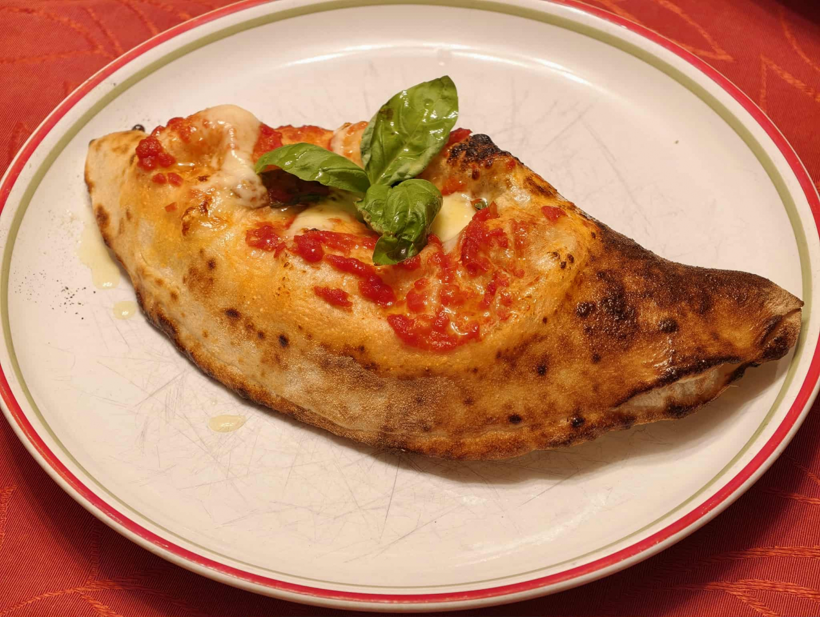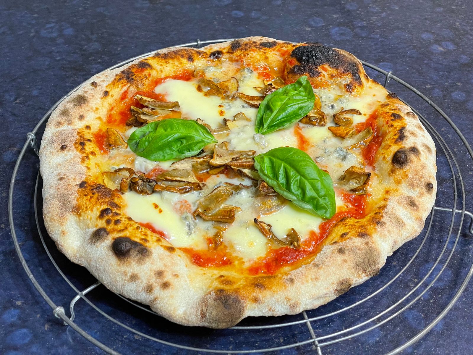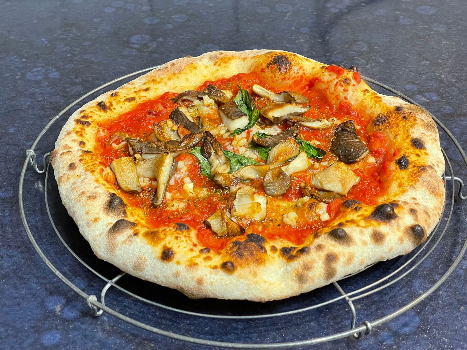 Herbsttrompeten, Frischkäse und Tiroler Speck. Bei der neapolitanischen Calzone kommen Mozzarella und Tomatensauße oben drauf auf einen Einschnitt, was verhindert, dass sich die Tasche zu stark aufbläst.